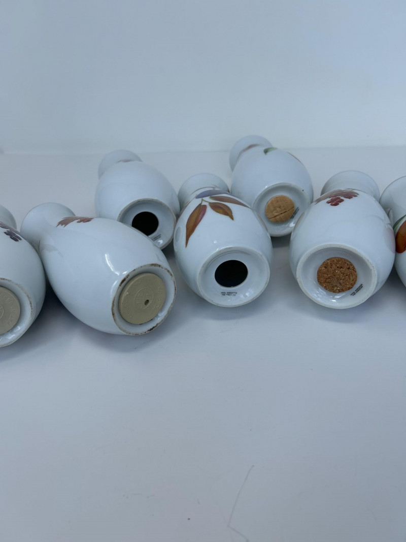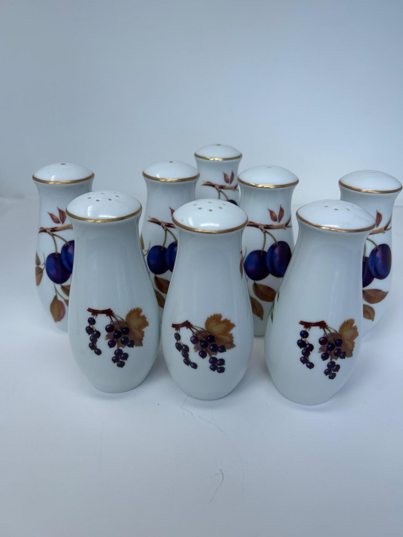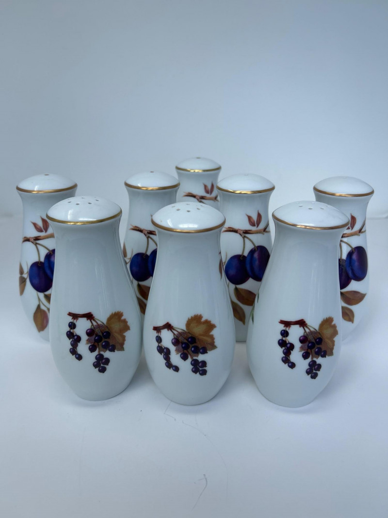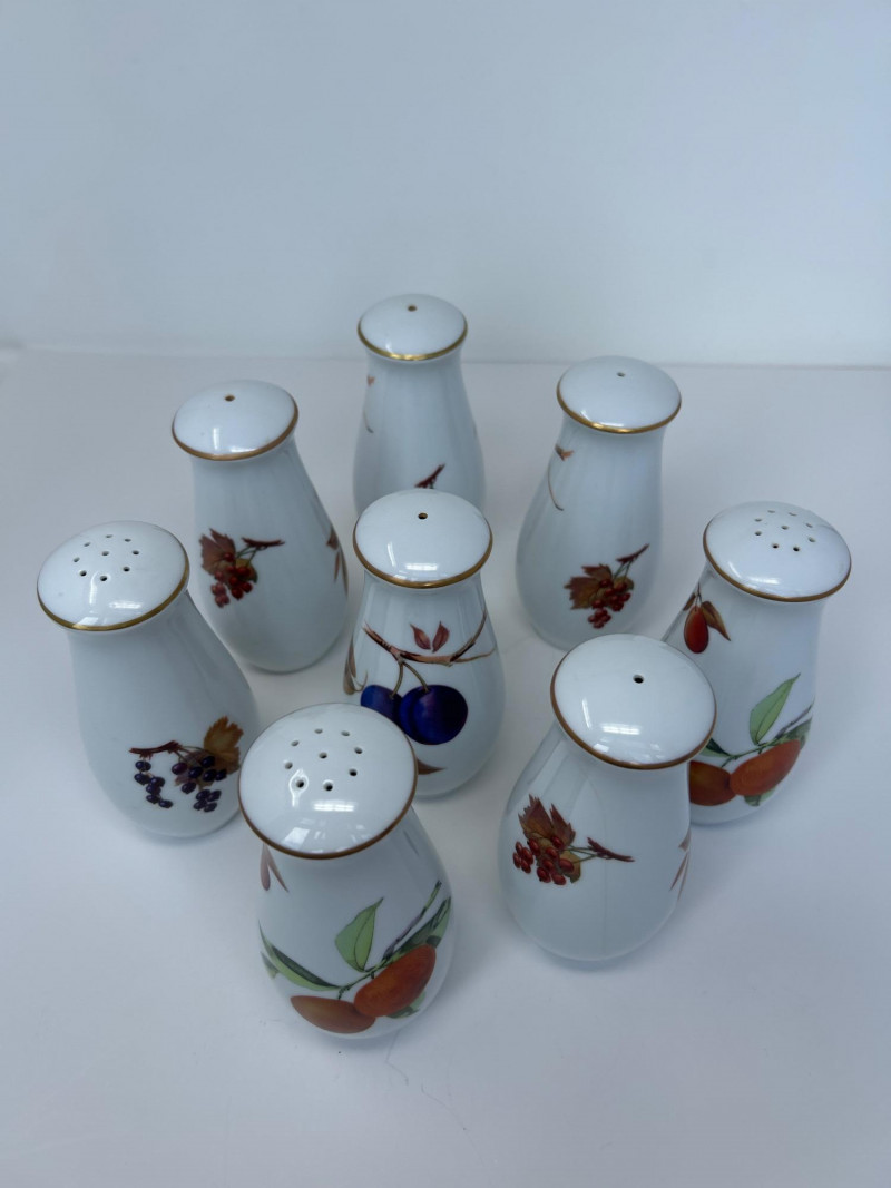 Royal Worcester Evesham Gold Oversized Salt & Pepper Shakers Evesham Gold edge fine porcelain salt and pepper shakers by Royal Worcester. Oversized form with fruit motifs and gold trim. Set includes 5 pepper shakers and 3 salt shakers Height: 6 inches Two shakers missing stoppers One shaker has a vertical mark (see last photo)