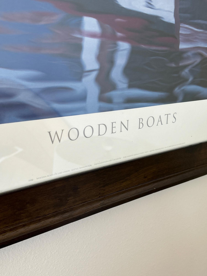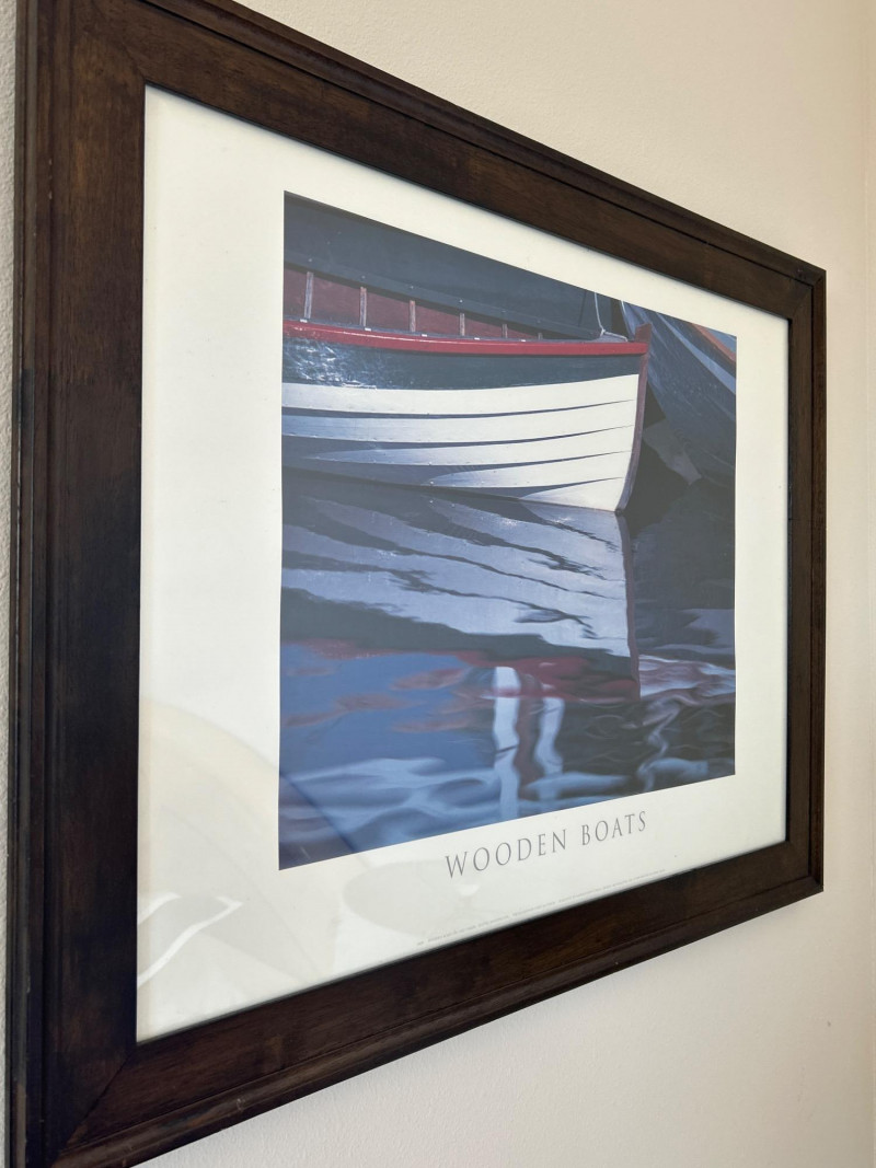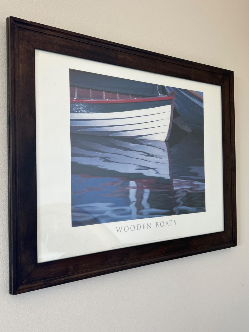 Framed Wooden Boat Print "Wooden Boats" – 28" x 21" Photographic print depicting the side view of wooden boats and their reflections in water. The image is titled "WOODEN BOATS" beneath the print. Presented in a dark wooden frame with a white mat. Measurements: