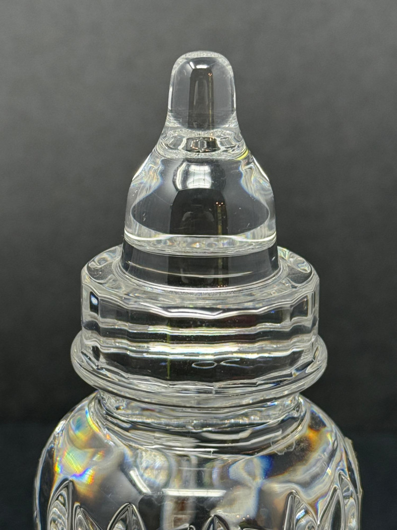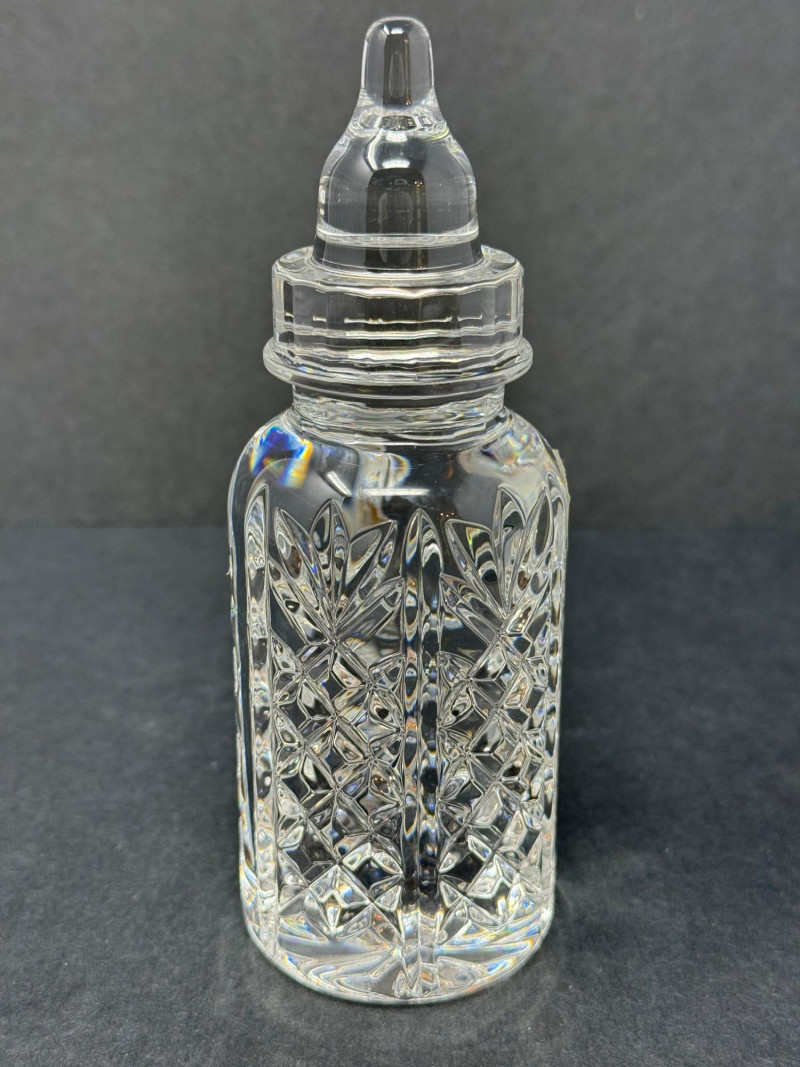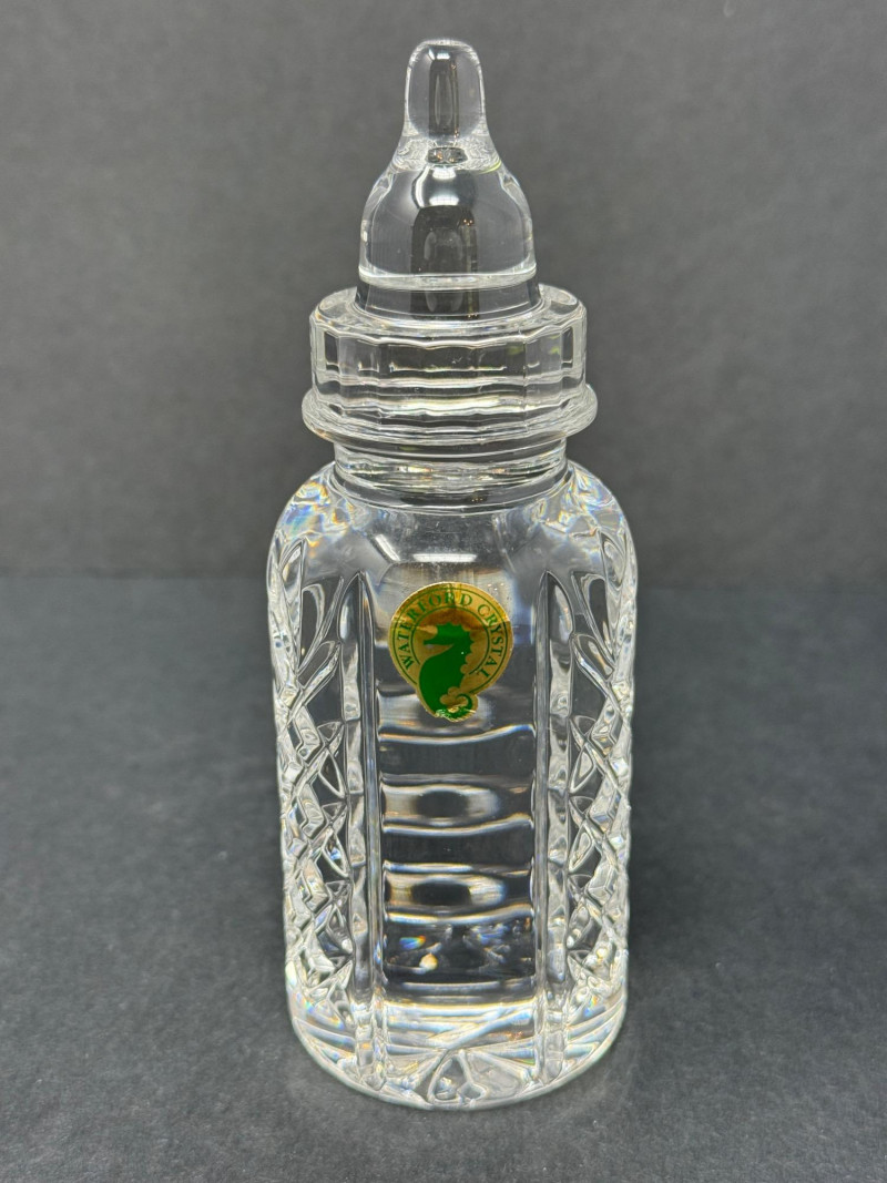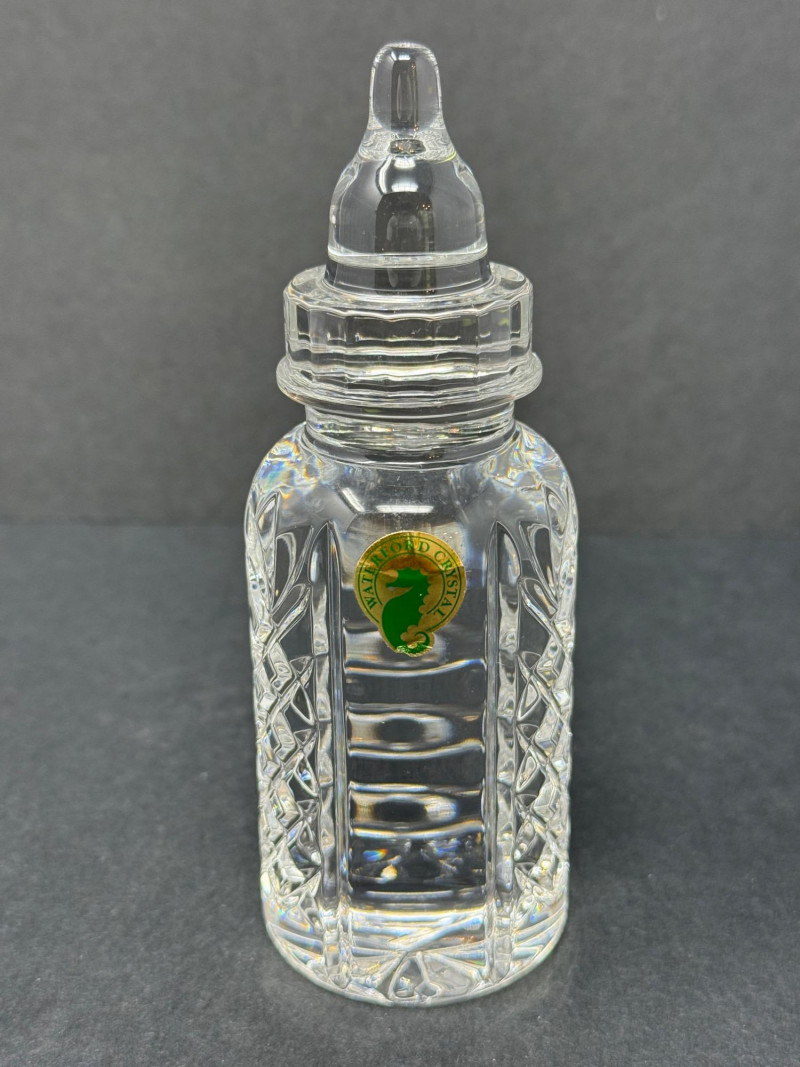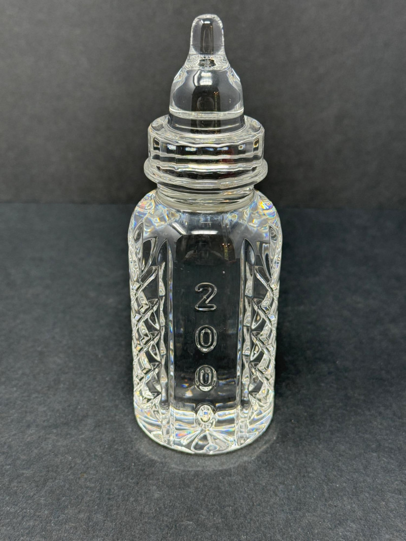 Waterford Year "2000" Crystal Baby Bottle Vanity - 6" H Clear crystal baby bottle vanity item from Waterford, marked with the green and gold seahorse label. Made to commemorate the year 2000. Measurements: