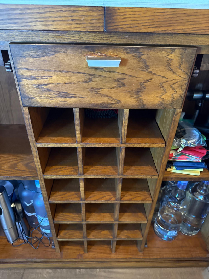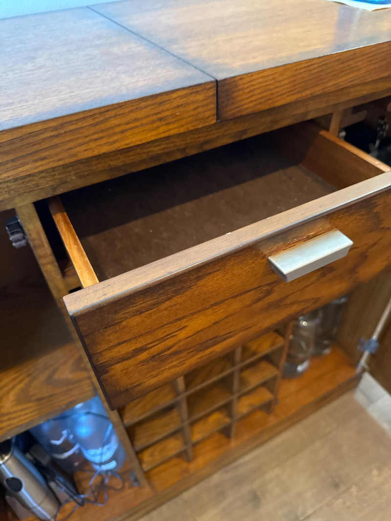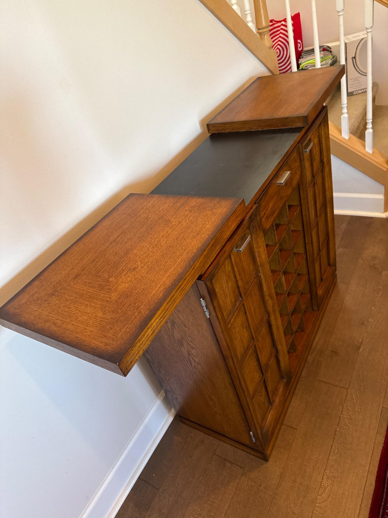 Expandable Wood Wine Bar Cabinet with Storage Wooden wine bar cabinet featuring a retractable top that slides open to provide an extended surface for serving. The center includes a grid-style wine rack, a drawer for accessories, and dual side doors for additional concealed storage. Measurements: Closed: 40" L x 15" D x 38" H Open: 59" L x 15" D x 38" H