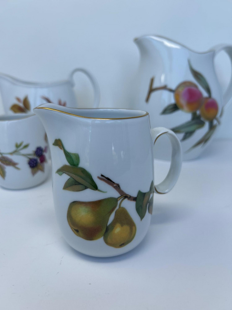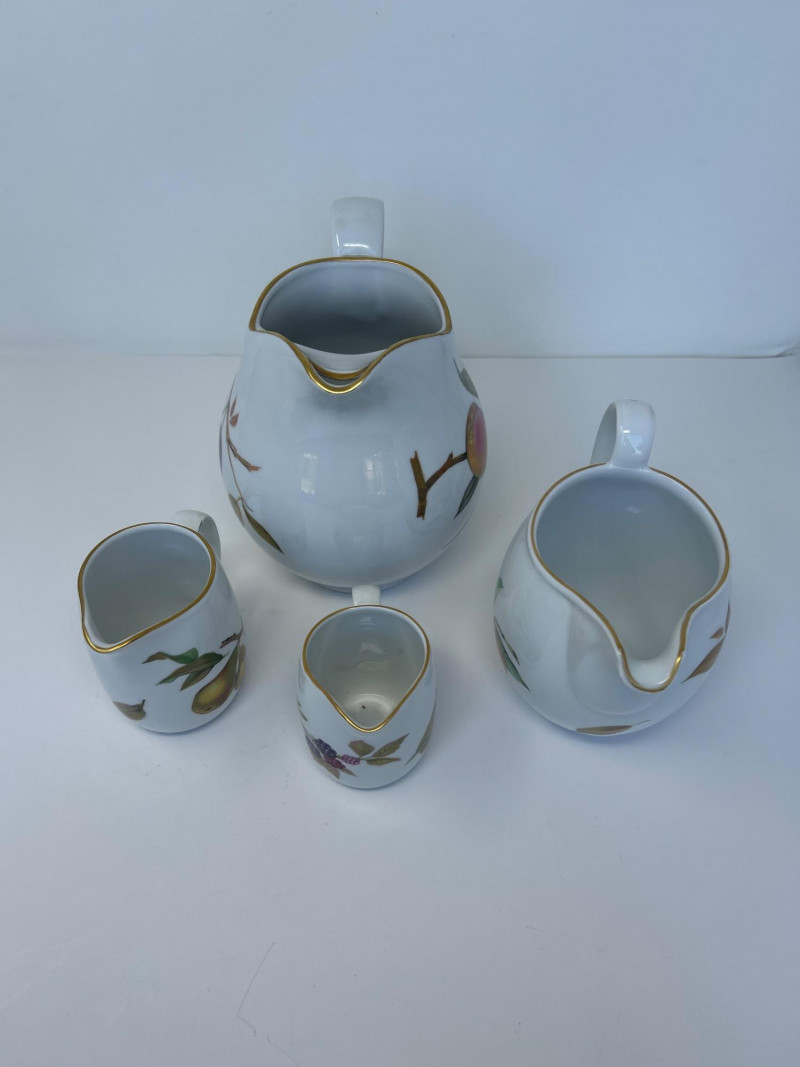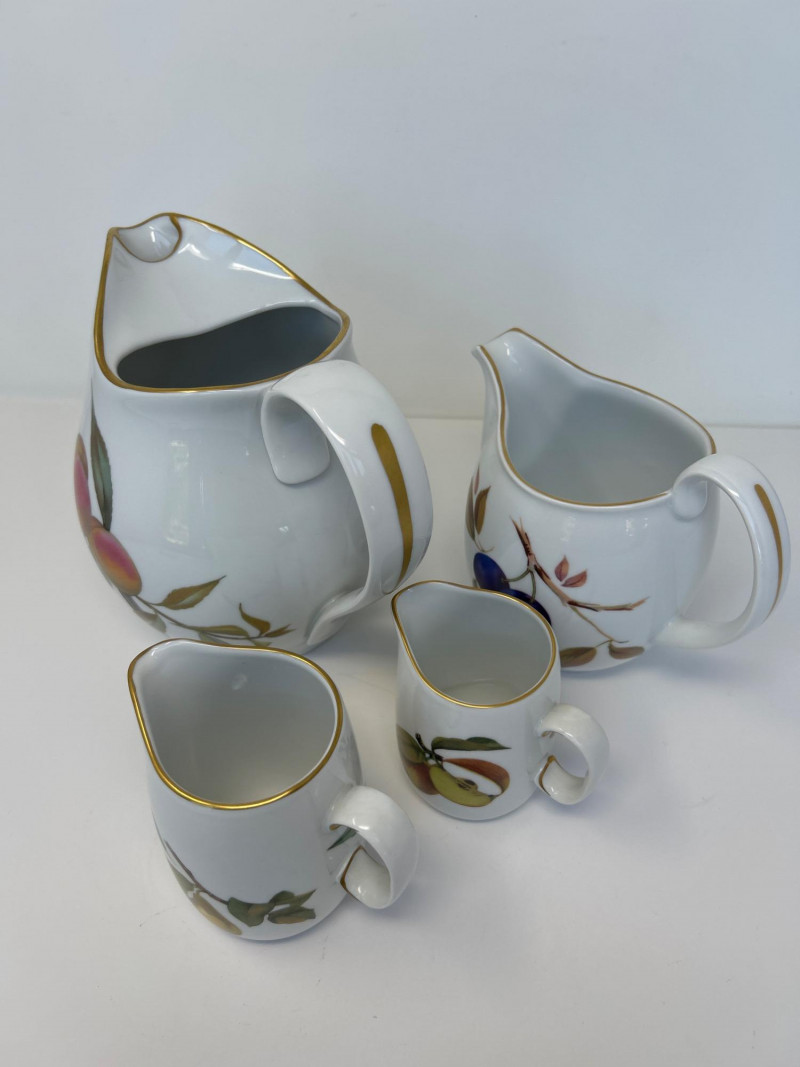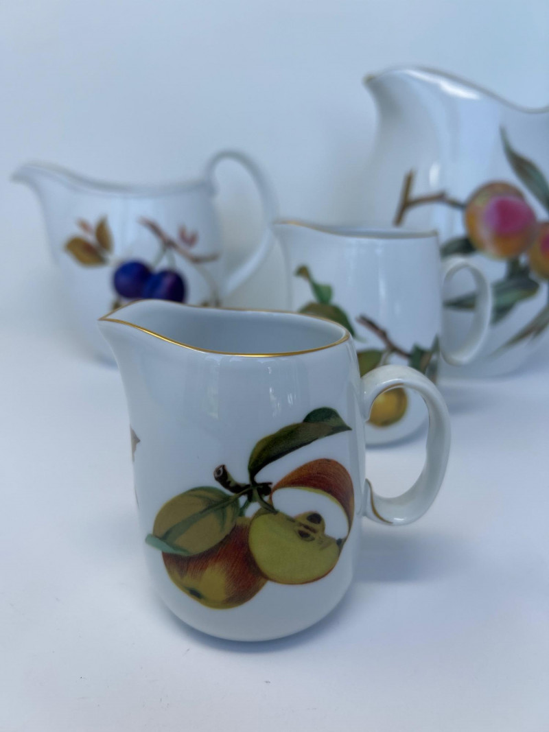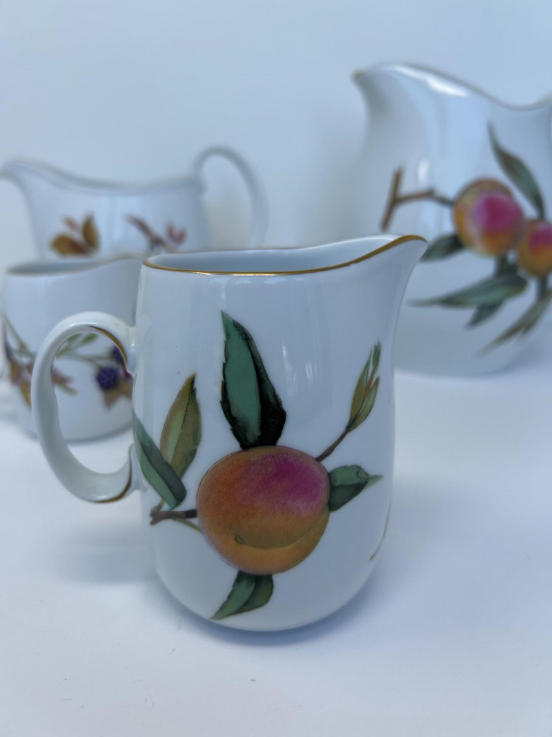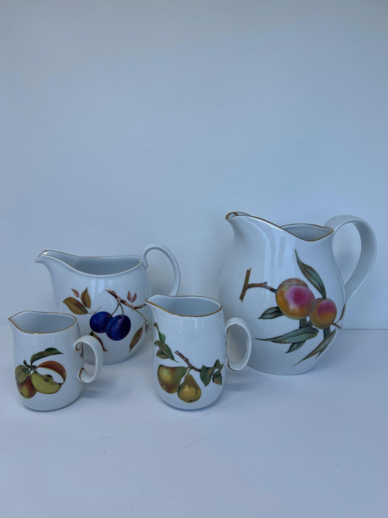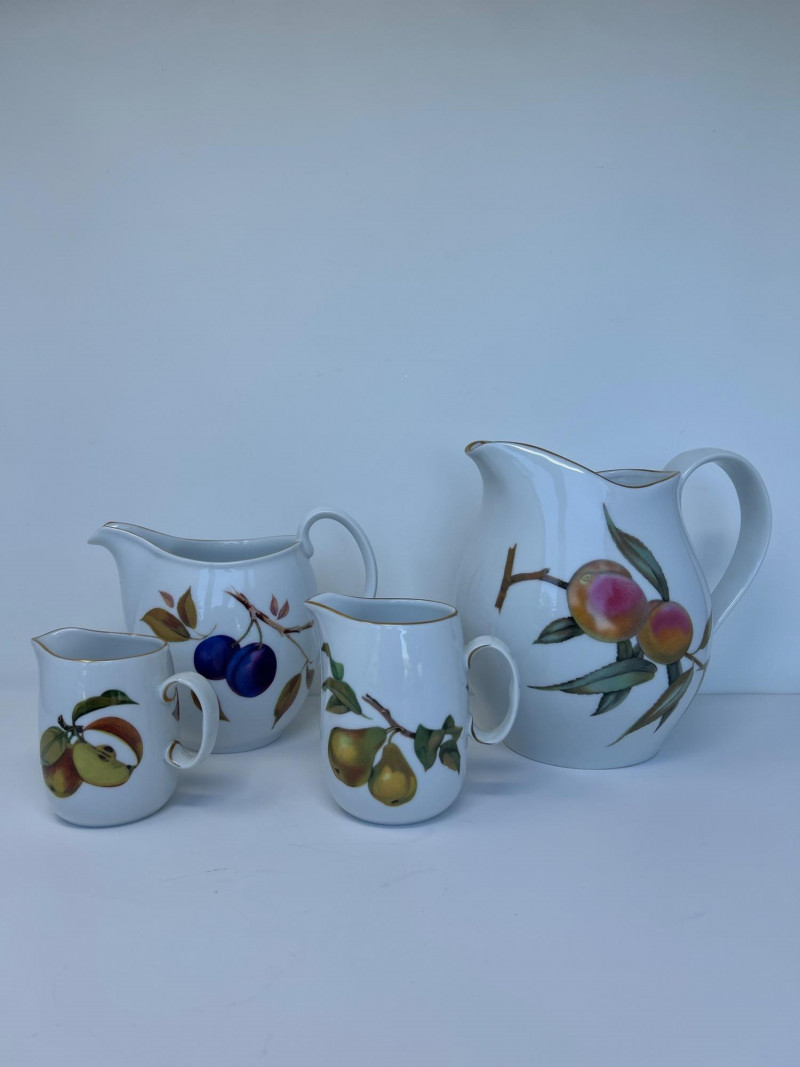 Set of Four Royal Worcester Evesham Gold Carafes Set of four fine porcelain carafes by Royal Worcester in the Evesham Gold pattern. Each features a unique hand-painted fruit motif—peach, plum, pear, and apple—and gold trim along the rim and handle. Heights range from 3.5" to 7.5" Pattern: Evesham Gold Material: Fine porcelain with gold trim Quantity: 4 carafes (various sizes) Maker: Royal Worcester, England