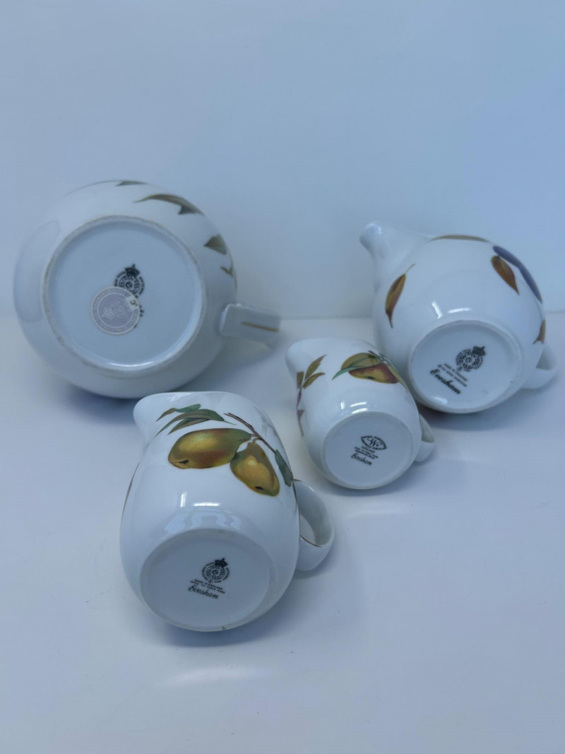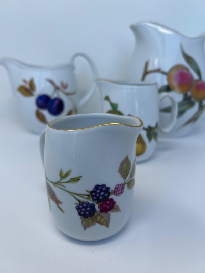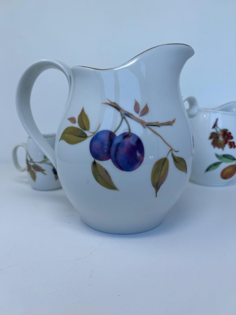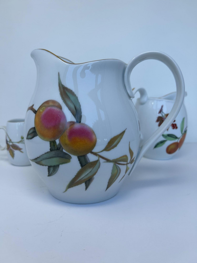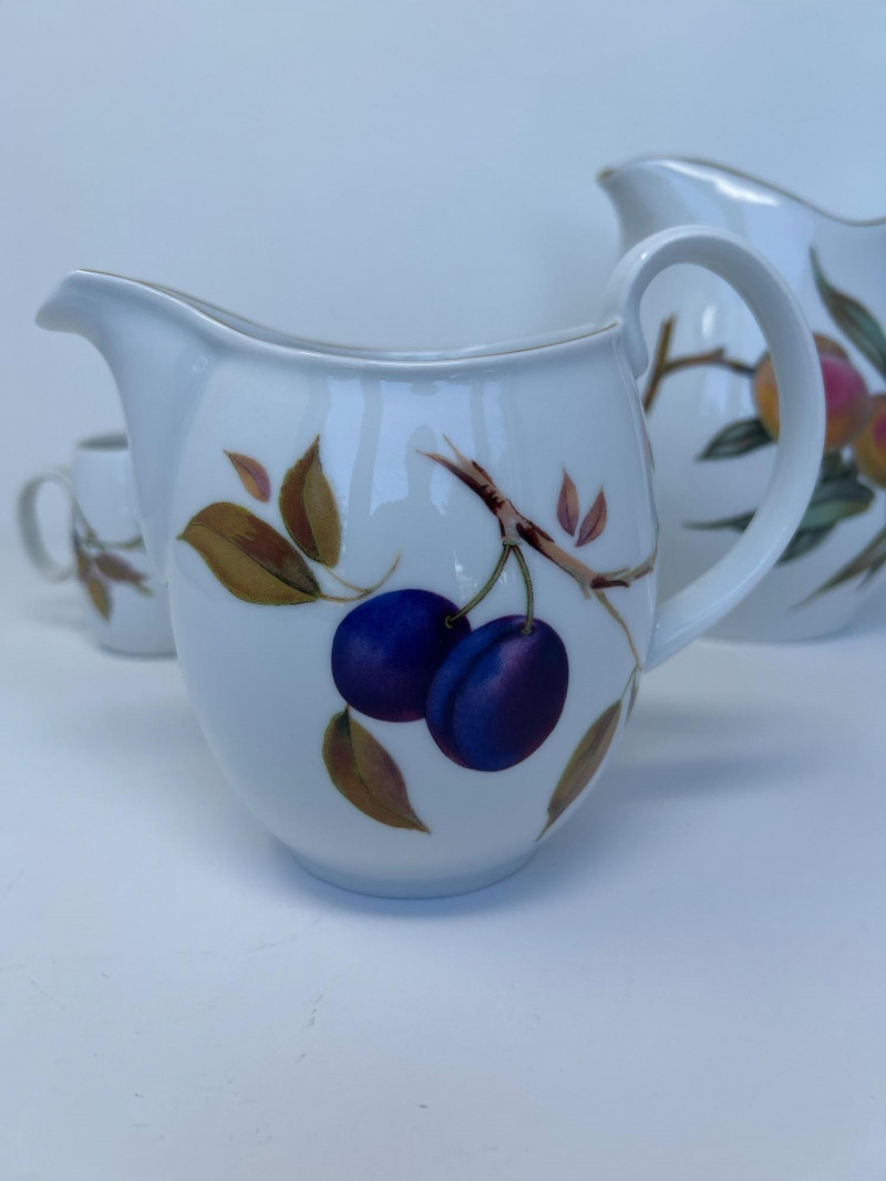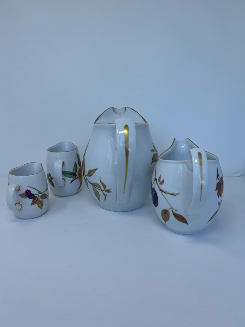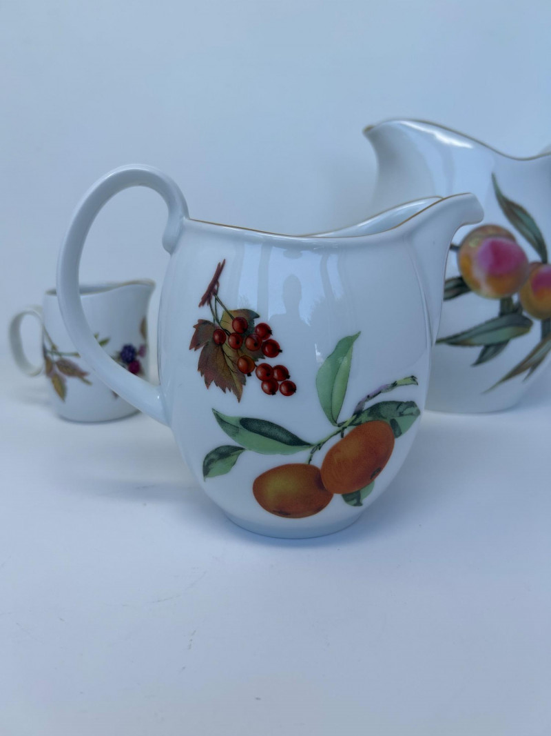 Set of Four Royal Worcester Evesham Gold Carafes Set of four fine porcelain carafes by Royal Worcester in the Evesham Gold pattern. Each features a unique hand-painted fruit motif—peach, plum, pear, and apple—and gold trim along the rim and handle. Heights range from 3.5" to 7.5" Pattern: Evesham Gold Material: Fine porcelain with gold trim Quantity: 4 carafes (various sizes) Maker: Royal Worcester, England