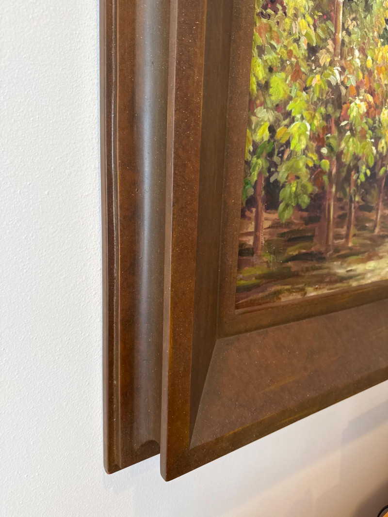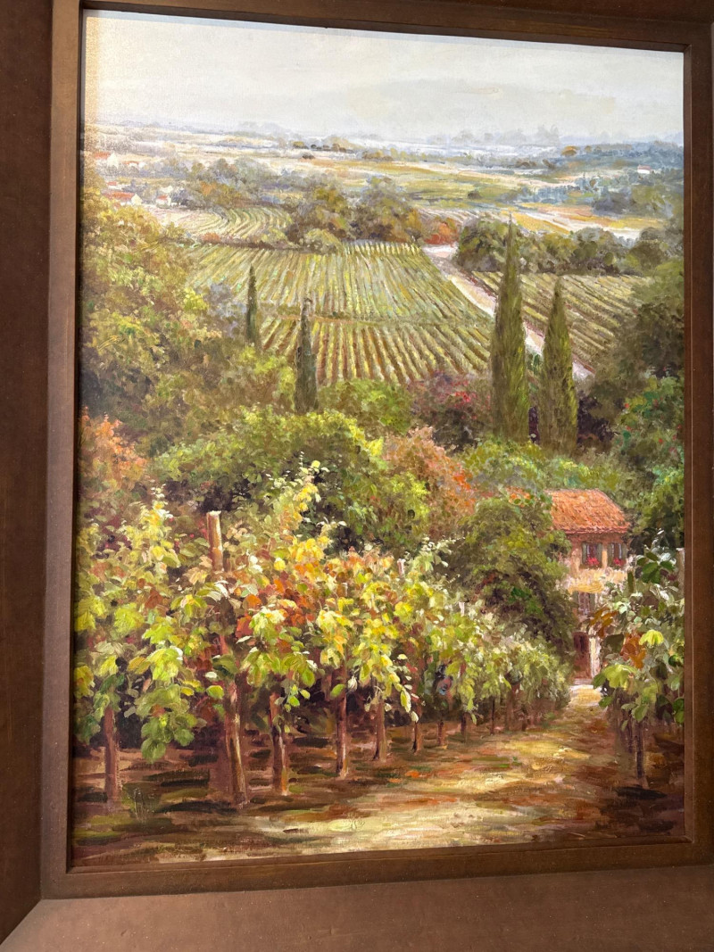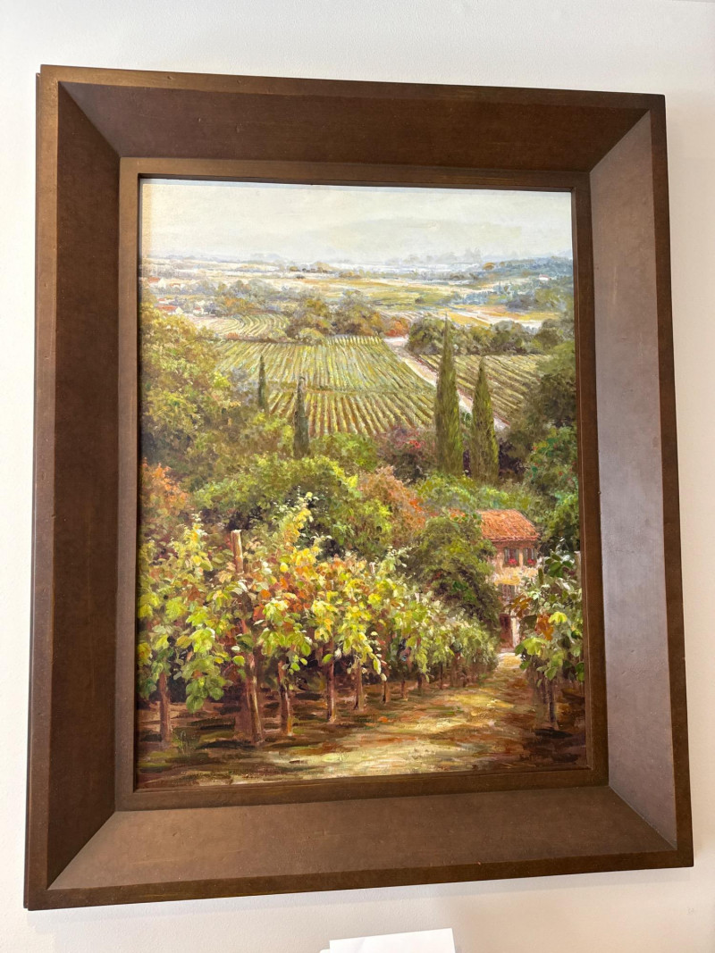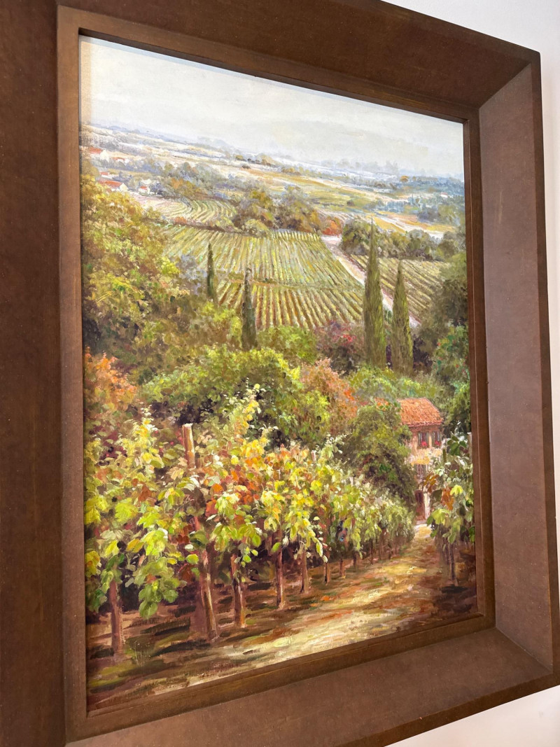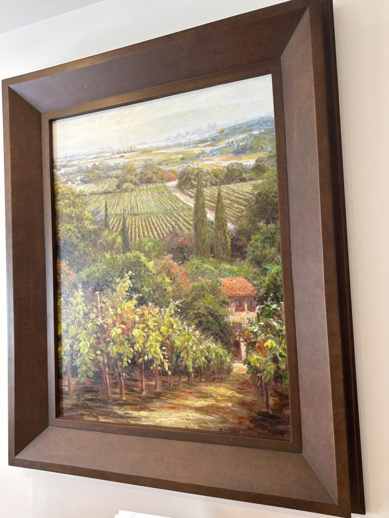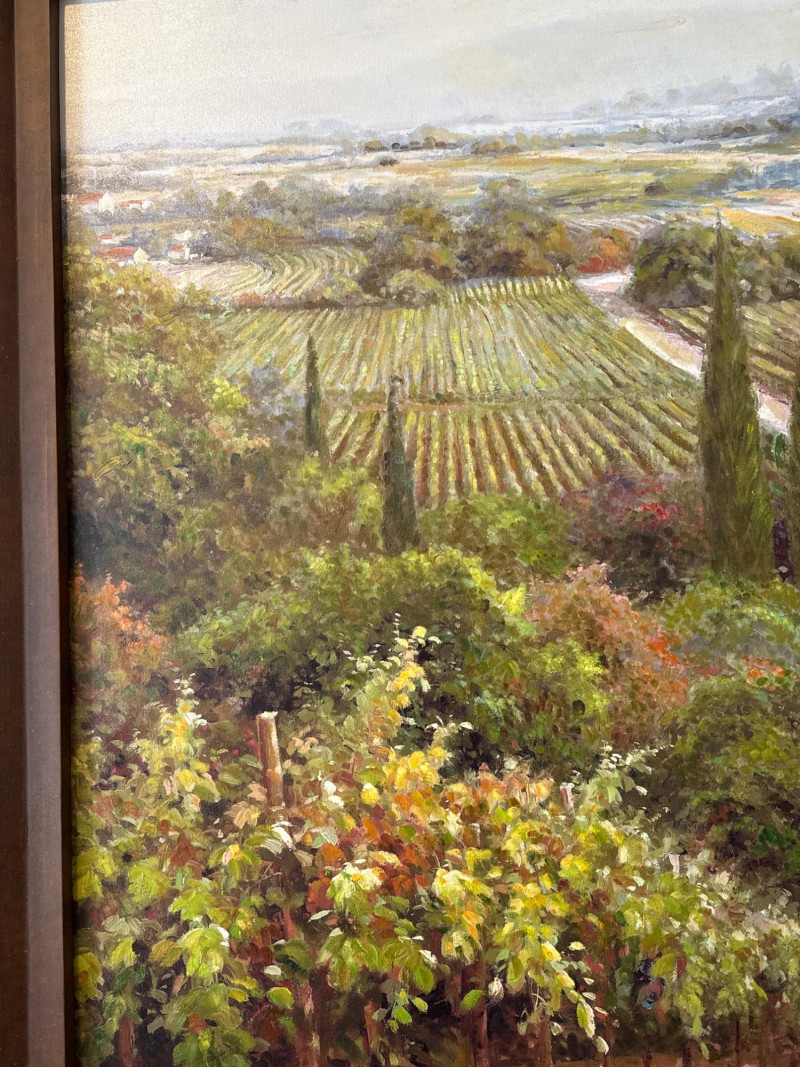Large Vineyard Landscape Painting – 63" T x 52" W Framed landscape painting featuring rows of grapevines in the foreground, a red-roofed building partially hidden by foliage, and cypress trees leading into a vista of cultivated fields and rolling hills. Housed in a deep, beveled wooden frame. Dimensions: