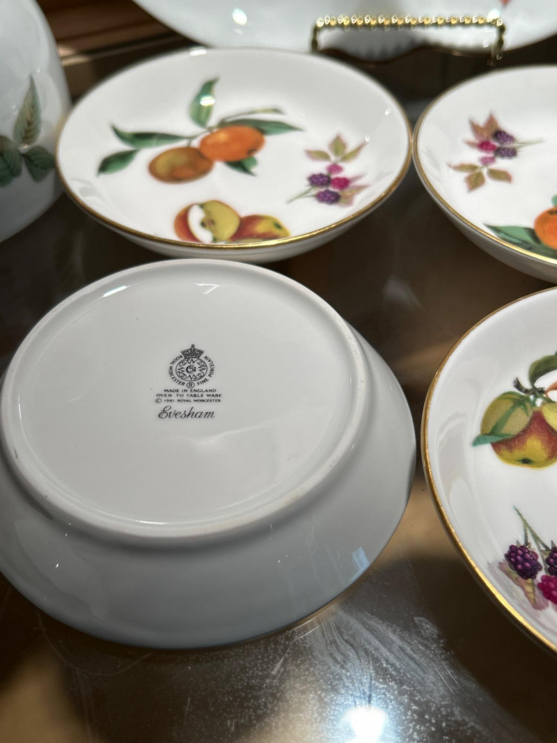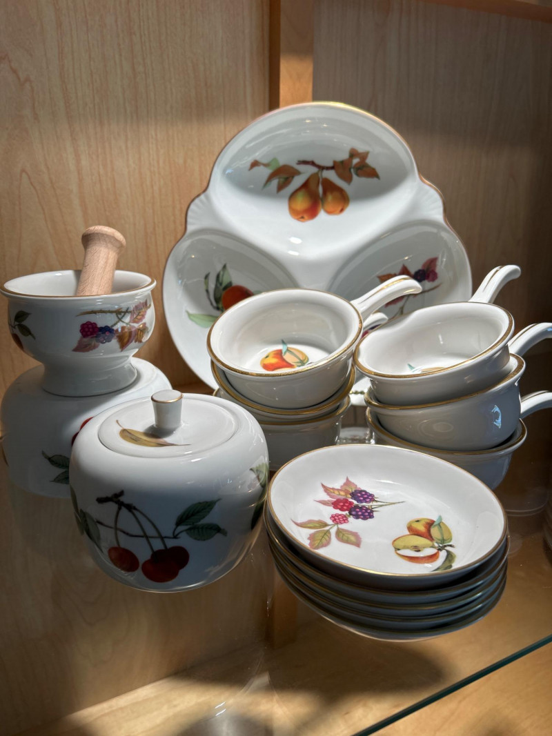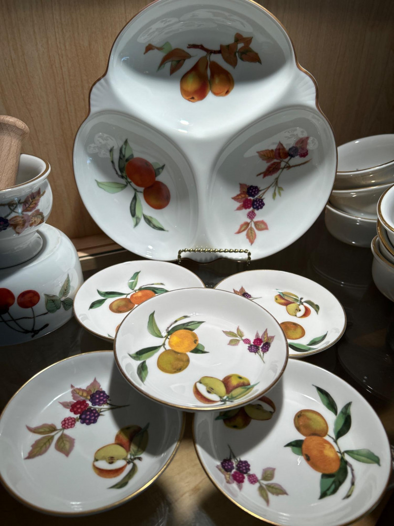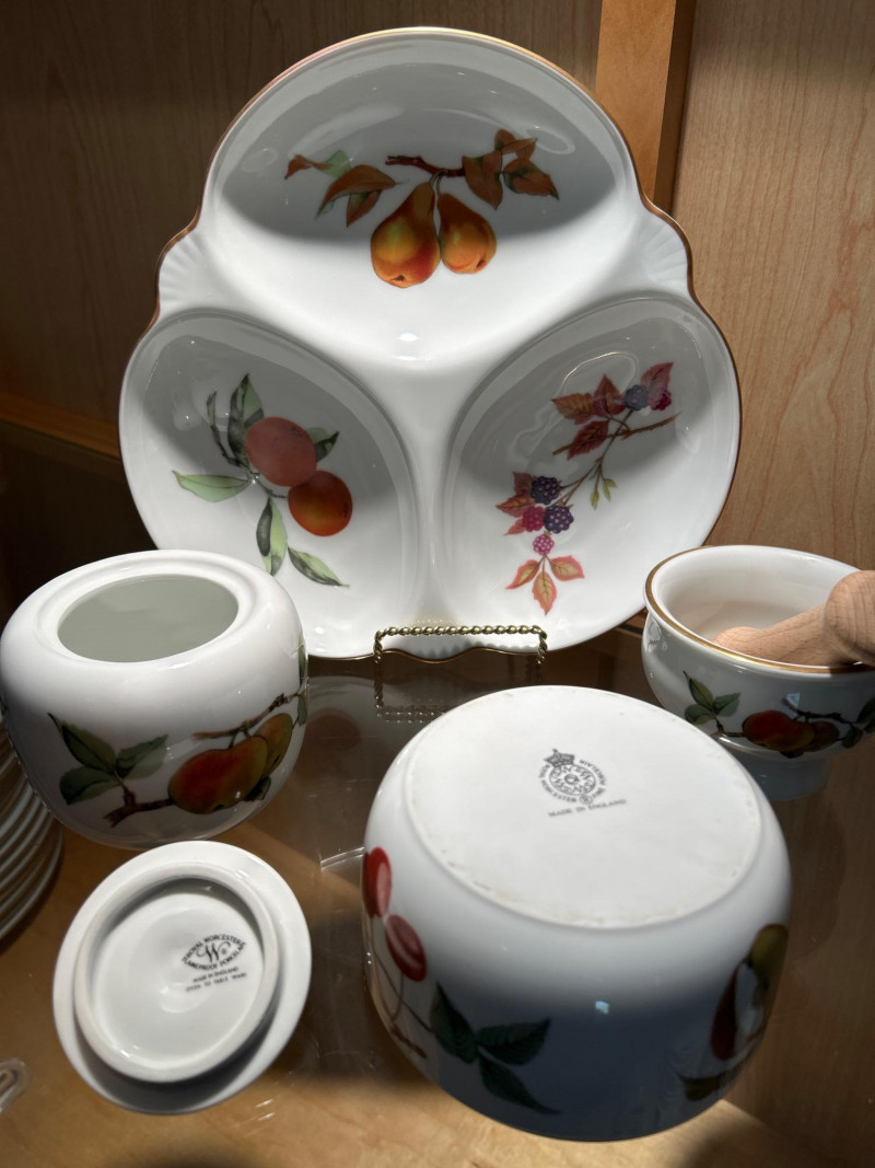 Royal Worcester Evesham Gold Serving Pieces Set of fine porcelain serving pieces by Royal Worcester in the Evesham Gold pattern. Each piece is decorated with hand-applied fruit motifs and finished with gold edging. Set includes: One three-part relish tray One mortar and pestle One covered bowl One small serving bowl Six handled cocottes Five bread plates Pattern: Evesham Gold