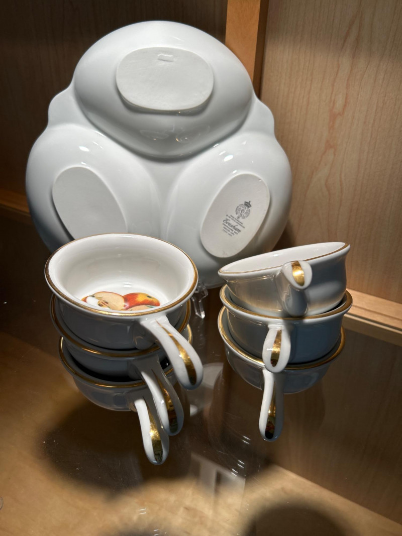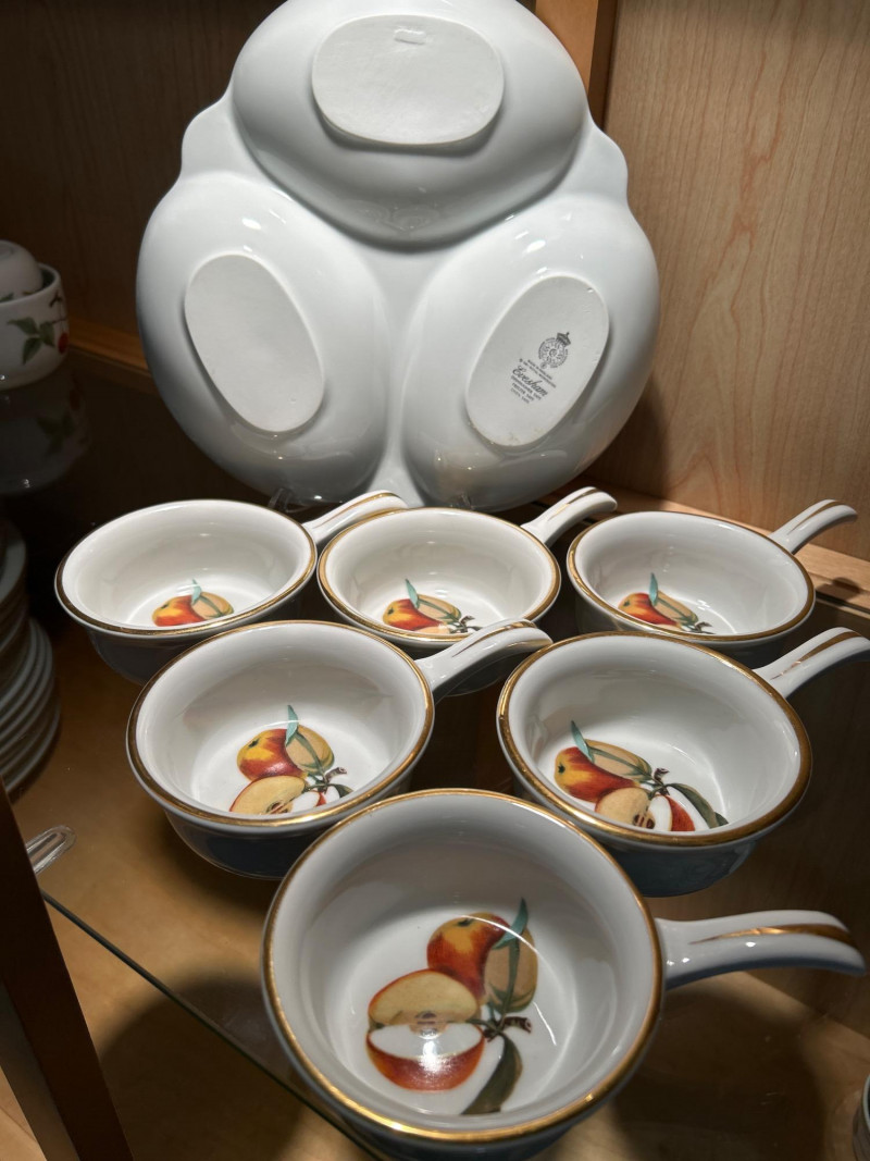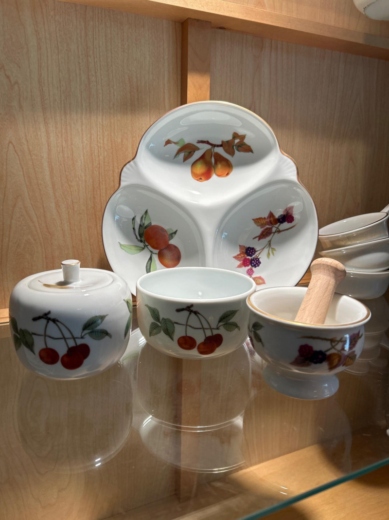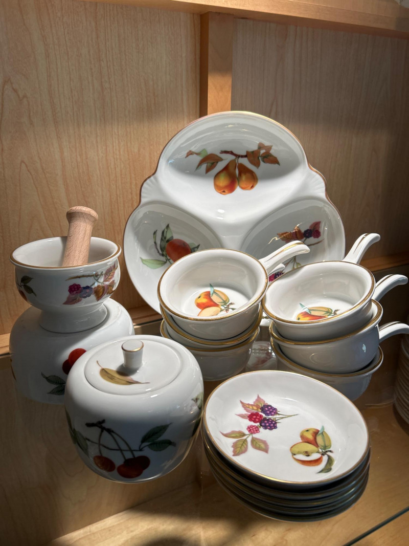 Royal Worcester Evesham Gold Serving Pieces Set of fine porcelain serving pieces by Royal Worcester in the Evesham Gold pattern. Each piece is decorated with hand-applied fruit motifs and finished with gold edging. Set includes: One three-part relish tray One mortar and pestle One covered bowl One small serving bowl Six handled cocottes Five bread plates Pattern: Evesham Gold