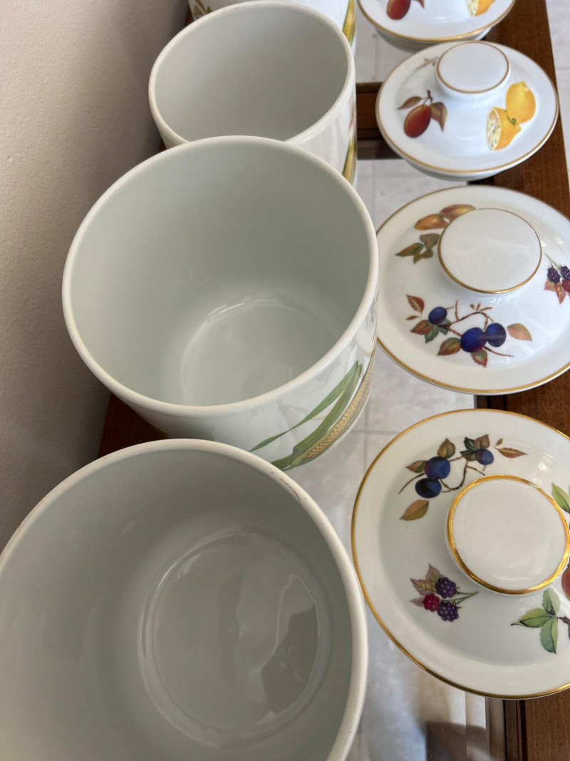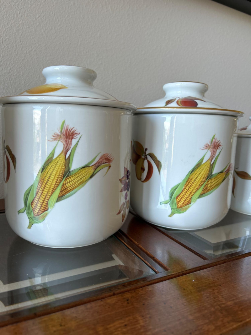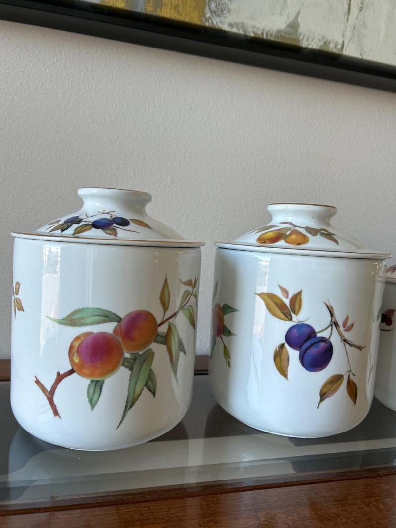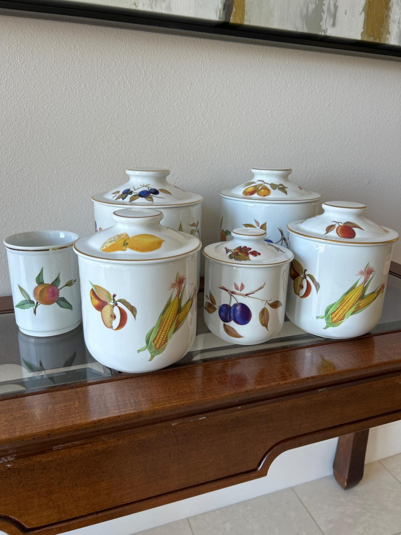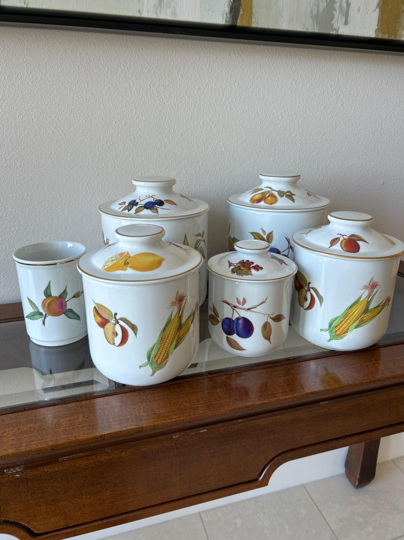 Royal Worcester Evesham Gold Canister Set Set of five covered canisters and one utensil holder by Royal Worcester in the Evesham Gold pattern. Made of fine porcelain with hand-painted fruit and vegetable motifs and gold trim. Canisters feature fitted lids with knob handles; the utensil holder is open-top and matches the set. Pattern: Evesham Gold Material: Fine porcelain with gold edging Includes: 5 covered canisters, 1 utensil holder Measurements: Canisters: 9" to 6.5" tall × 7" to 5" diameter Utensil holder: 5.5" tall × 4" diameter