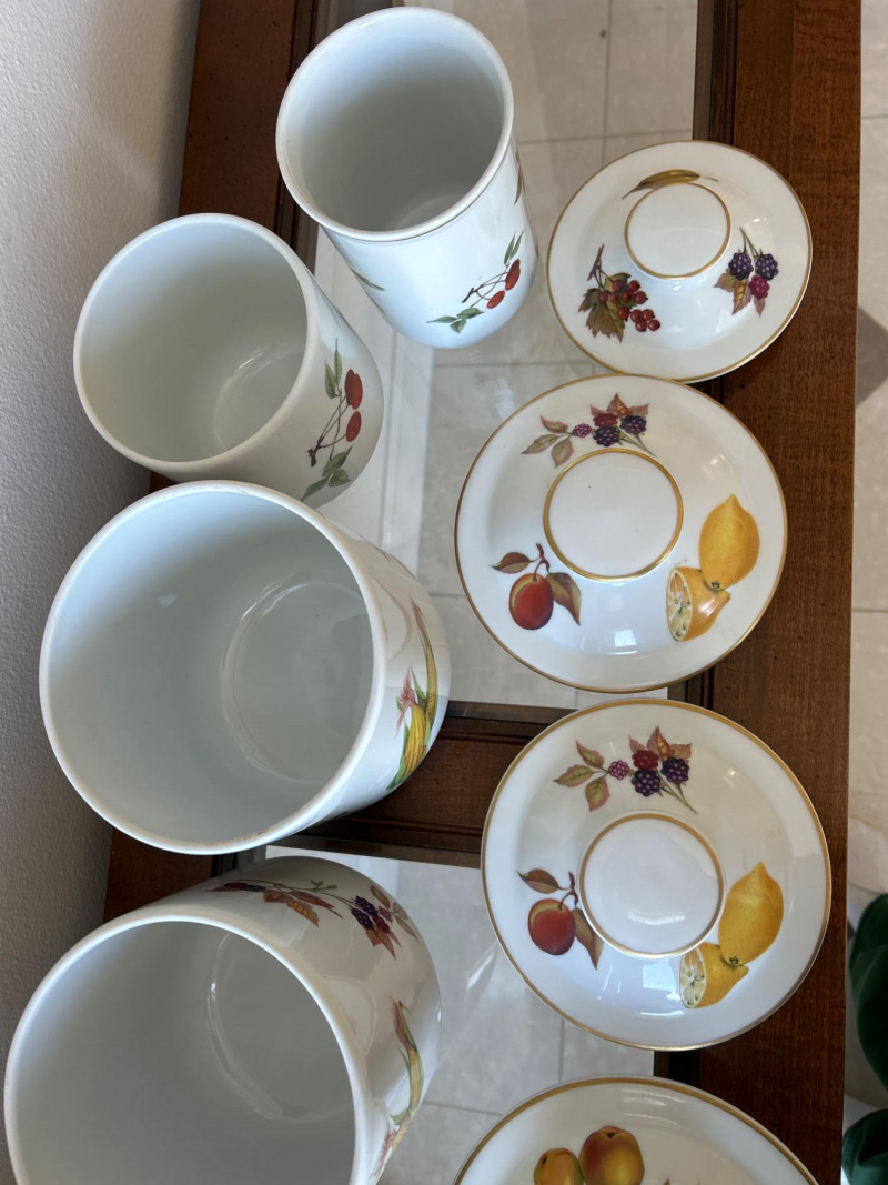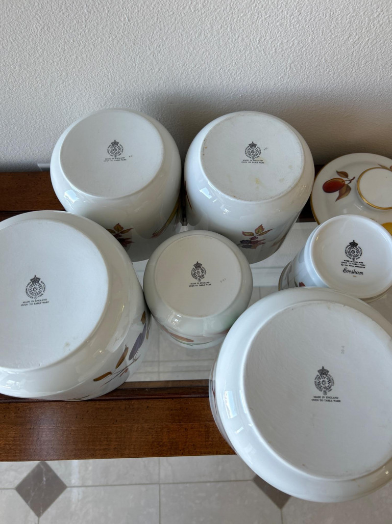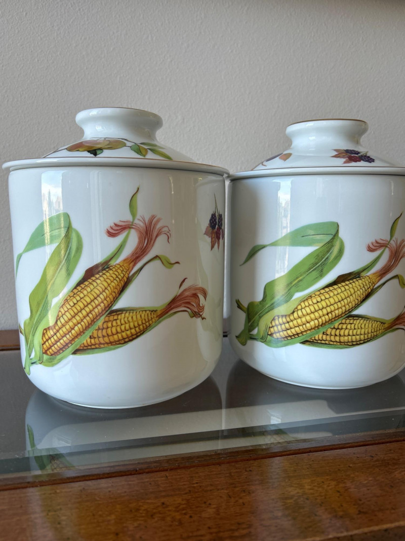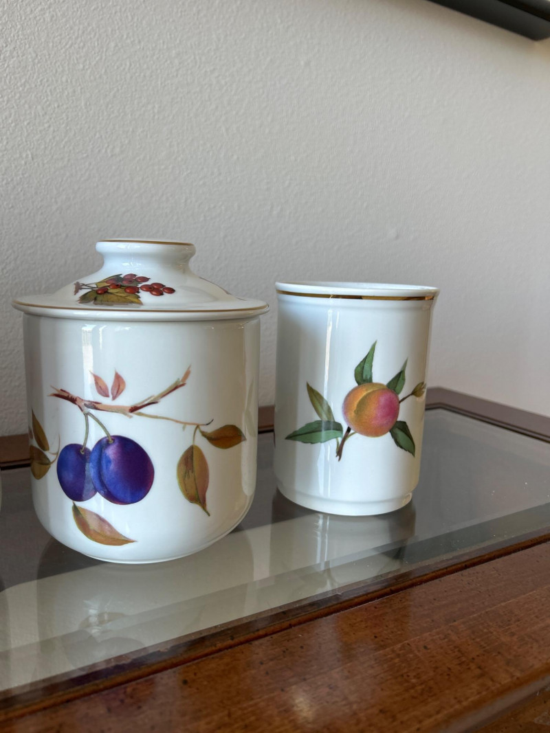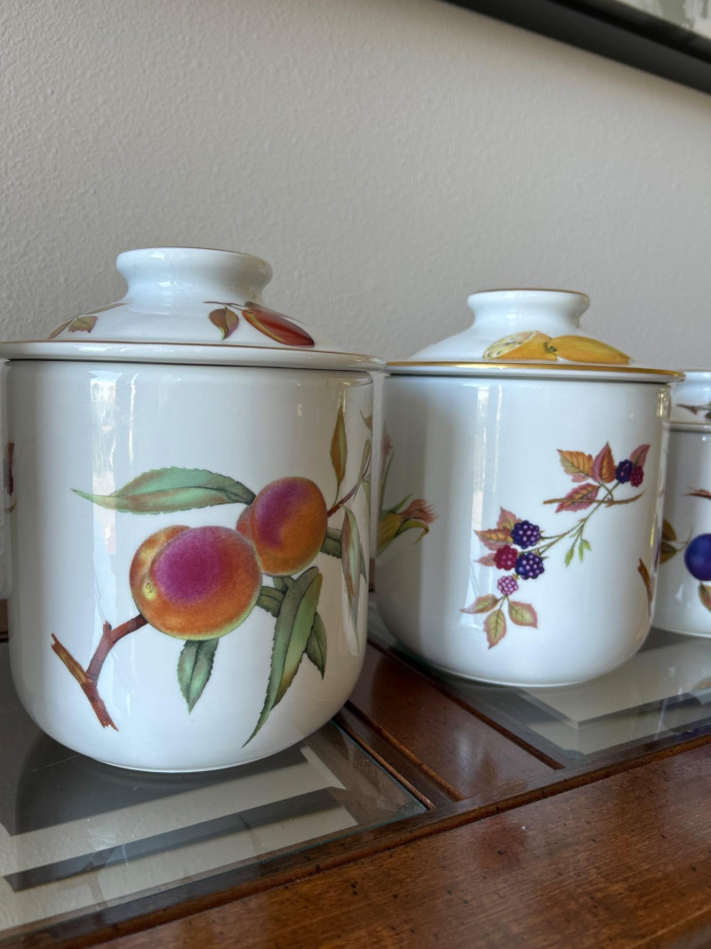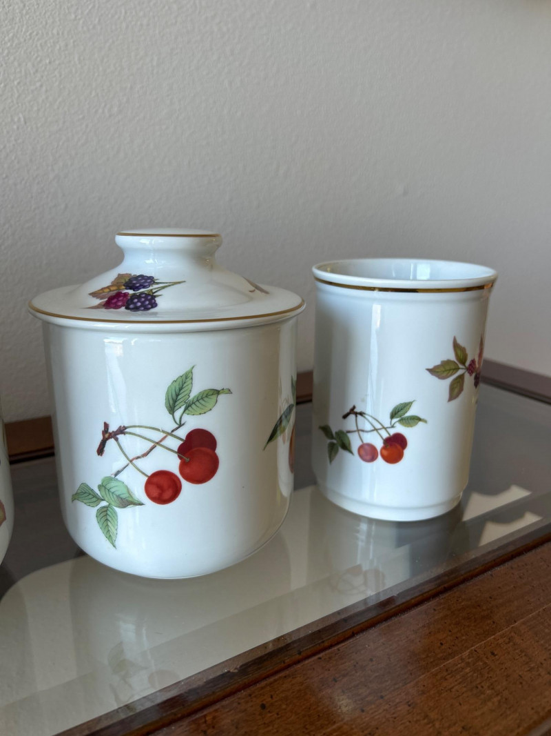 Royal Worcester Evesham Gold Canister Set Set of five covered canisters and one utensil holder by Royal Worcester in the Evesham Gold pattern. Made of fine porcelain with hand-painted fruit and vegetable motifs and gold trim. Canisters feature fitted lids with knob handles; the utensil holder is open-top and matches the set. Pattern: Evesham Gold Material: Fine porcelain with gold edging Includes: 5 covered canisters, 1 utensil holder Measurements: Canisters: 9" to 6.5" tall × 7" to 5" diameter Utensil holder: 5.5" tall × 4" diameter