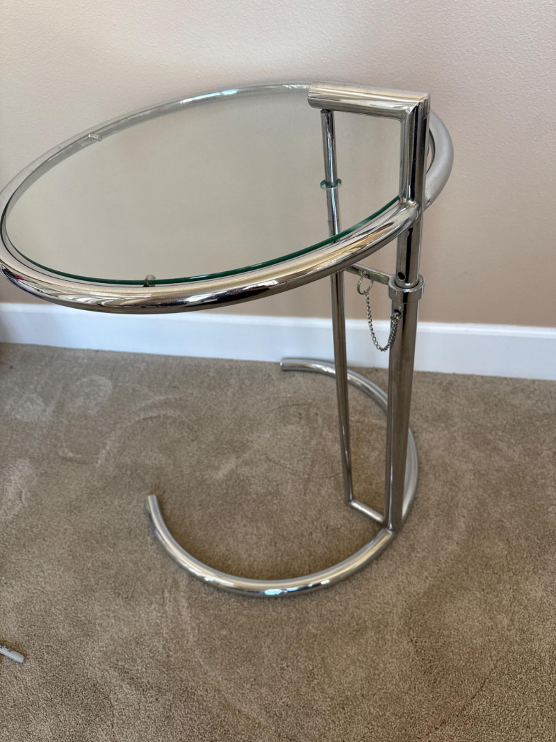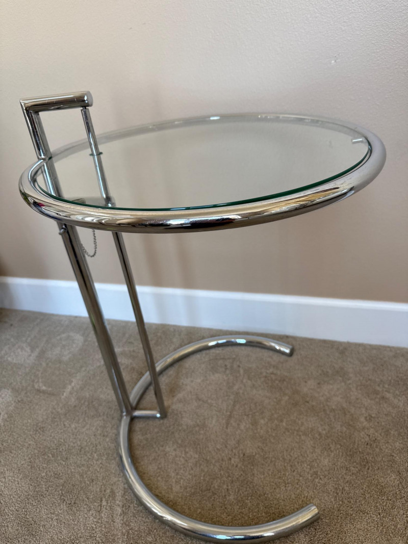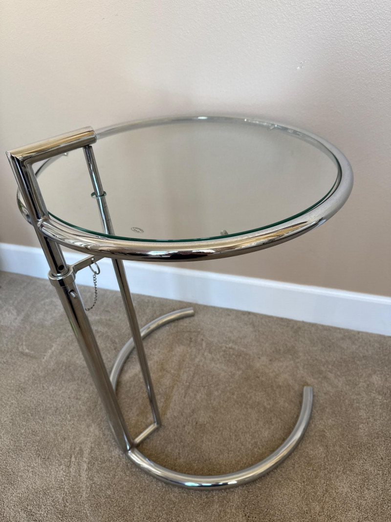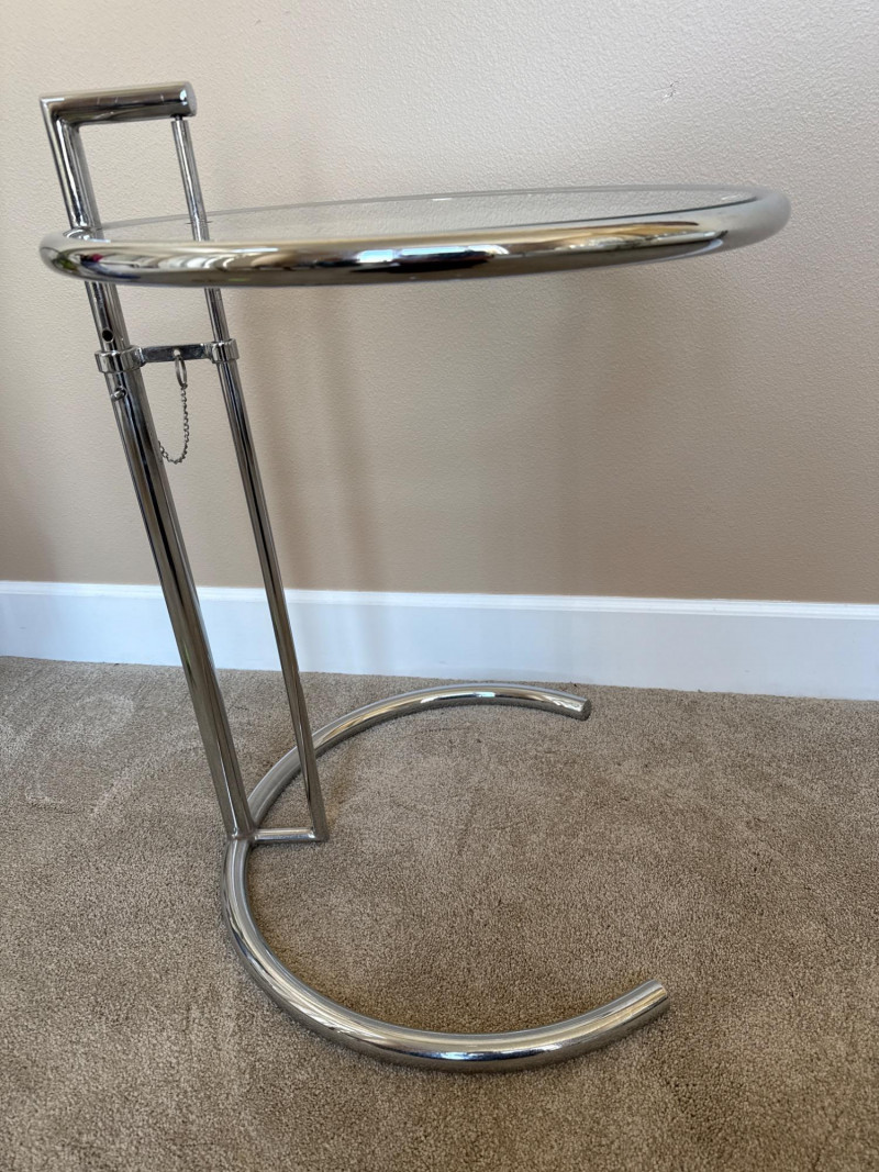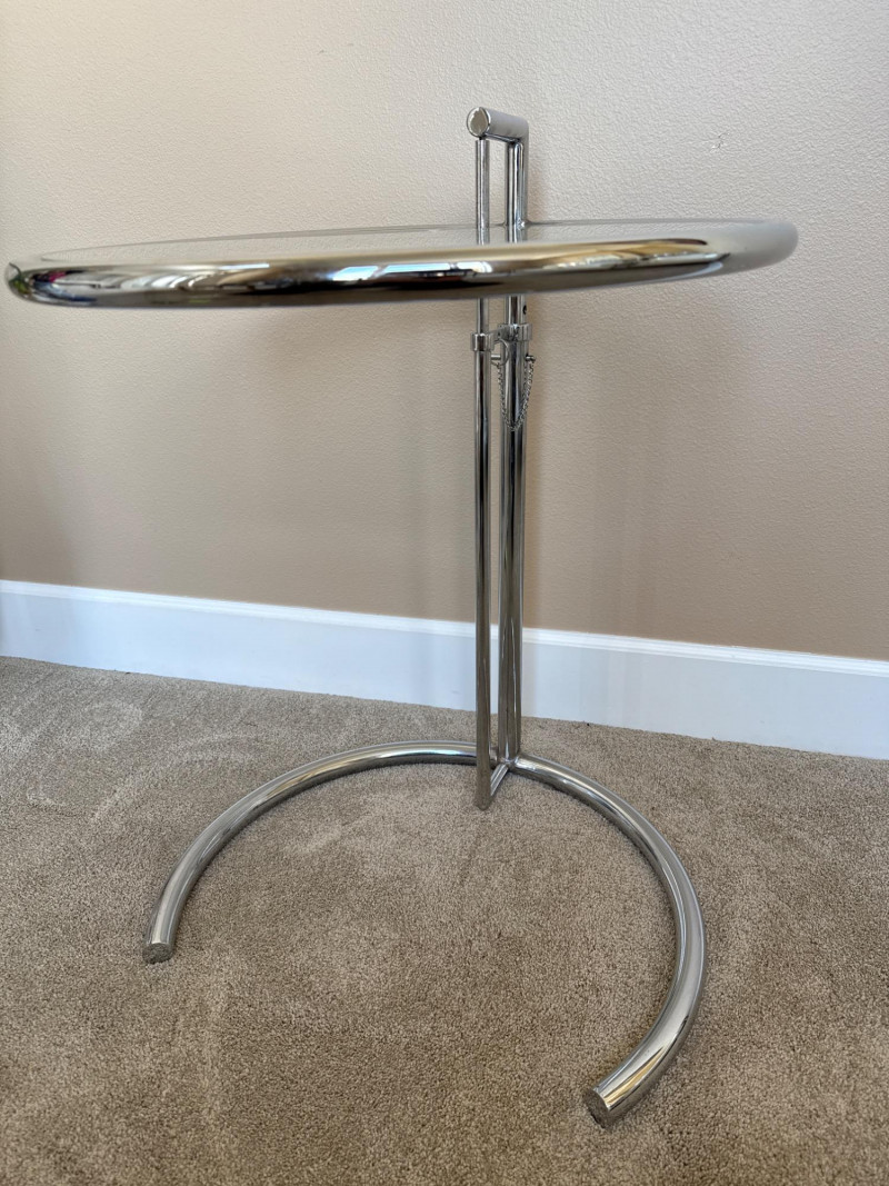 Eileen Gray Inspired Adjustable Chrome Side Table Eileen Gray inspired chrome side table with tempered glass top. Features height-adjustable mechanism with five settings and a tubular steel frame. The minimalist design complements modern and contemporary interiors. Measurements:
