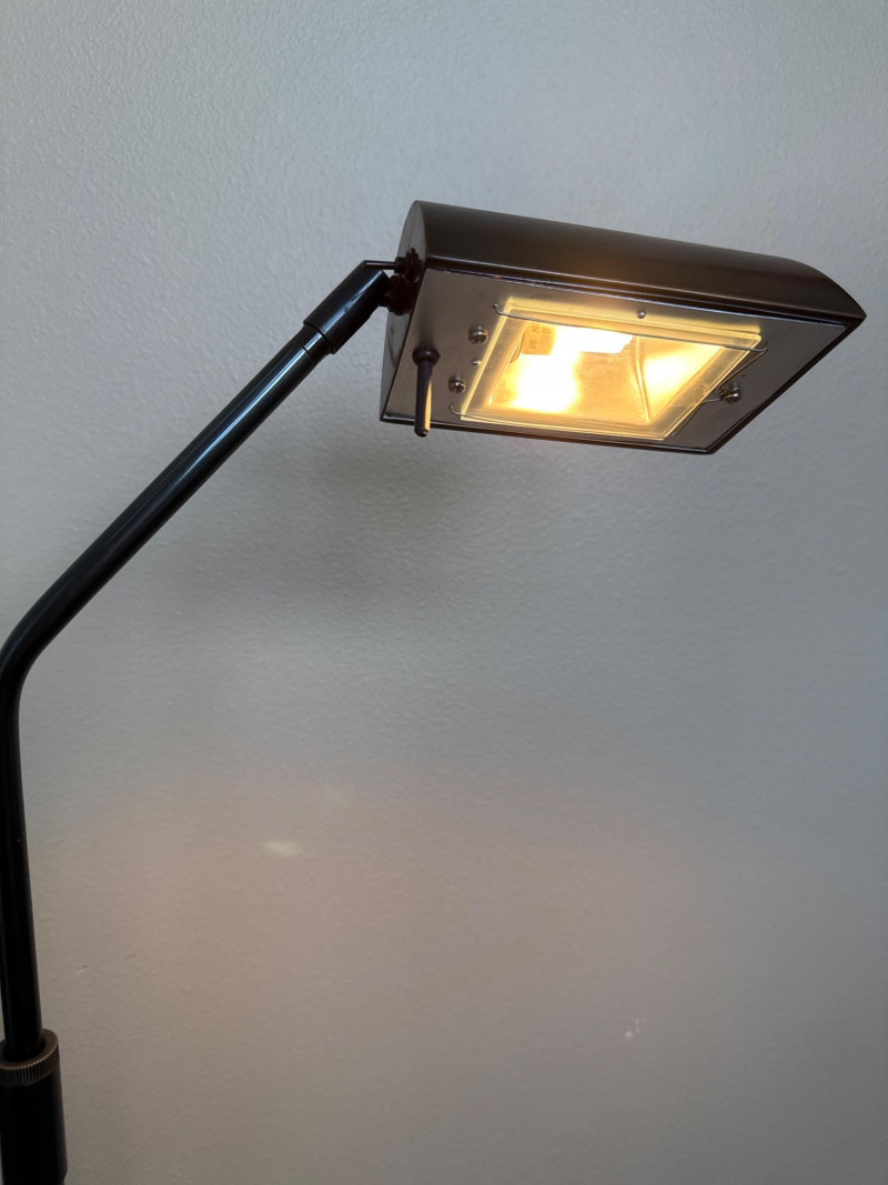 Mid-Century Modern Style Adjustable Floor Lamp – 50" Tall Bronze-finished metal floor lamp with angled arm and pivoting rectangular shade. Features a telescoping shaft, square base, and toggle switch beneath the shade. Includes long yellow power cord. Measurements: