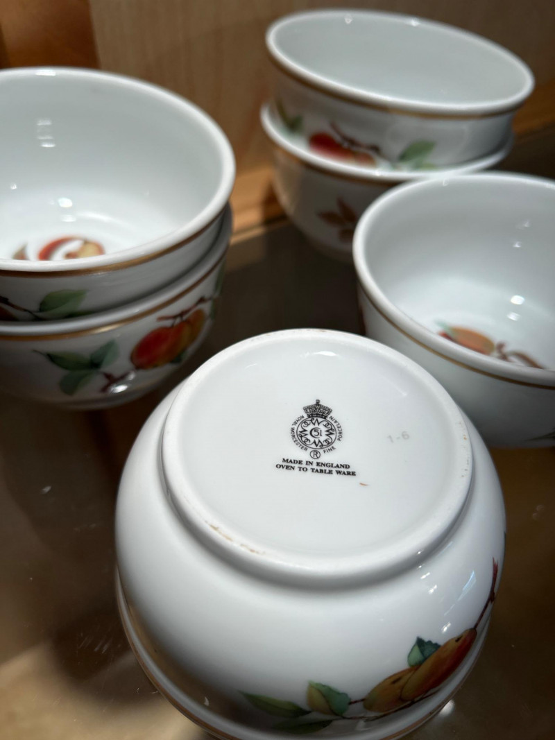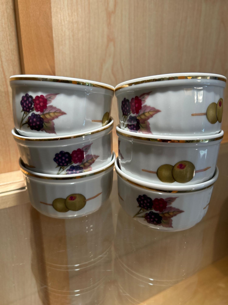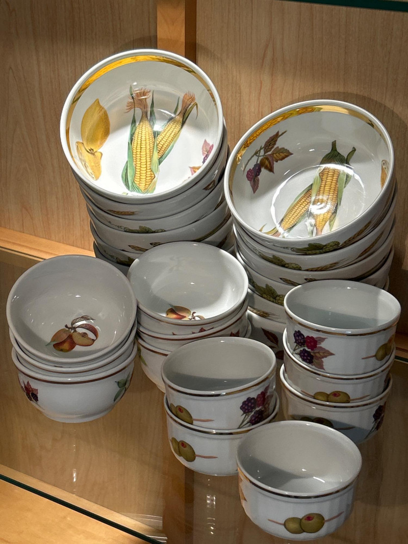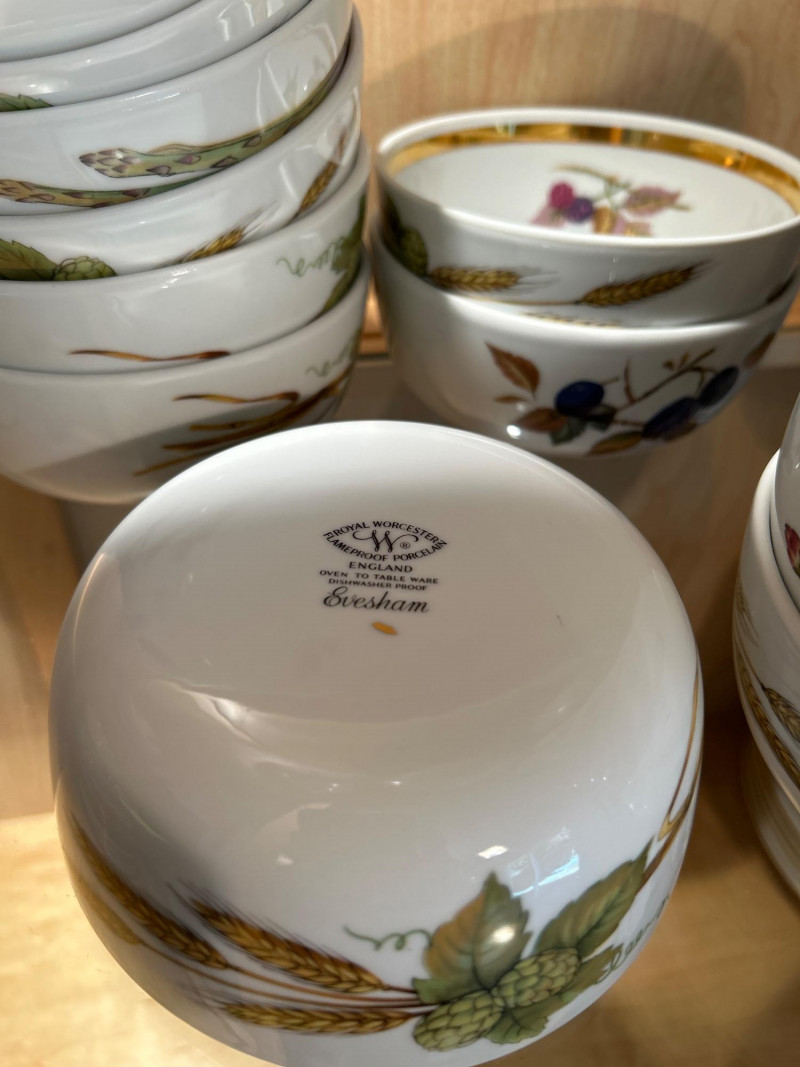 Three Sizes of Royal Worcester Bowls – Evesham Gold Set of fine porcelain bowls by Royal Worcester in the Evesham Gold pattern. Includes three distinct sizes, each featuring hand-applied fruit or vegetable motifs and gold trim. 13 medium bowls – 2.25" tall 6 small bowls – 3.5" diameter 6 ramekins – 3.5" diameter Pattern: Evesham Gold