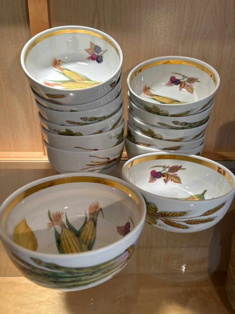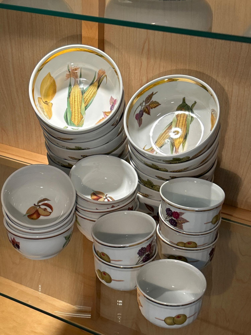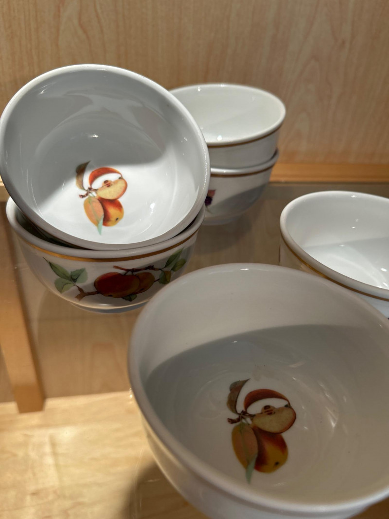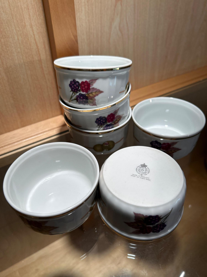 Three Sizes of Royal Worcester Bowls – Evesham Gold Set of fine porcelain bowls by Royal Worcester in the Evesham Gold pattern. Includes three distinct sizes, each featuring hand-applied fruit or vegetable motifs and gold trim. 13 medium bowls – 2.25" tall 6 small bowls – 3.5" diameter 6 ramekins – 3.5" diameter Pattern: Evesham Gold