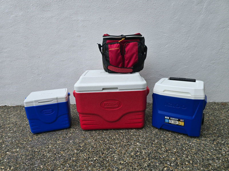 Four-Piece Outdoor Cooler Lot Collection of four coolers suitable for outdoor use, including wheeled, hard-sided, and soft-sided models. Designed to accommodate various needs such as transporting food, storing drinks, or carrying lunch. Coolers feature molded or padded handles, secure lids, and insulated interiors to retain cold temperature for extended periods. Ideal for camping, tailgating, picnics, or worksite use. Set includes: (1) Coleman red hard-sided cooler with molded handles and hinged white lid (1) Coleman blue compact hard-sided cooler with side handles (1) Igloo blue wheeled cooler with built-in dolly and telescoping handle (1) Arctic Zone red and black soft-sided cooler with shoulder strap and front zip pockets