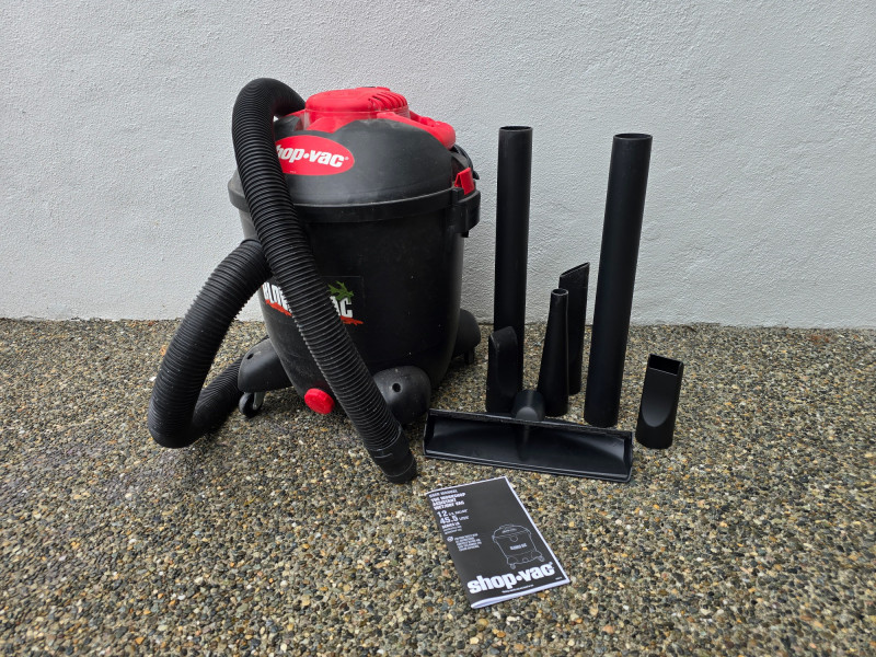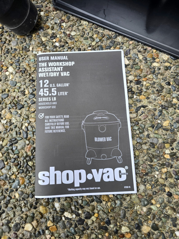 Shop-Vac Wet/Dry Vacuum - 12 Gallon (45.5L) Series LB Shop-Vac 12-gallon wet/dry vacuum from the LB series. Suitable for household use only. Comes with original hose, multiple extension and specialty nozzles, and the service manual. Unit is relatively clean and in good working condition. Not used for commercial purposes. Includes: Main vacuum unit (12 gal / 45.5 L capacity) Flexible hose 2 extension wands Floor nozzle Utility nozzle Crevice tools (various shapes) User/service manual Condition: Gently used, household use only