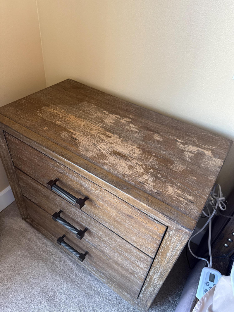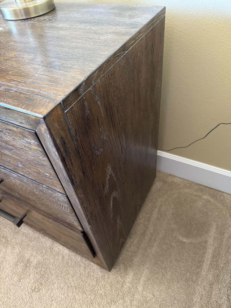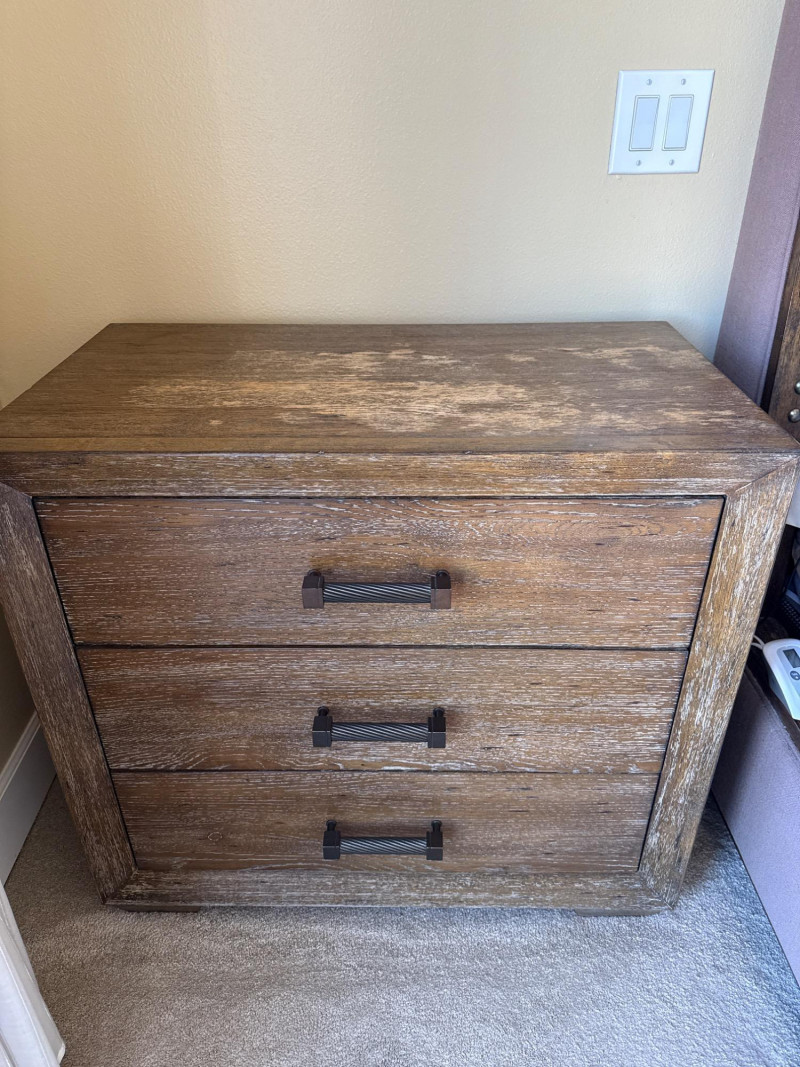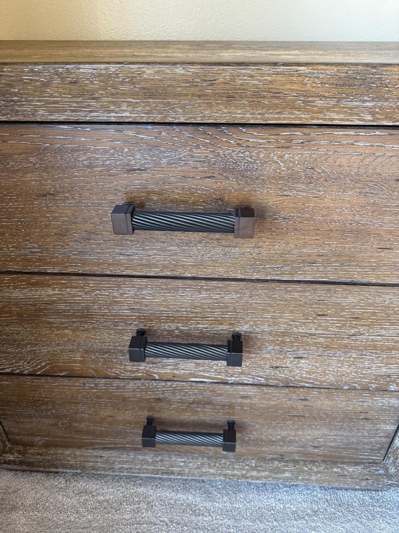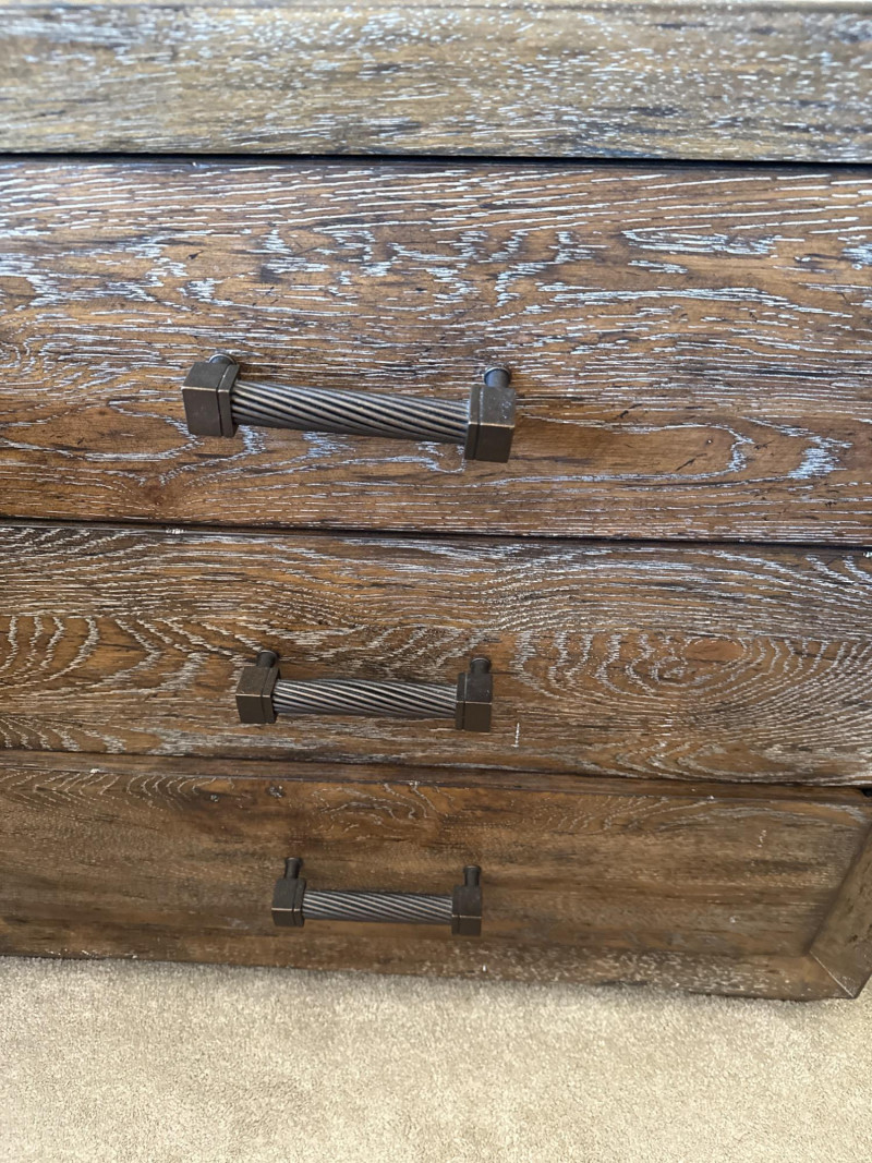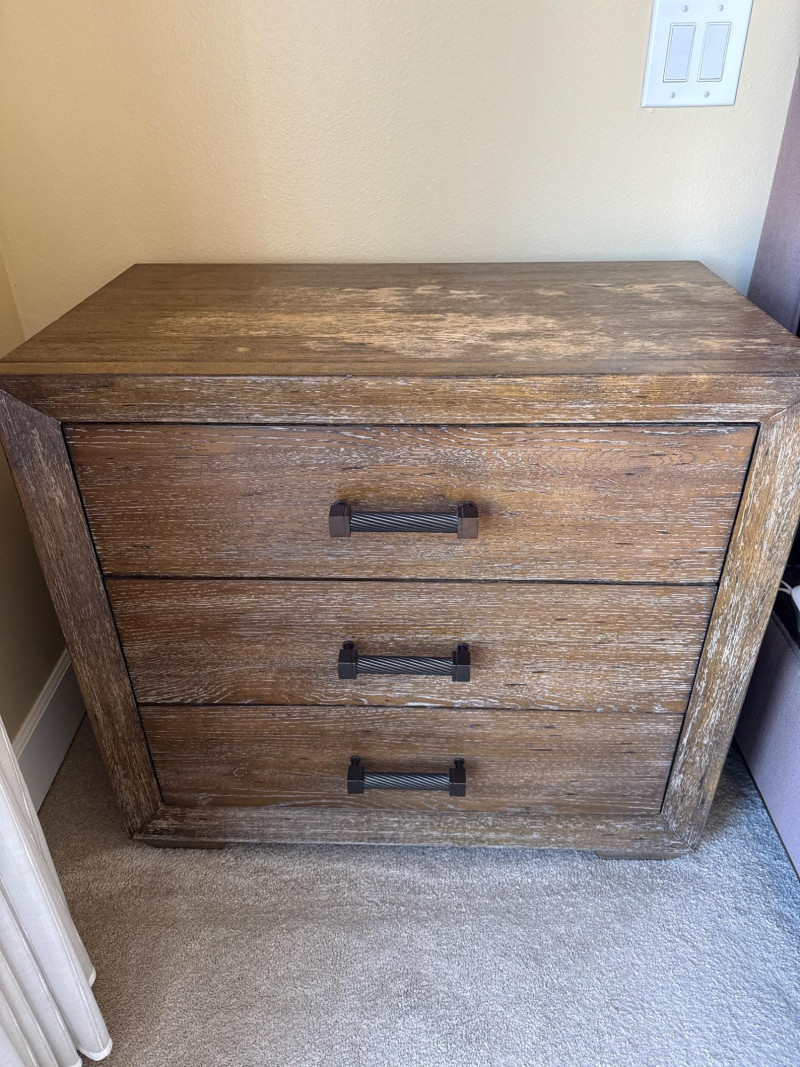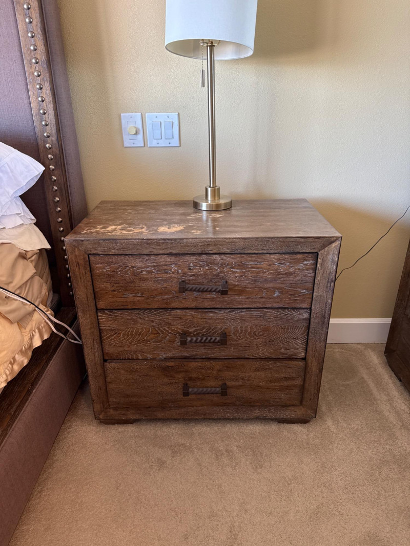 Two Rustic Basset Nightstands – Matches Dresser in Lot 72 Pair of three-drawer nightstands constructed in a rustic wood finish with visible grain and weathered texture. Each drawer features matching black metal bar-style handles with ribbed detailing. The design is clean and rectangular, fitting well in transitional or rustic-style interiors. These pieces coordinate with the dresser listed in Lot 72. Note: both tops have surface wear and may require refinishing; a paint stain is recommended for restoration. Dimensions:
