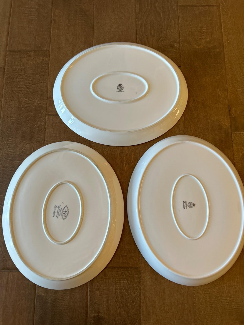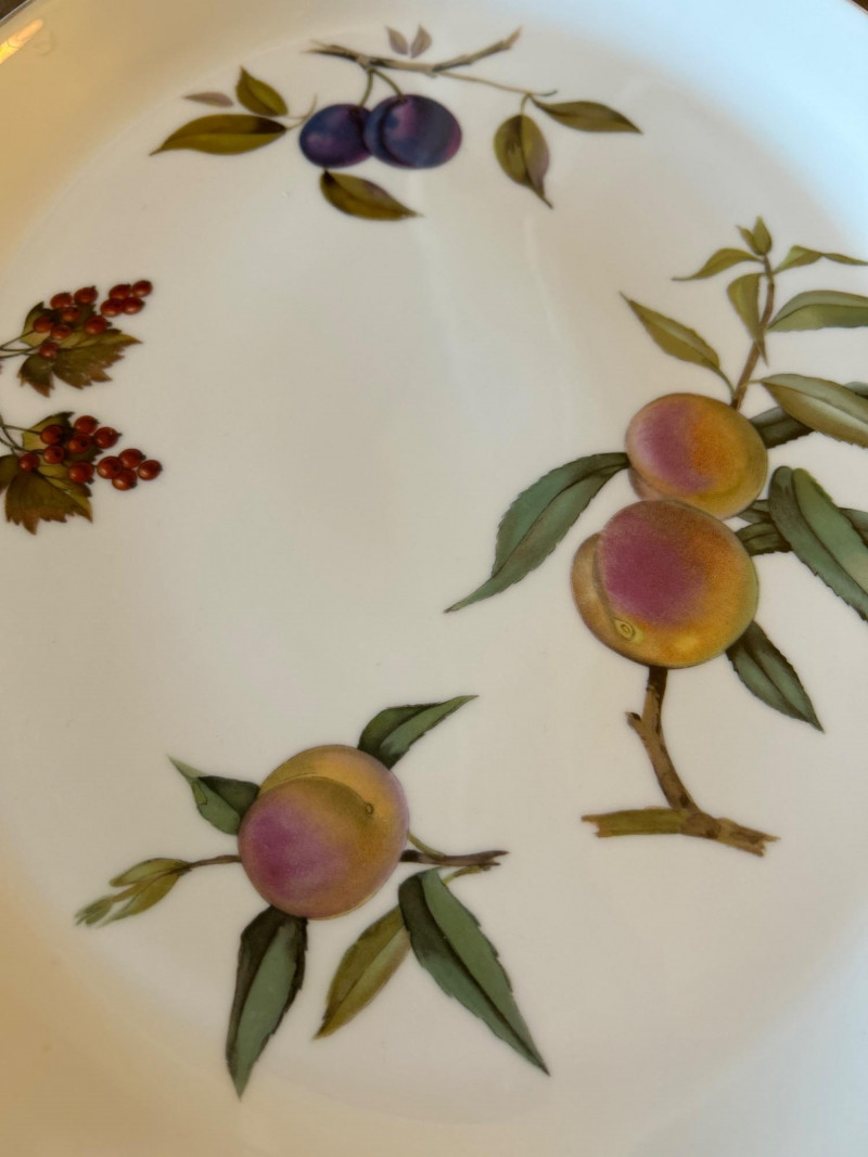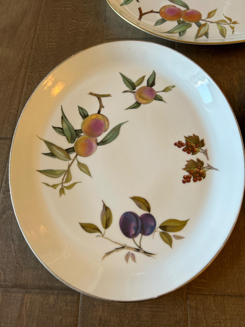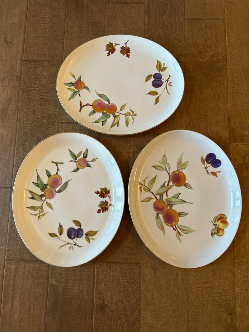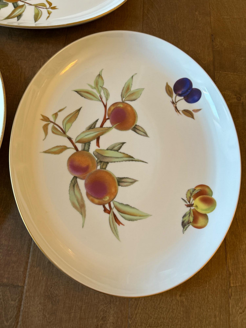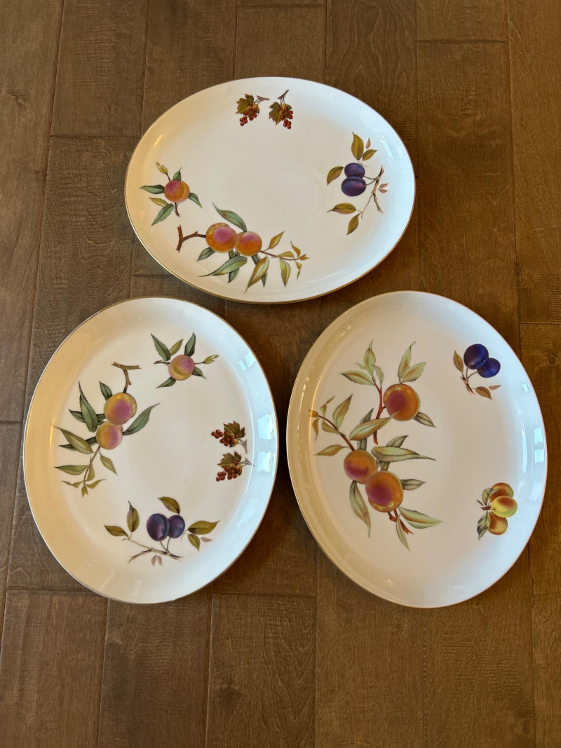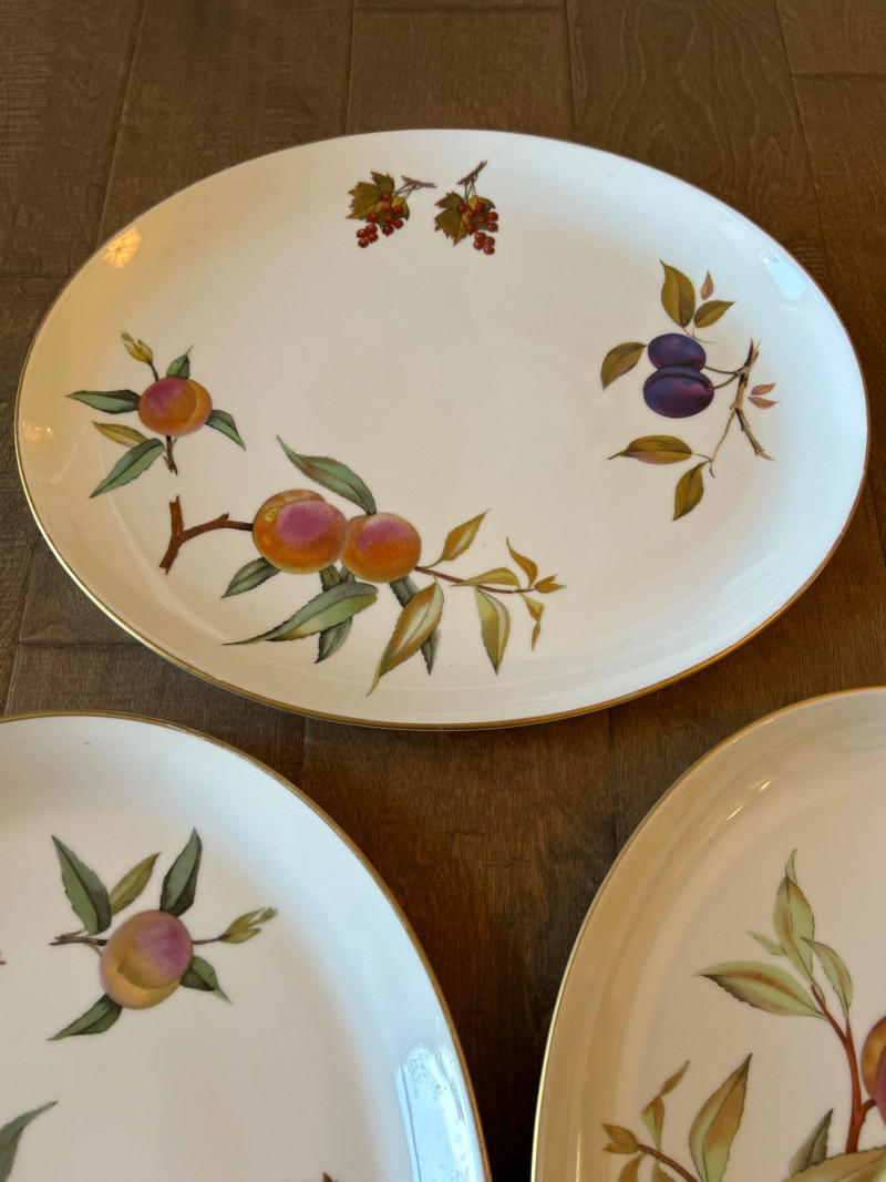 Set of Three Royal Worcester Evesham Gold Serving Platters Set of three 15-inch serving platters by Royal Worcester in the Evesham Gold pattern. Made of fine porcelain, each platter features hand-painted fruit motifs such as plums, peaches, and berries. The edges are finished with gold trim, typical of the Evesham Gold line. Each platter has a slightly different arrangement of fruit, reflecting the variety in this classic pattern. Material: Fine porcelain with gold trim Pattern: Evesham Gold Design: Assorted fruit motifs (plums, peaches, berries) Quantity: 3 serving platters Size: 15" each