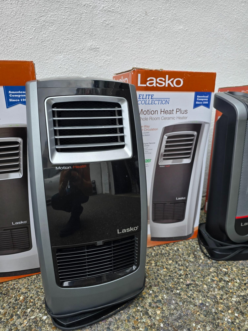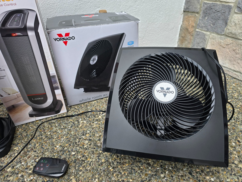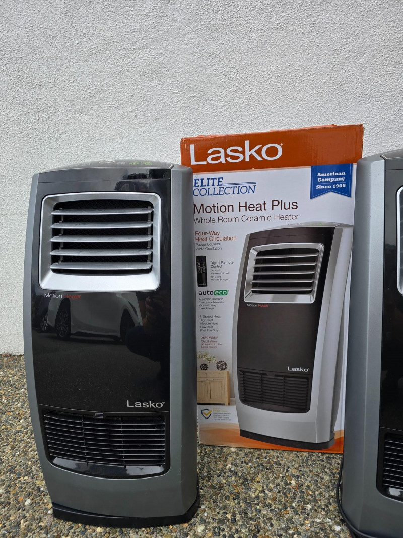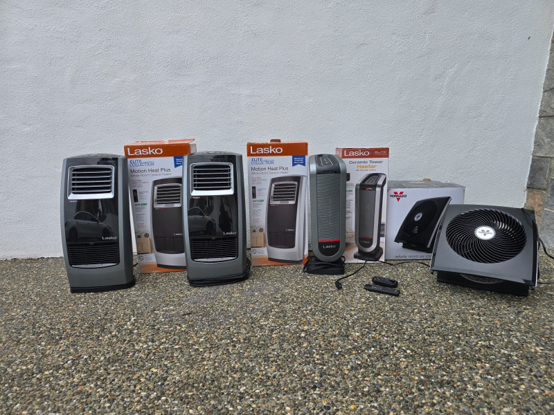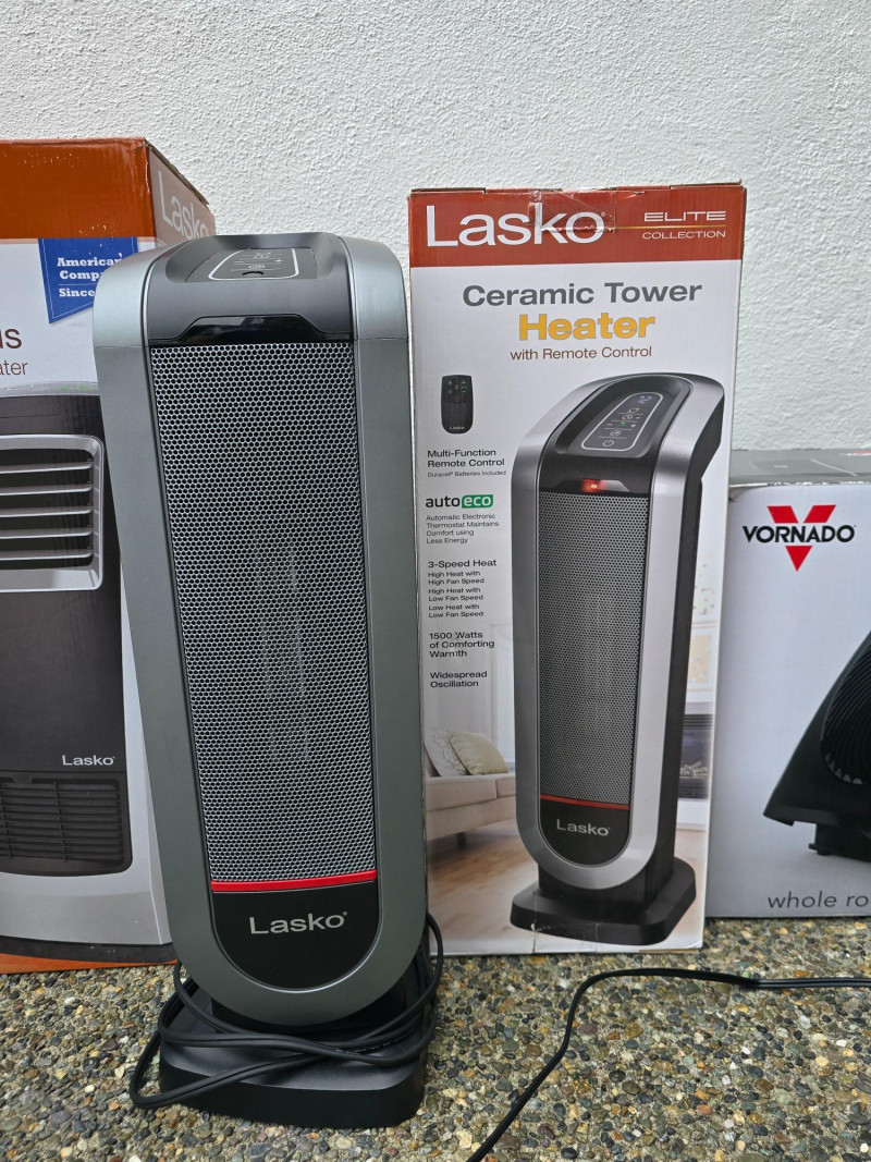 Lasko Heaters and Vornado Fan Lot includes four appliances for whole-room temperature control: Two Lasko Elite Collection Motion Heat Plus ceramic heaters with 4-way heat circulation, AutoEco™ mode, digital controls, and 1500-watt output (one remote missing) One Lasko ceramic tower heater with adjustable thermostat and remote control One Vornado whole-room air circulator fan with vortex airflow and variable speed settings Set includes: (2) Lasko Motion Heat Plus Heaters (1) Lasko Ceramic Tower Heater (1) Vornado Air Circulator Fan (1) Remote (one missing)