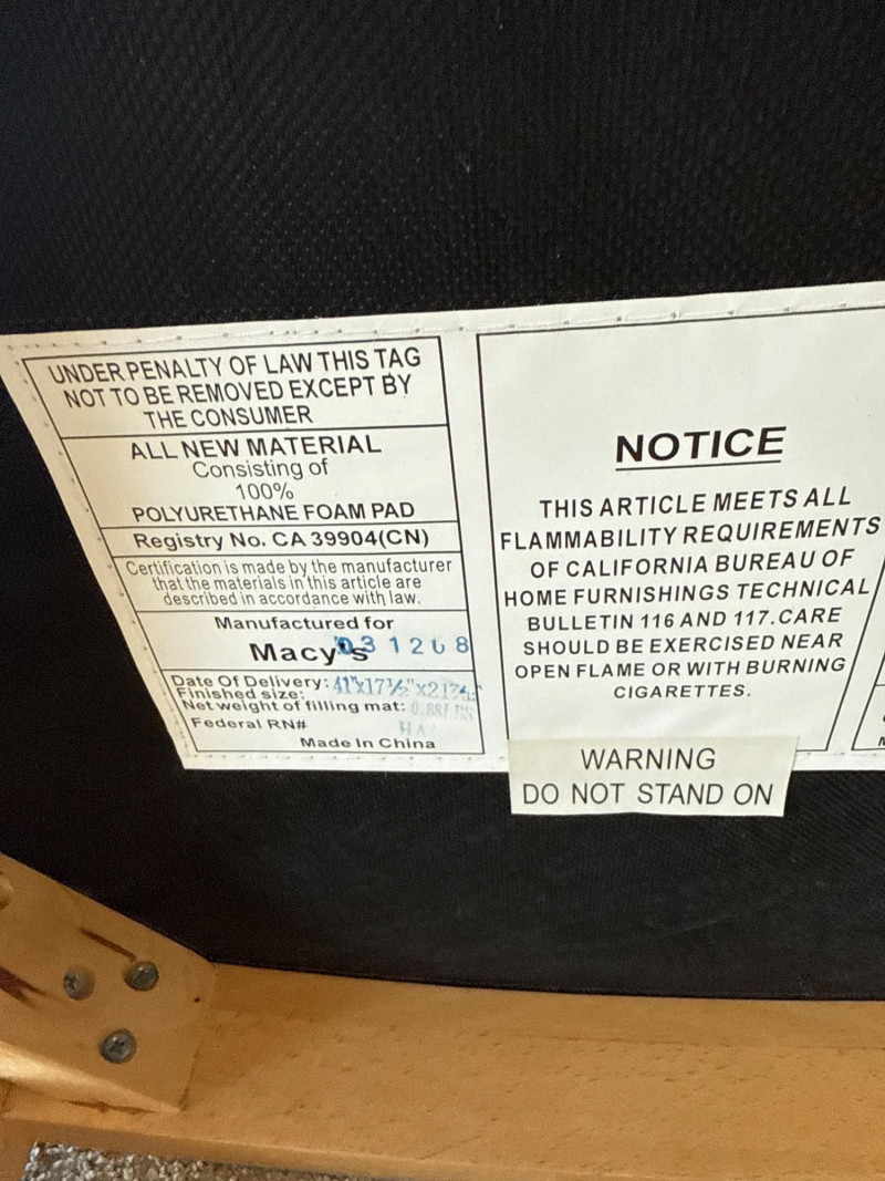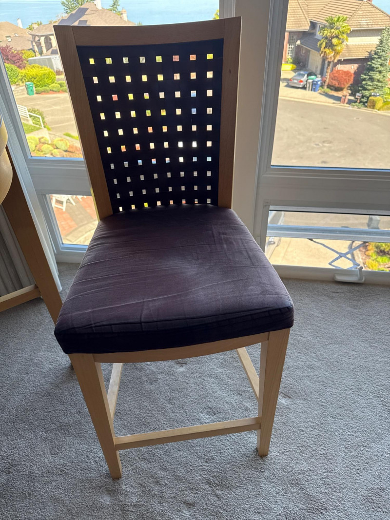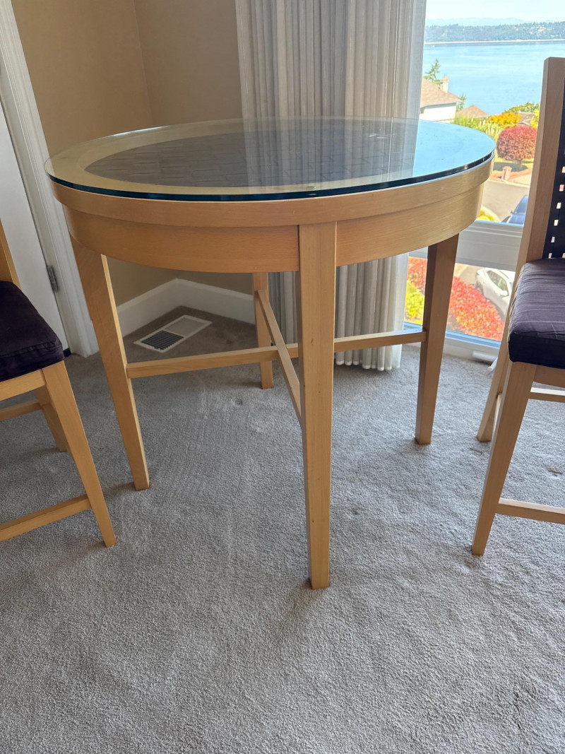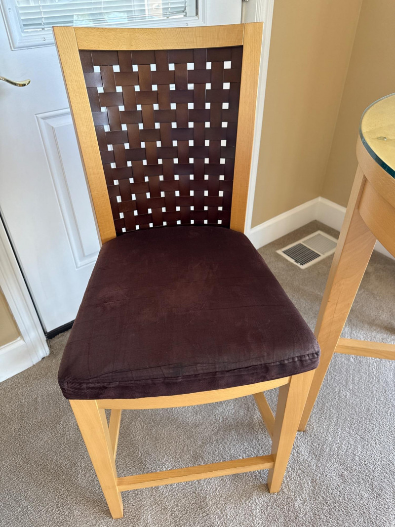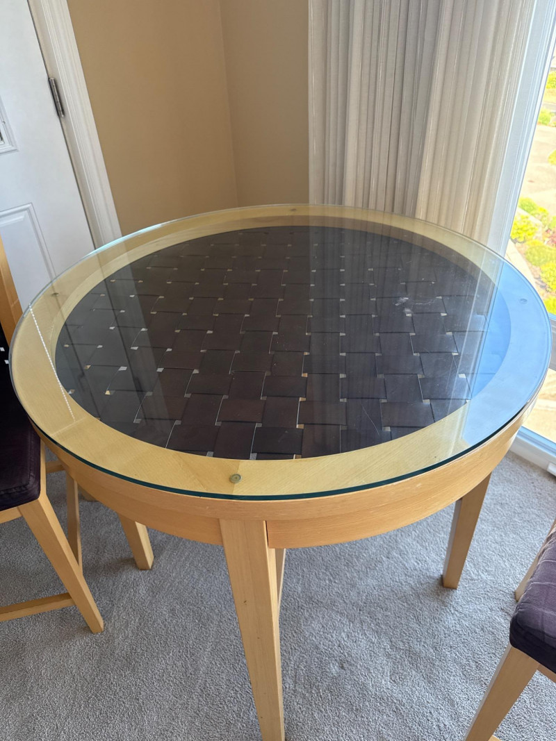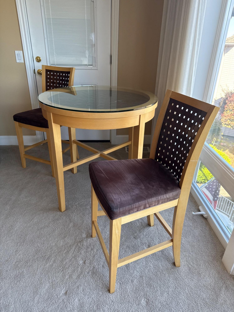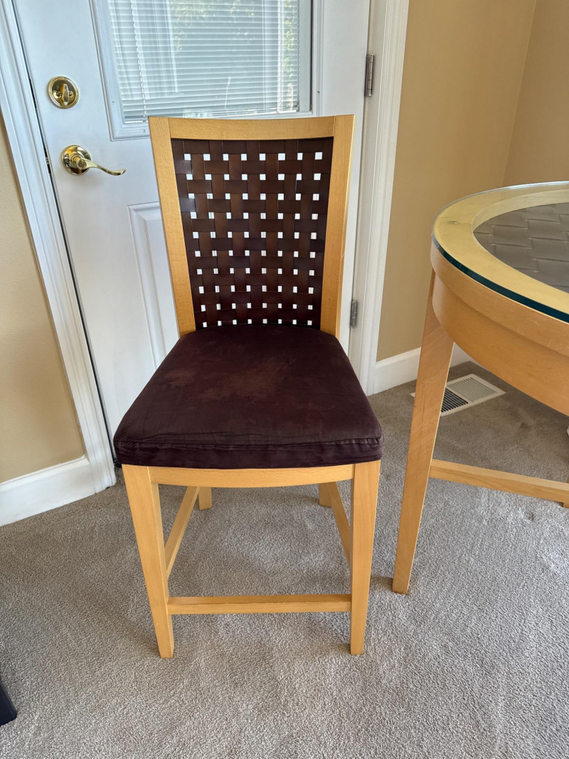 Macy's Contemporary Bistro Set with Two Chairs Contemporary bistro set from Macy's featuring a round glass top table with an underlying weave pattern and two matching chairs. Chairs have a wooden grid-style back and upholstered seats. Table Dimensions: Chair Dimensions (each):
