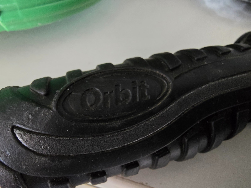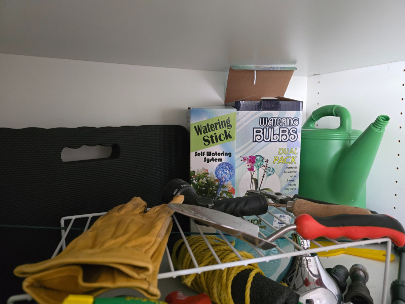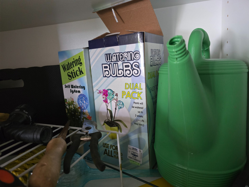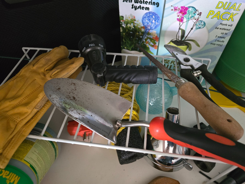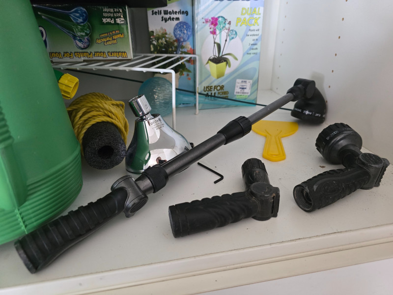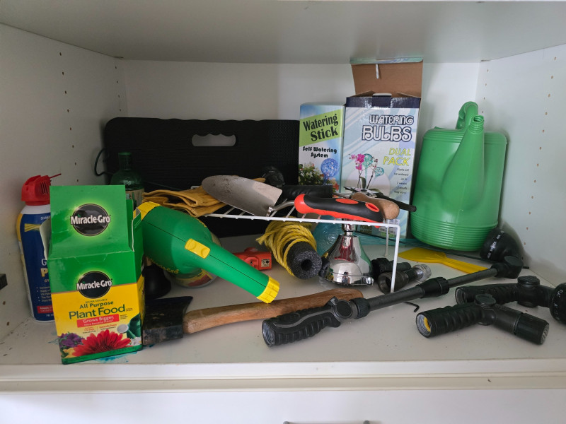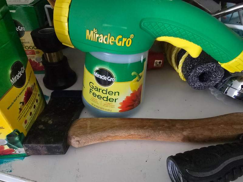 Miscellaneous Garden Tools Lot includes multiple hose nozzles (including Orbit), Miracle-Gro all-purpose plant food, Miracle-Gro hose-end sprayer, green watering can, hand trowels, pruning shears, watering bulbs (dual pack), watering stick system, gardening gloves, kneeling pad, garden twine, and assorted small hand tools.