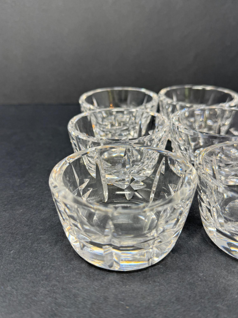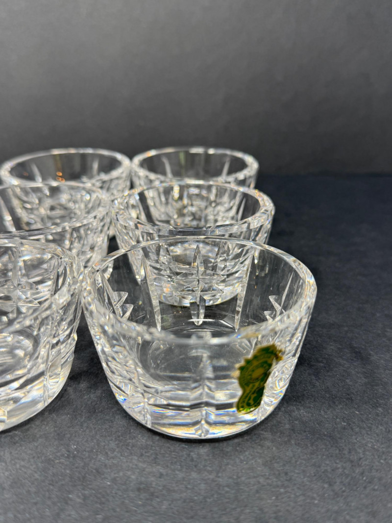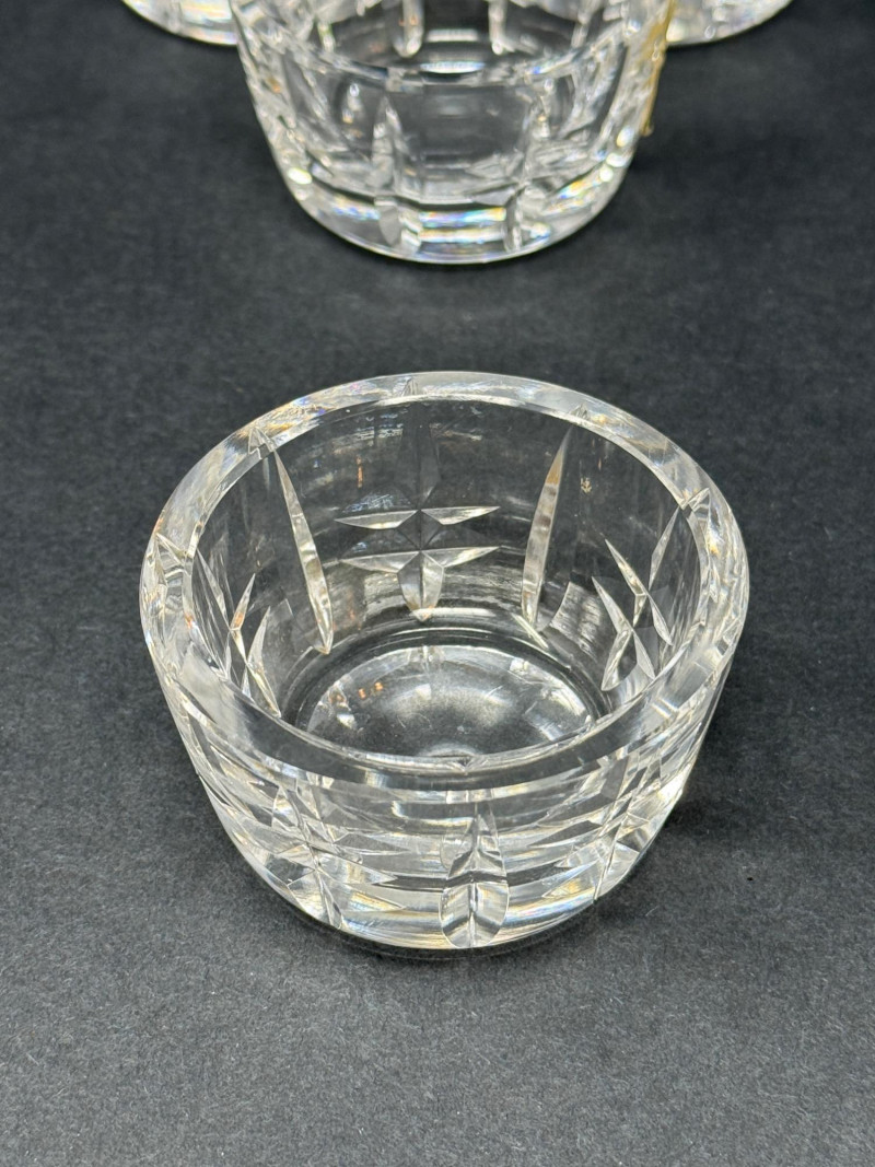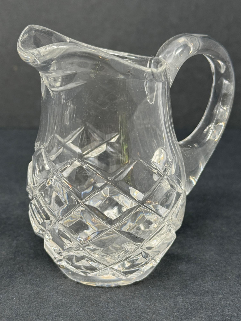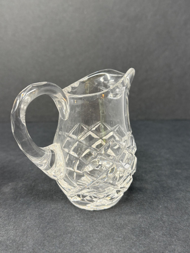 Waterford Miniature Crystal Set – Bowls, Creamer & Vase Set of finely crafted miniature pieces by Waterford, featuring the iconic cut crystal design and original green and gold foil stickers. Includes: Six matching bowls with starburst bases and vertical wedge cuts. One creamer with an arched handle and scalloped rim, featuring cross-hatch cuts around the body. One miniature vase (also used as a toothpick holder) with a flared rim and cross-cut body design. All pieces are made of clear lead crystal and exhibit classic Waterford craftsmanship in miniature form. Bowls: 1.5" H x 2.75" D Creamer: 3.75" H x 3.5" L x 2.5" W Vase (Toothpick Holder): 2.75" H x 2.25" D