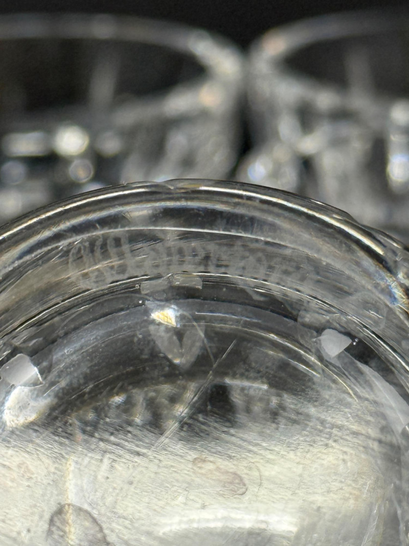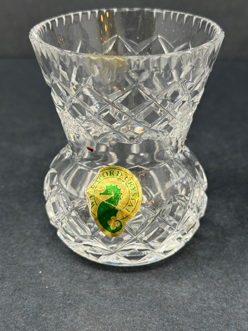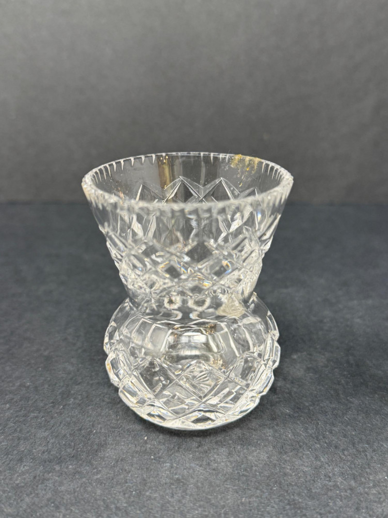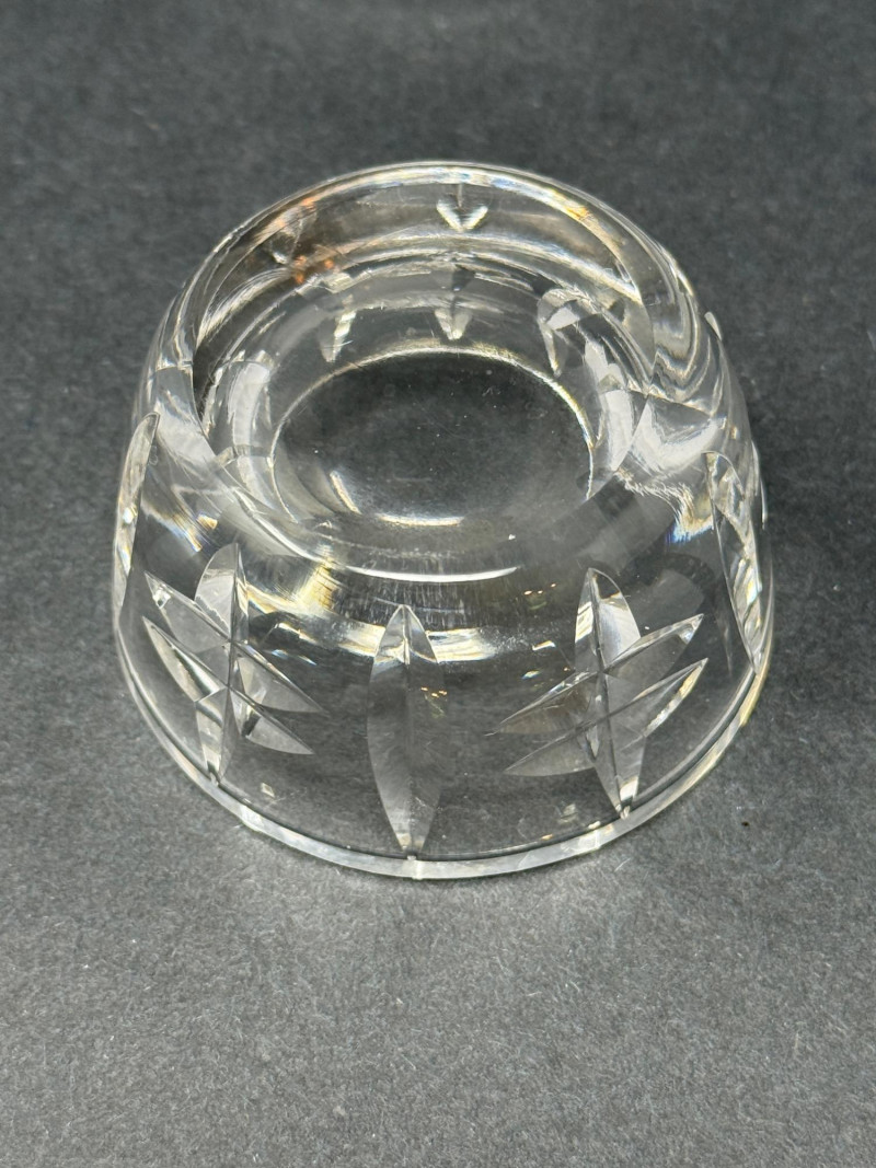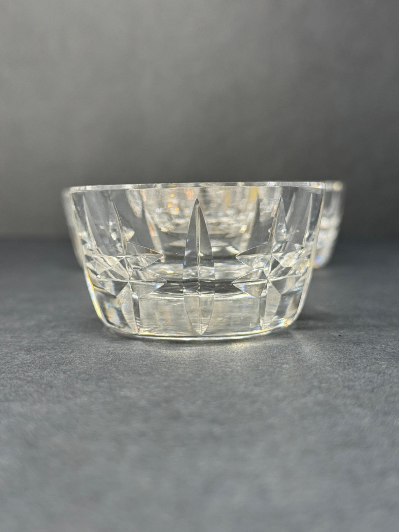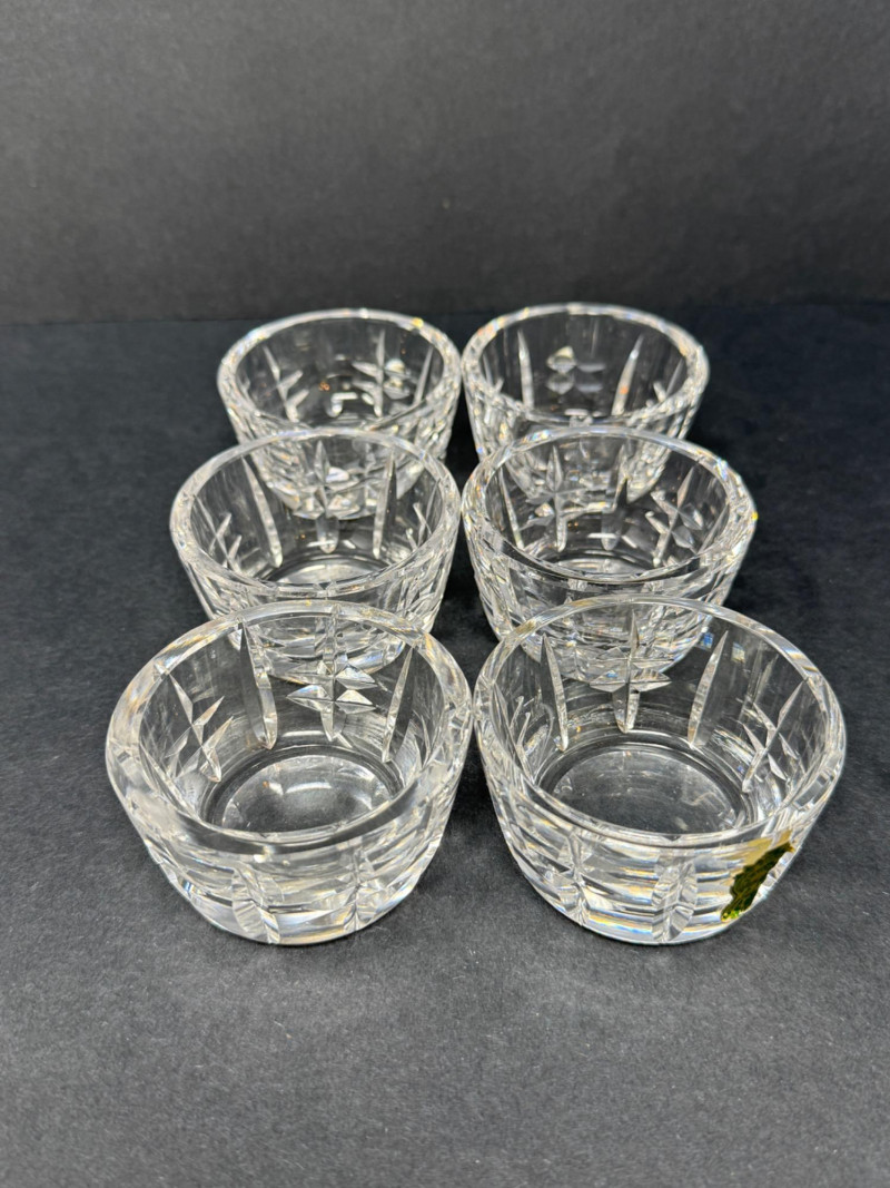 Waterford Miniature Crystal Set – Bowls, Creamer & Vase Set of finely crafted miniature pieces by Waterford, featuring the iconic cut crystal design and original green and gold foil stickers. Includes: Six matching bowls with starburst bases and vertical wedge cuts. One creamer with an arched handle and scalloped rim, featuring cross-hatch cuts around the body. One miniature vase (also used as a toothpick holder) with a flared rim and cross-cut body design. All pieces are made of clear lead crystal and exhibit classic Waterford craftsmanship in miniature form. Bowls: 1.5" H x 2.75" D Creamer: 3.75" H x 3.5" L x 2.5" W Vase (Toothpick Holder): 2.75" H x 2.25" D