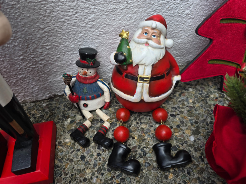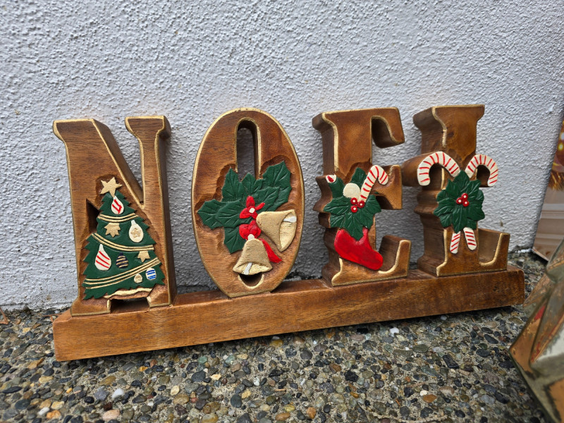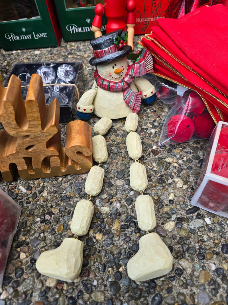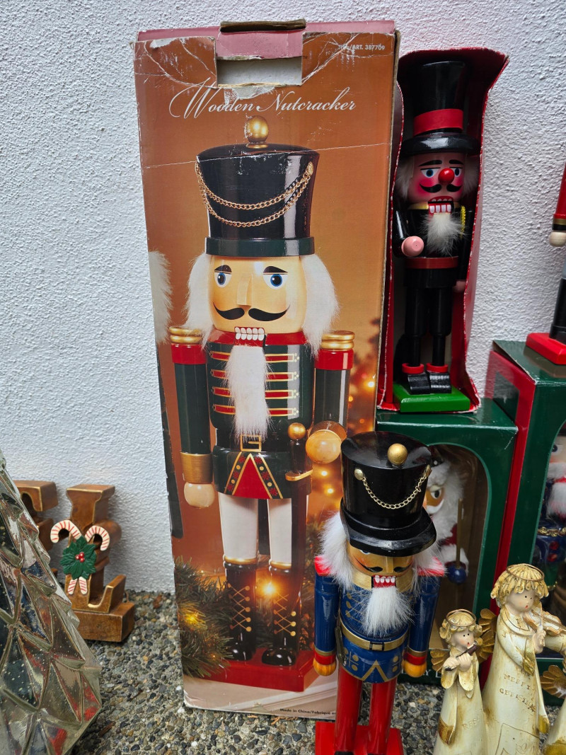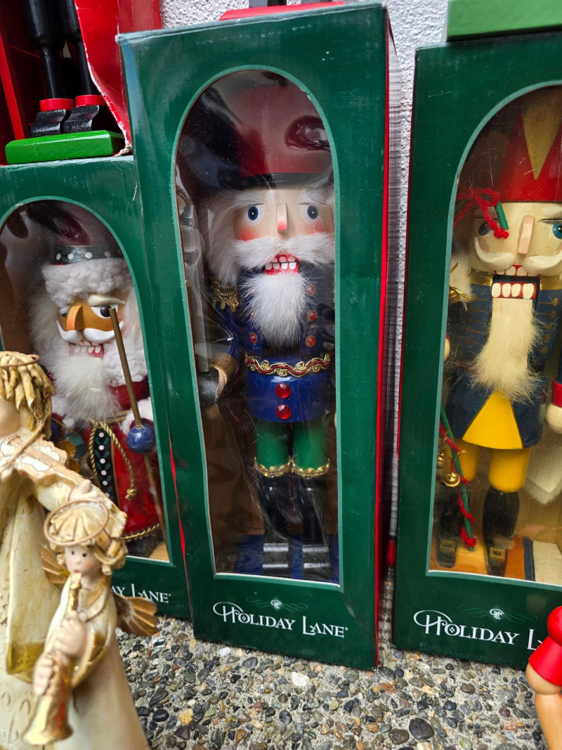 Christmas Lot #1 – Nutcracker Collection Assortment of holiday nutcrackers including boxed and unboxed figures, some by Holiday Lane. Includes various styles and sizes. Also includes small Christmas tree, wooden carved placards with holiday greetings, cloth napkins, small scented candles, ornaments, and a tea tin.