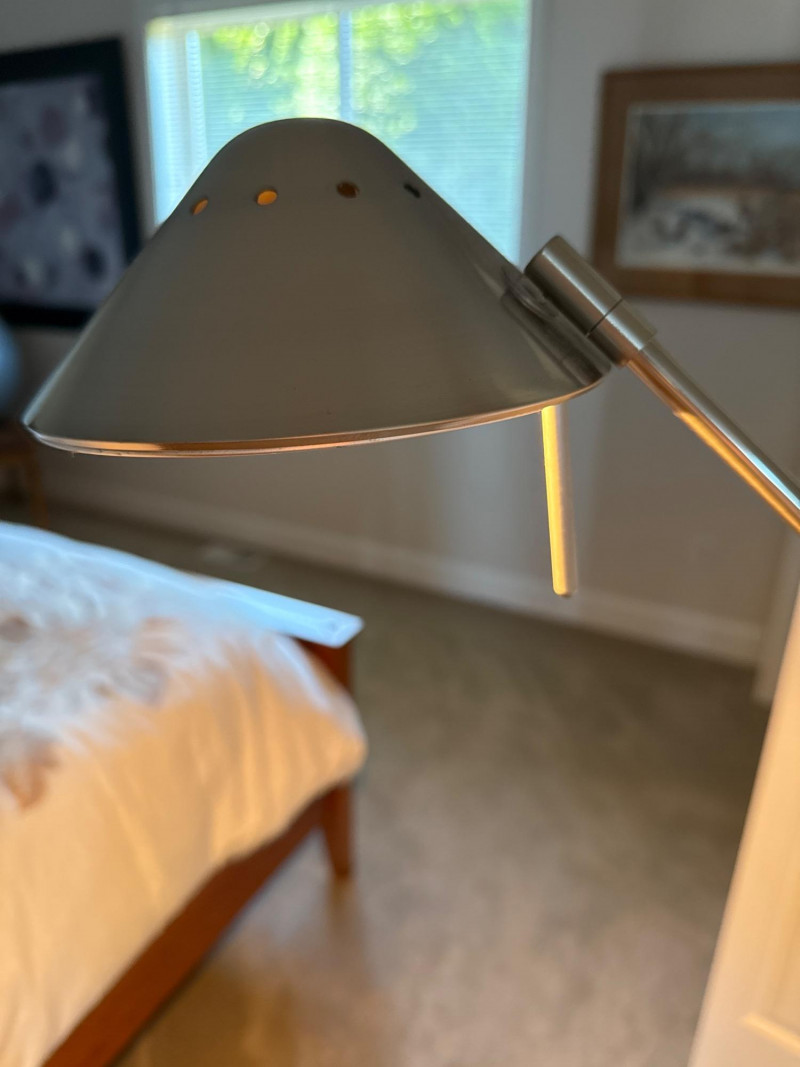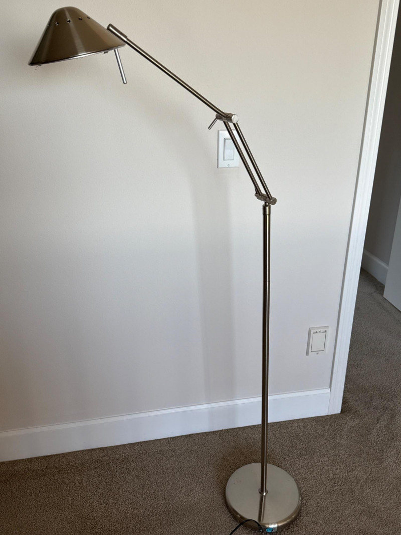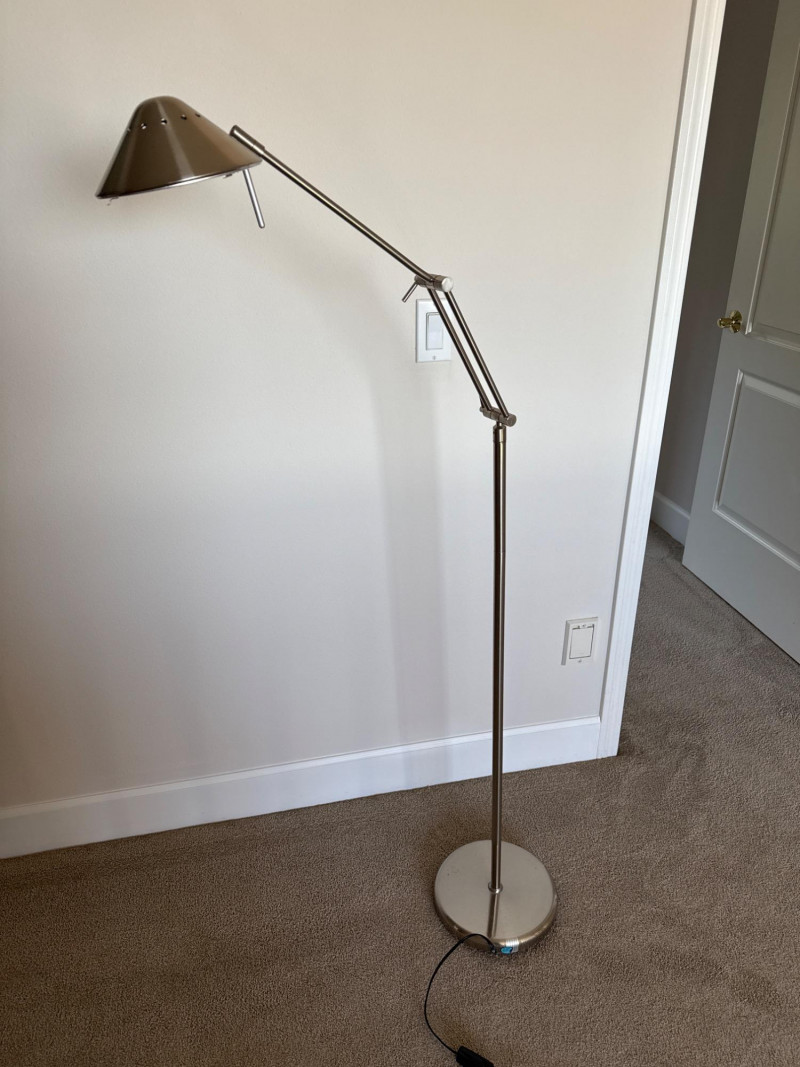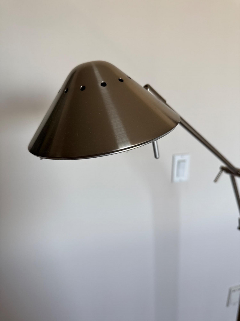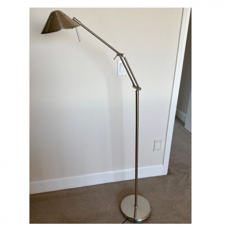 Modern Adjustable Chrome Floor Lamp Chrome-finished floor lamp with adjustable arm and conical shade. Features a pivoting head and articulating joints for directional lighting. Minimalist design with a round weighted base and floor switch.