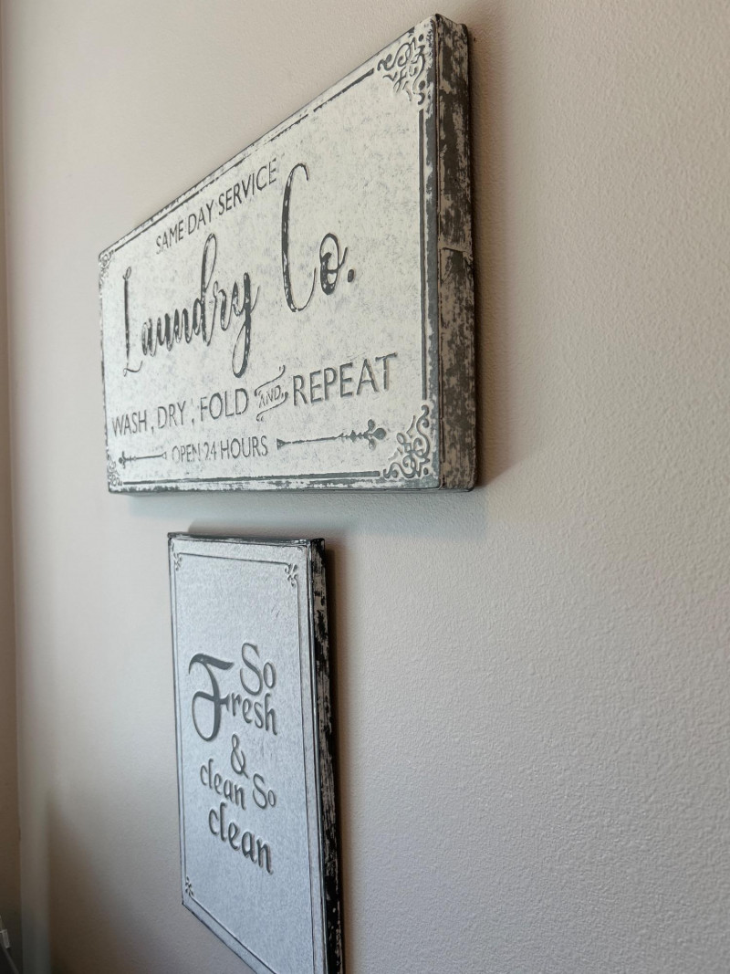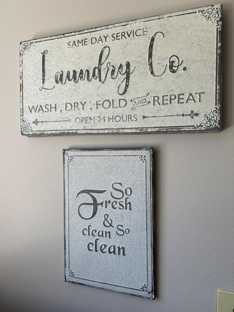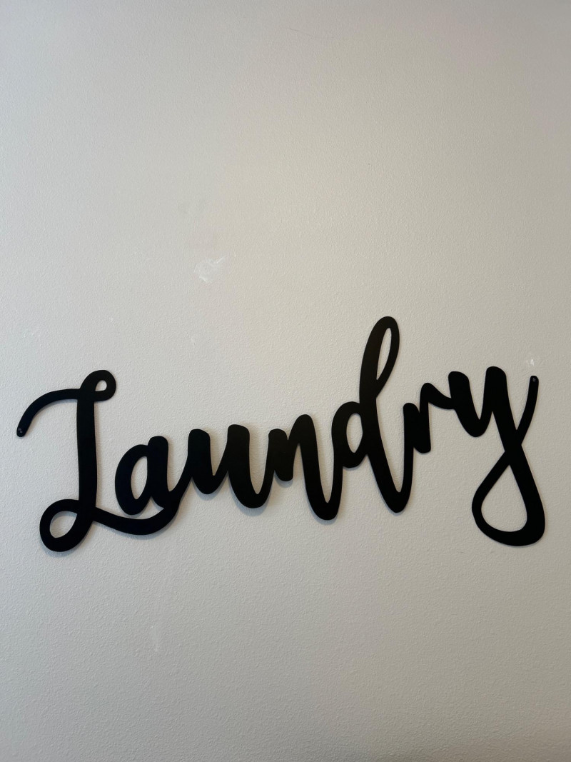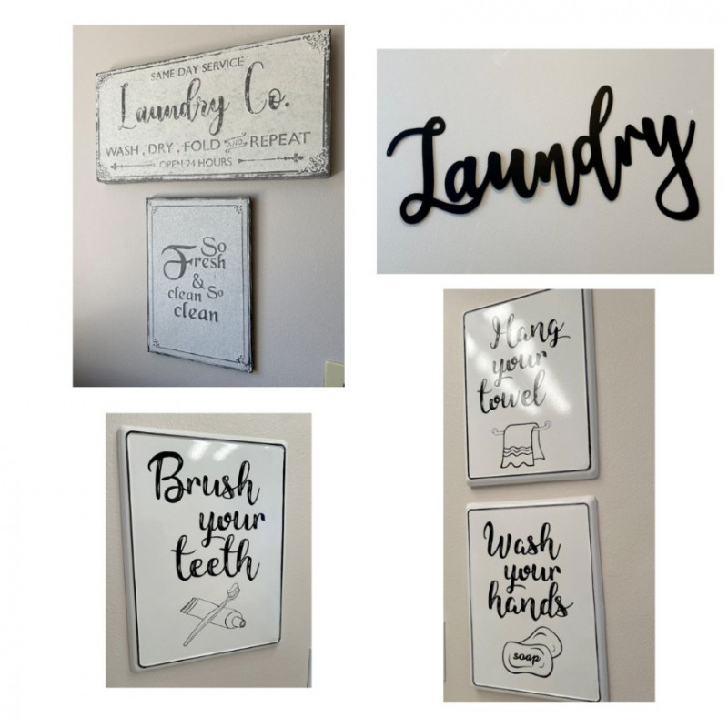 Whimsical Laundry and Bathroom Wall Decor – Mostly Metal Collection of six decorative wall pieces designed for laundry and bathroom areas. Most items are metal or metal-framed. The black “Laundry” cutout measures 30” across. Includes reminders and playful phrases for daily routines. Description: Decorative wall set featuring six total pieces Includes three bathroom-themed metal signs: “Brush your teeth” with toothbrush and toothpaste illustration “Hang your towel” with towel illustration “Wash your hands” with soap illustration Includes three laundry-themed pieces: “Laundry Co.” sign with “Same Day Service – Wash, Dry, Fold, Repeat” text “So Fresh & So Clean Clean” framed sign Black cursive “Laundry” cutout sign (30” wide) Mostly metal with some framed accents Suitable for laundry rooms and bathrooms