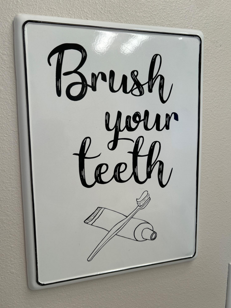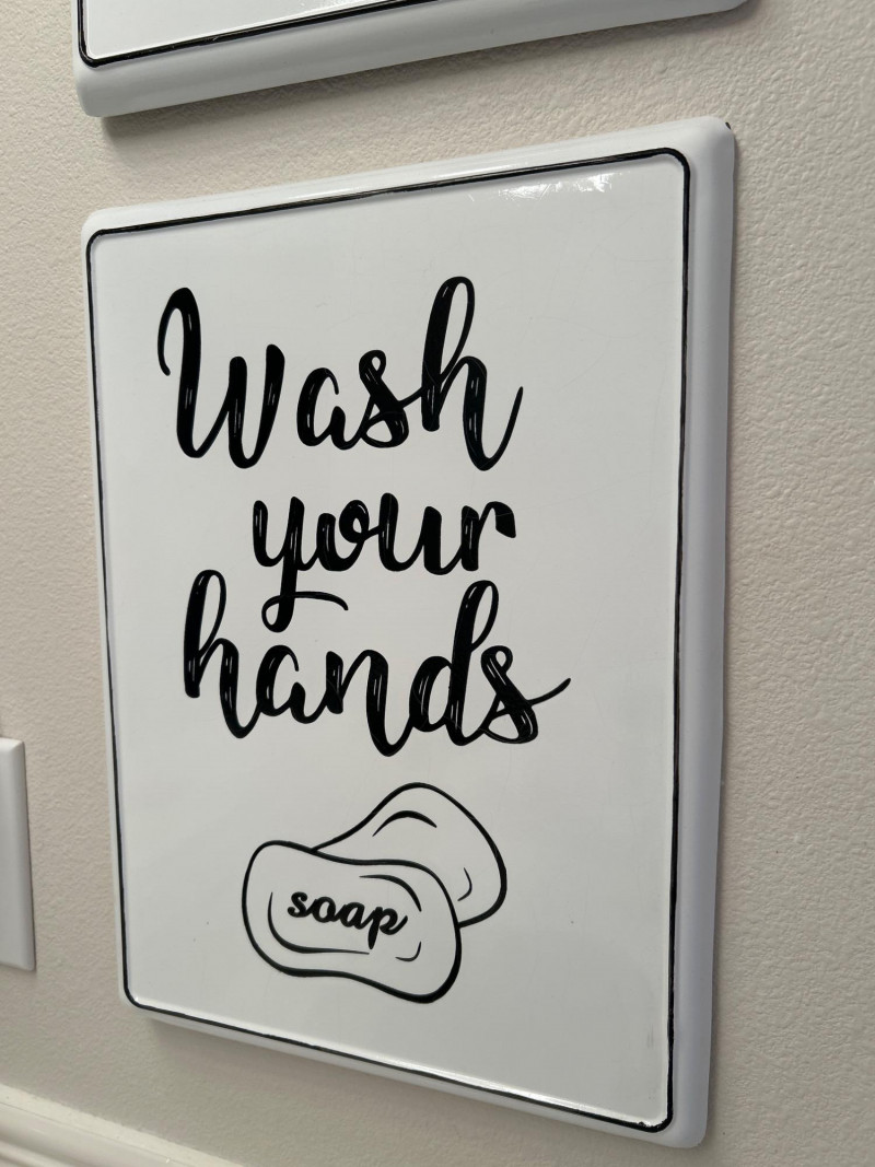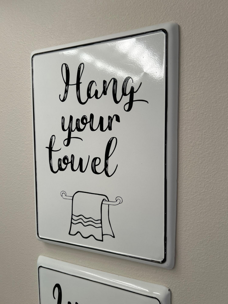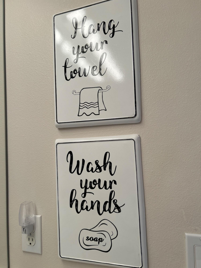 Whimsical Laundry and Bathroom Wall Decor – Mostly Metal Collection of six decorative wall pieces designed for laundry and bathroom areas. Most items are metal or metal-framed. The black “Laundry” cutout measures 30” across. Includes reminders and playful phrases for daily routines. Description: Decorative wall set featuring six total pieces Includes three bathroom-themed metal signs: “Brush your teeth” with toothbrush and toothpaste illustration “Hang your towel” with towel illustration “Wash your hands” with soap illustration Includes three laundry-themed pieces: “Laundry Co.” sign with “Same Day Service – Wash, Dry, Fold, Repeat” text “So Fresh & So Clean Clean” framed sign Black cursive “Laundry” cutout sign (30” wide) Mostly metal with some framed accents Suitable for laundry rooms and bathrooms