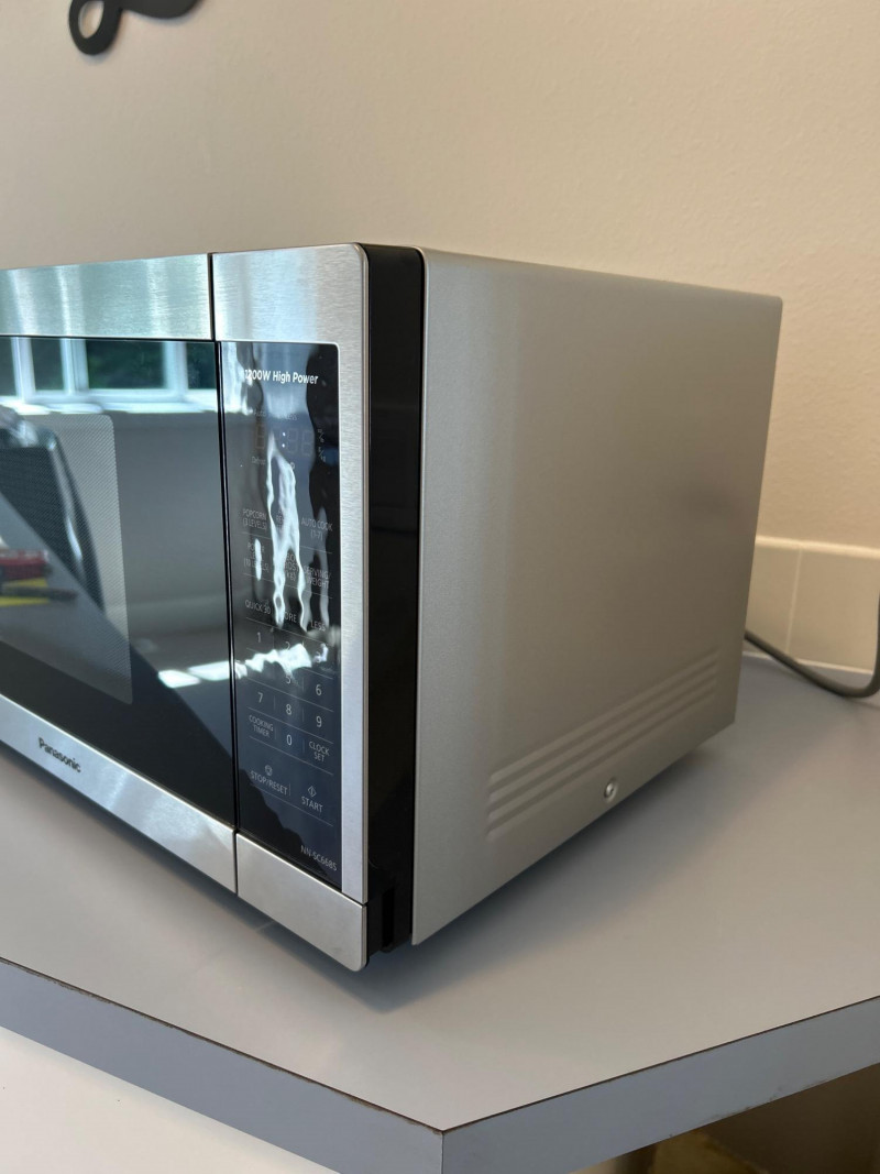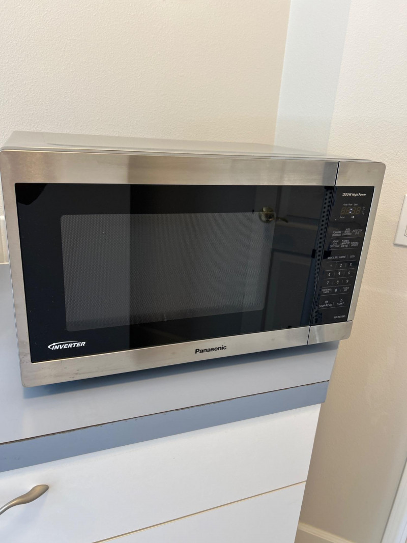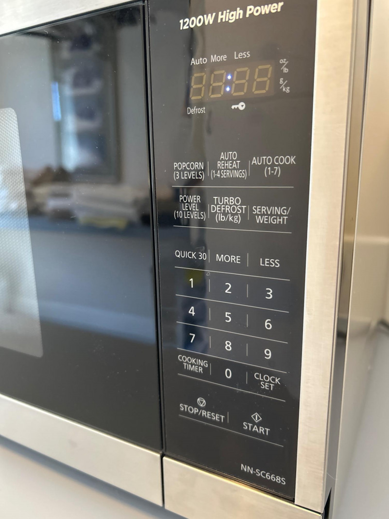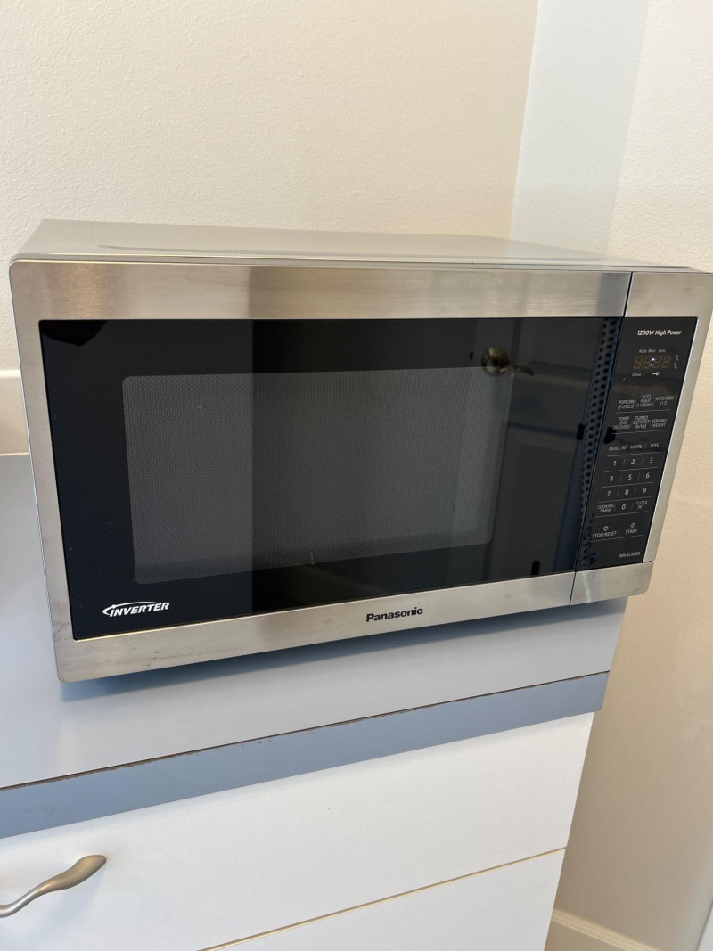 Panasonic Inverter Microwave Stainless steel Panasonic Inverter microwave with digital control panel and rotating glass turntable. Features multiple auto-cook presets, defrost modes, and quick timer functions. High-efficiency 1200-watt output. Rear label notes it is not for built-in installation. Model and safety labels are visible inside the door. Dimensions: 20.5" W x 17" D x 12.25" H