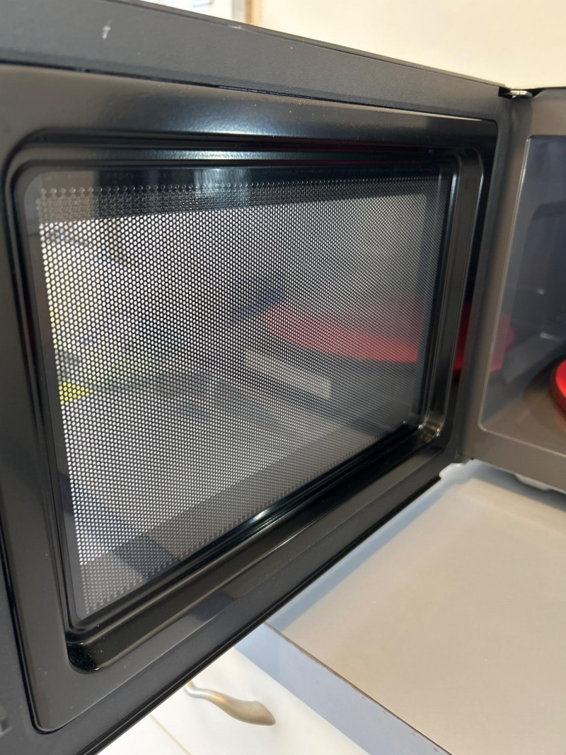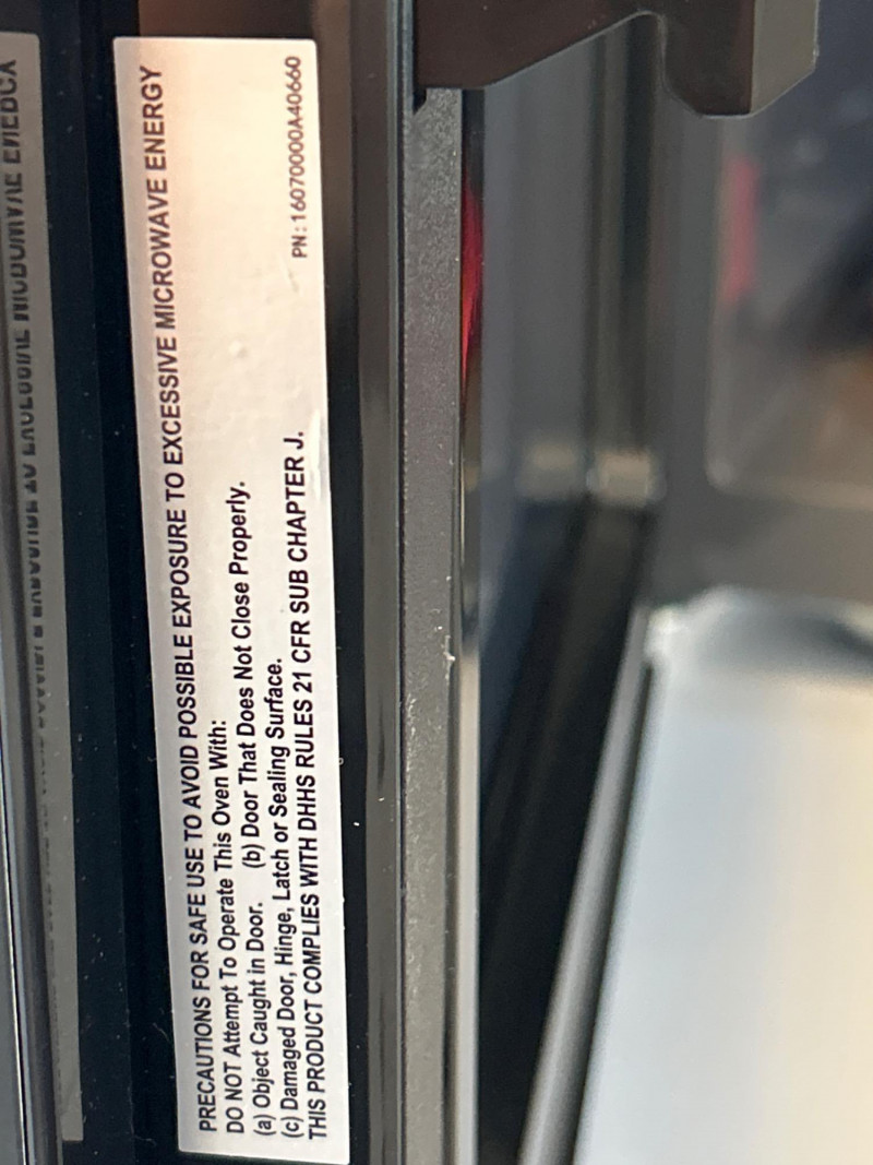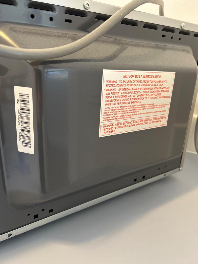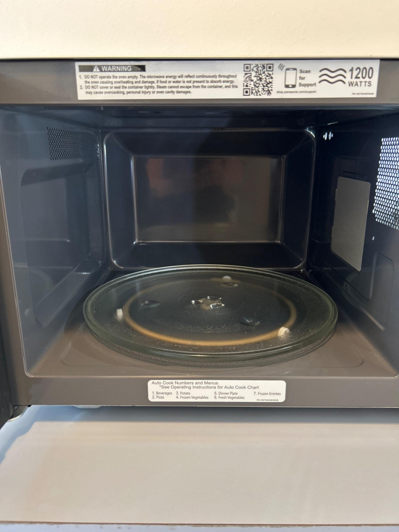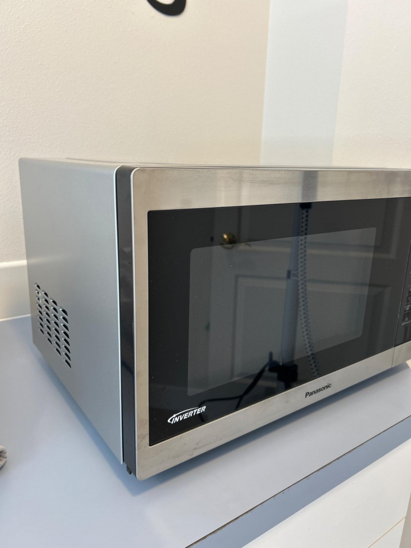 Panasonic Inverter Microwave Stainless steel Panasonic Inverter microwave with digital control panel and rotating glass turntable. Features multiple auto-cook presets, defrost modes, and quick timer functions. High-efficiency 1200-watt output. Rear label notes it is not for built-in installation. Model and safety labels are visible inside the door. Dimensions: 20.5" W x 17" D x 12.25" H