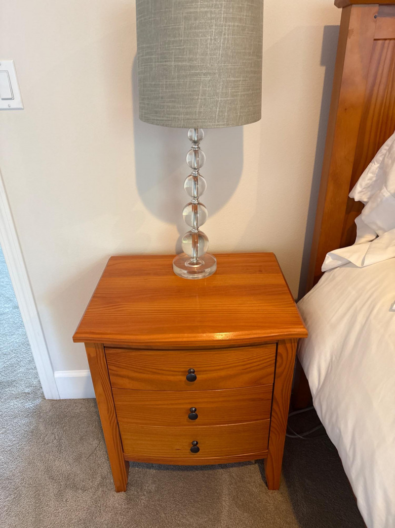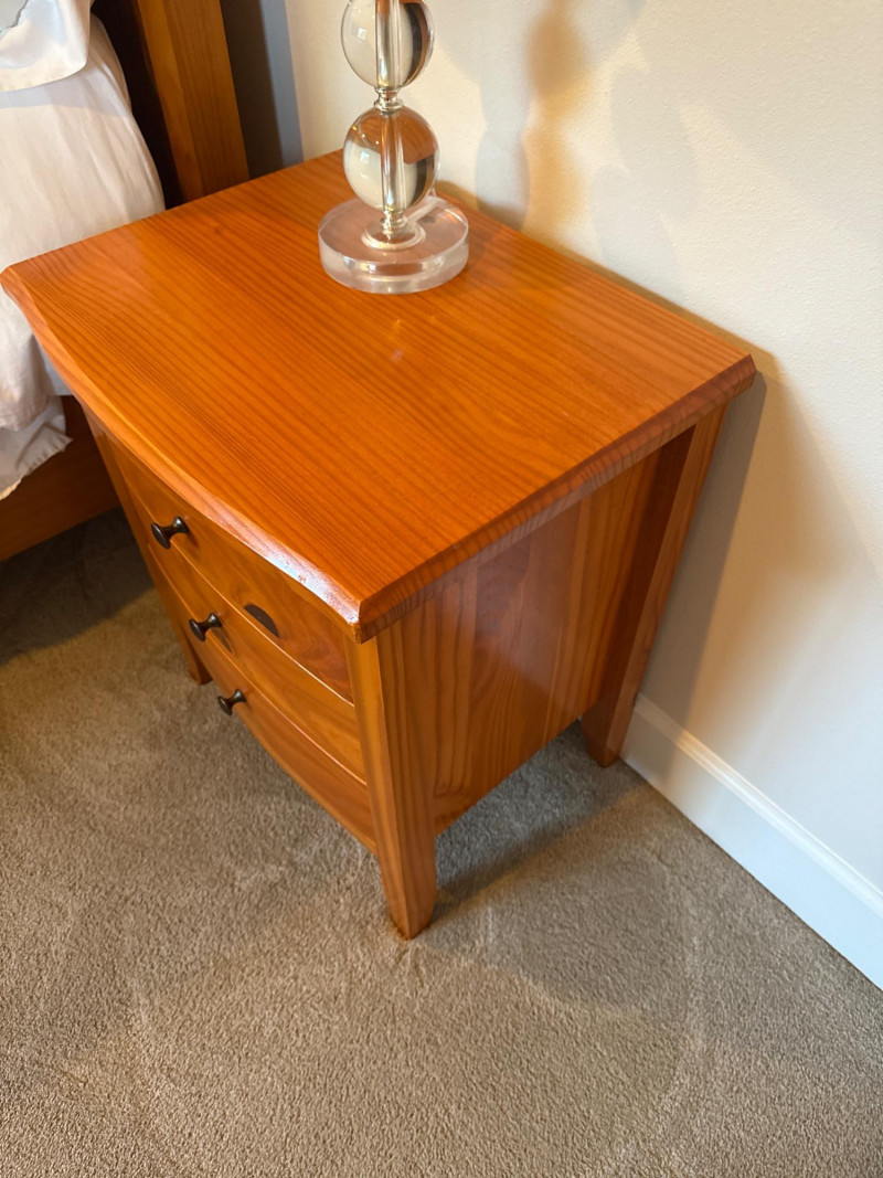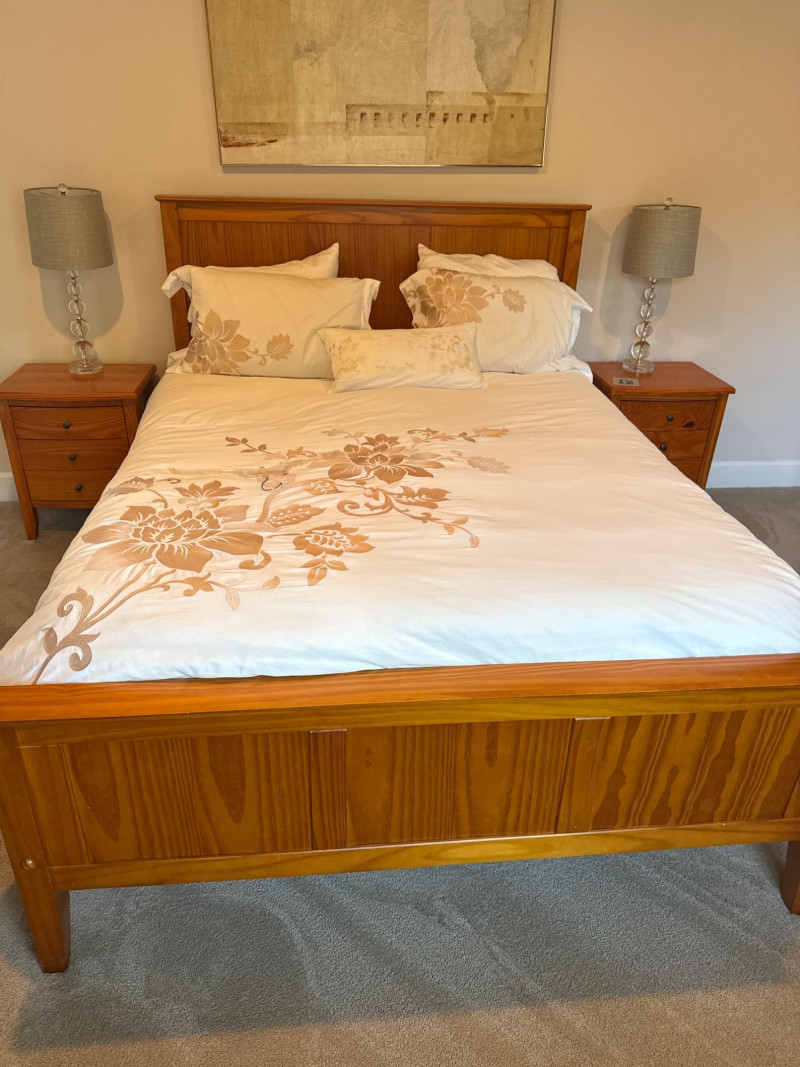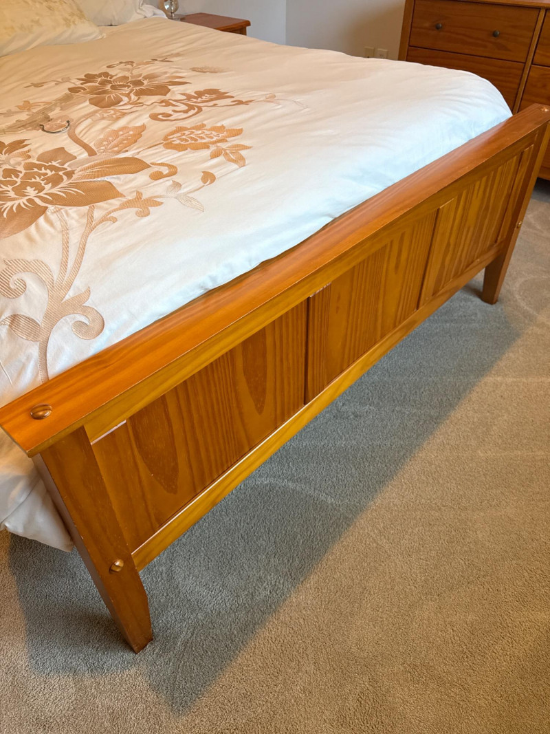 Quaker Style Queen Bed and Nightstand With Like New Mattress Set includes a Quaker-style queen bed frame with headboard and footboard, a matching pair of wooden nightstands with three drawers each, and a like-new queen mattress. The bed frame features paneled wood construction and warm finish. Nightstands have slightly curved fronts, black hardware, and sit on tapered legs.
