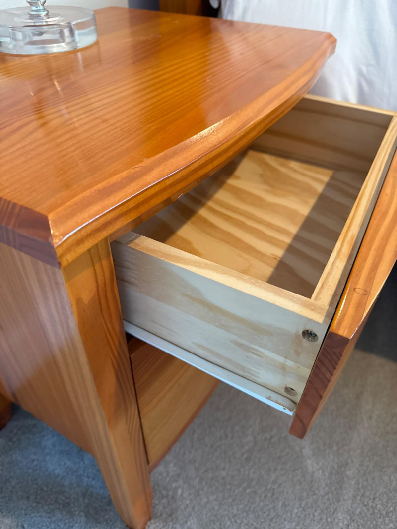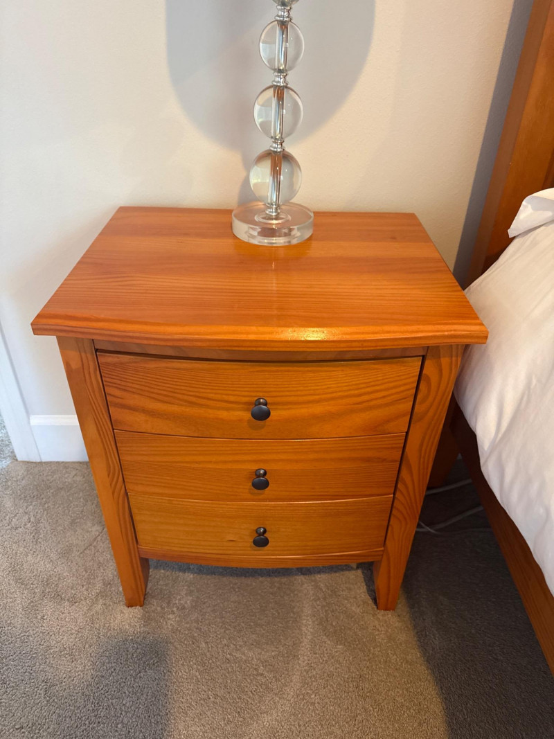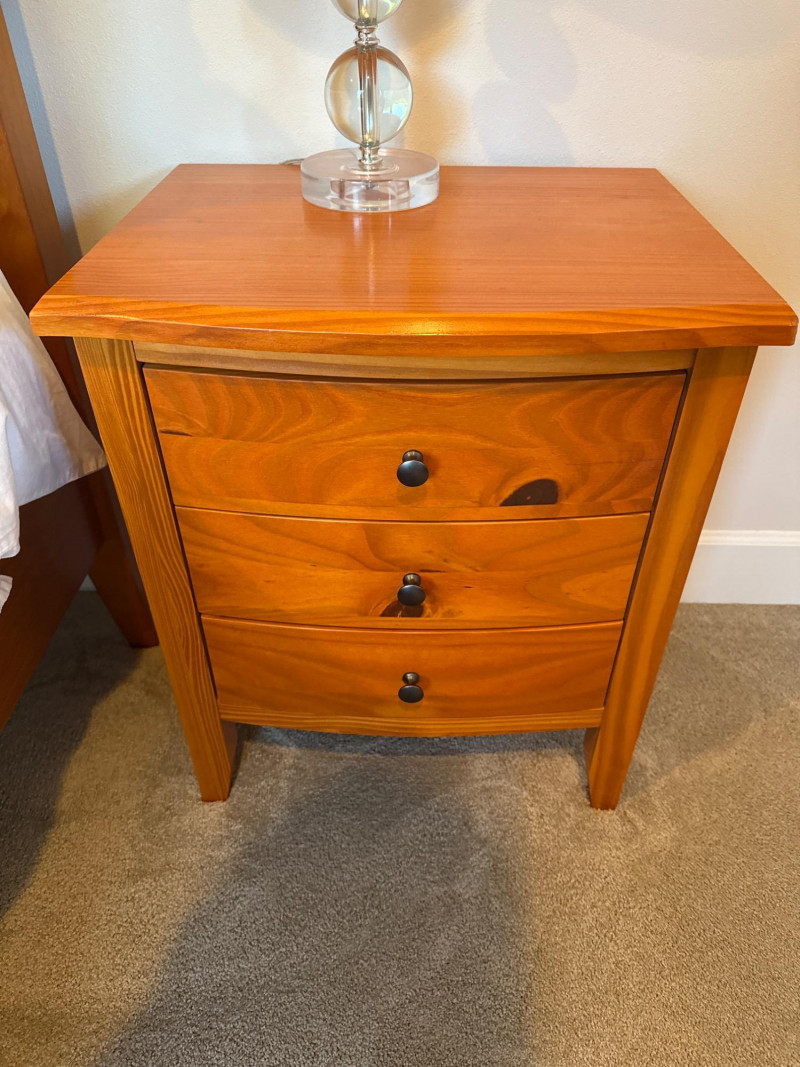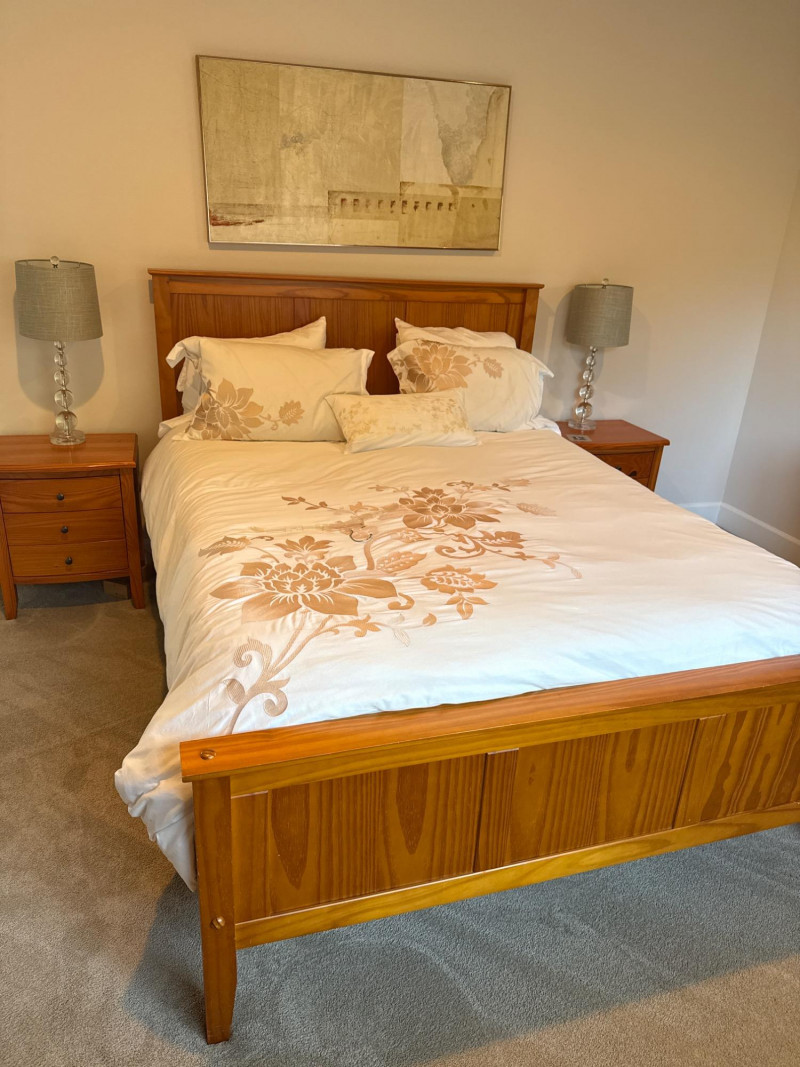 Quaker Style Queen Bed and Nightstand With Like New Mattress Set includes a Quaker-style queen bed frame with headboard and footboard, a matching pair of wooden nightstands with three drawers each, and a like-new queen mattress. The bed frame features paneled wood construction and warm finish. Nightstands have slightly curved fronts, black hardware, and sit on tapered legs.