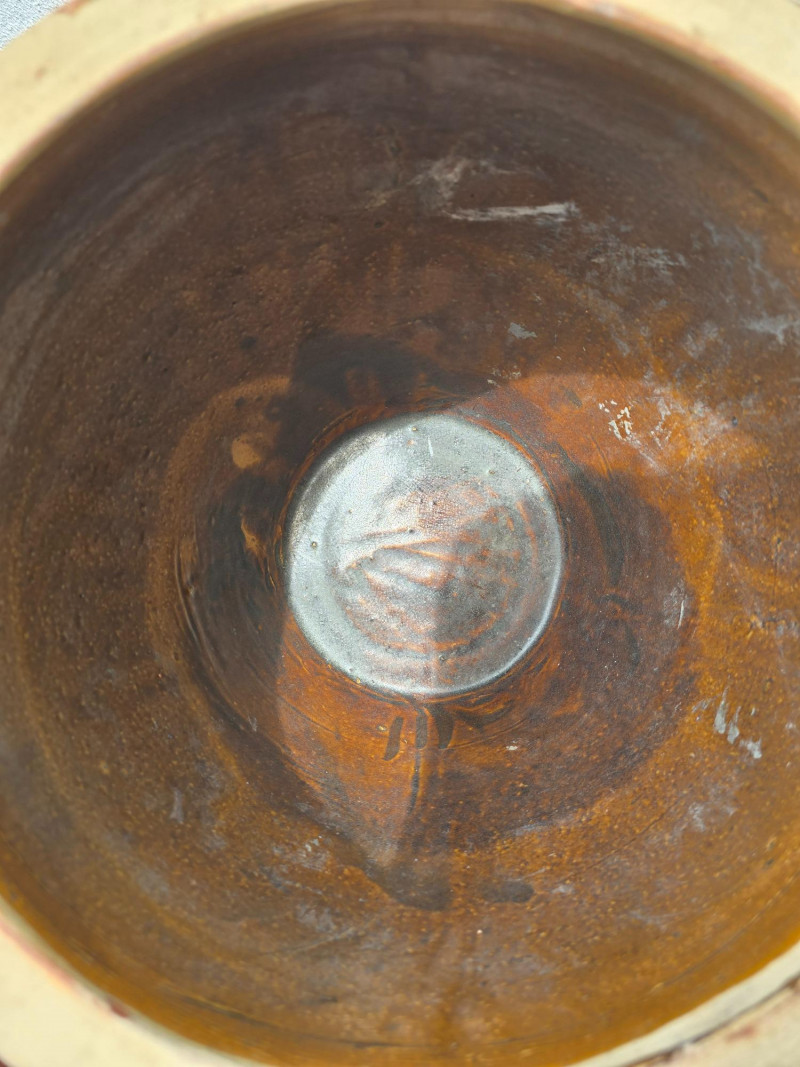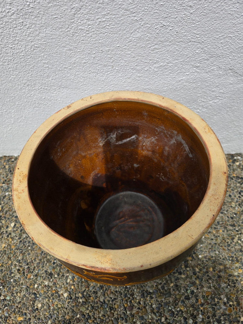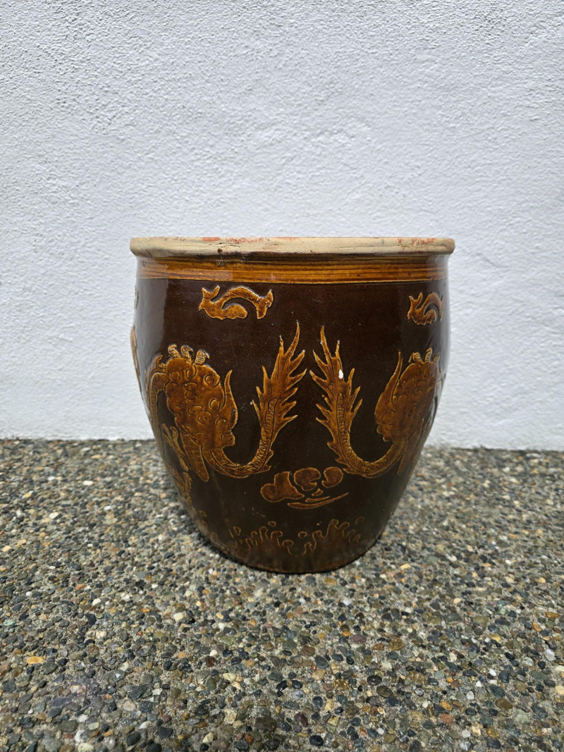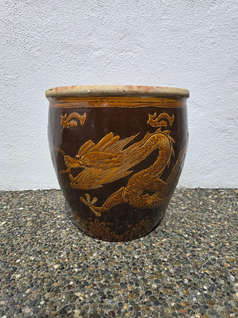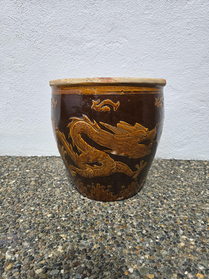 Ceramic Eastern Dragon Pot Brown glazed earthenware planter featuring raised Chinese dragon motifs on opposite sides. The interior shows kiln marks and signs of age. Traditional in style, suitable for decorative or functional planting use. Dimensions: