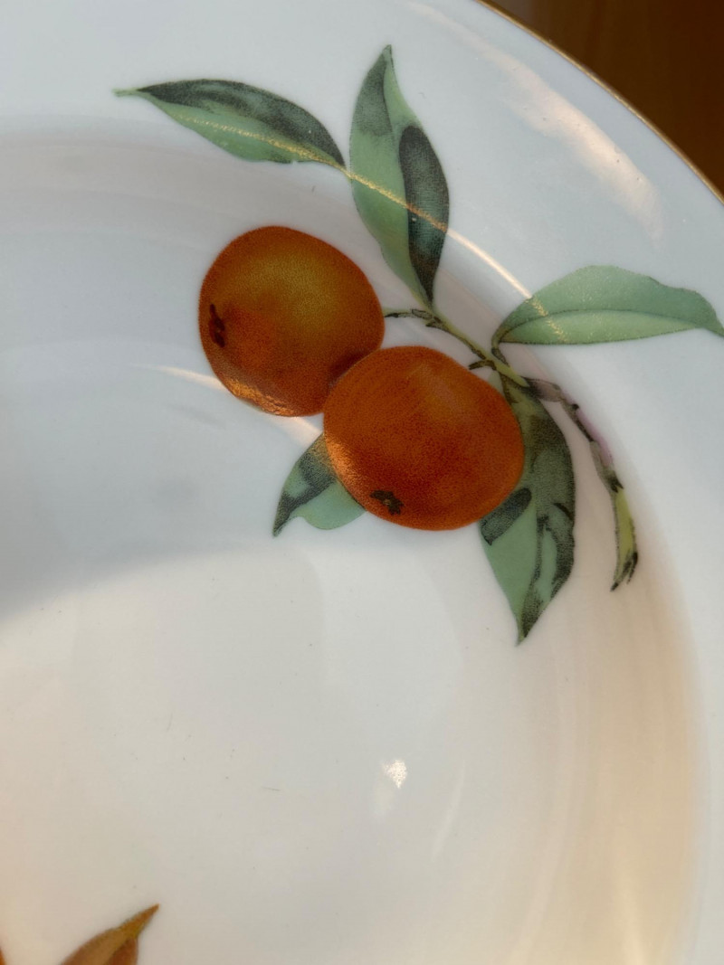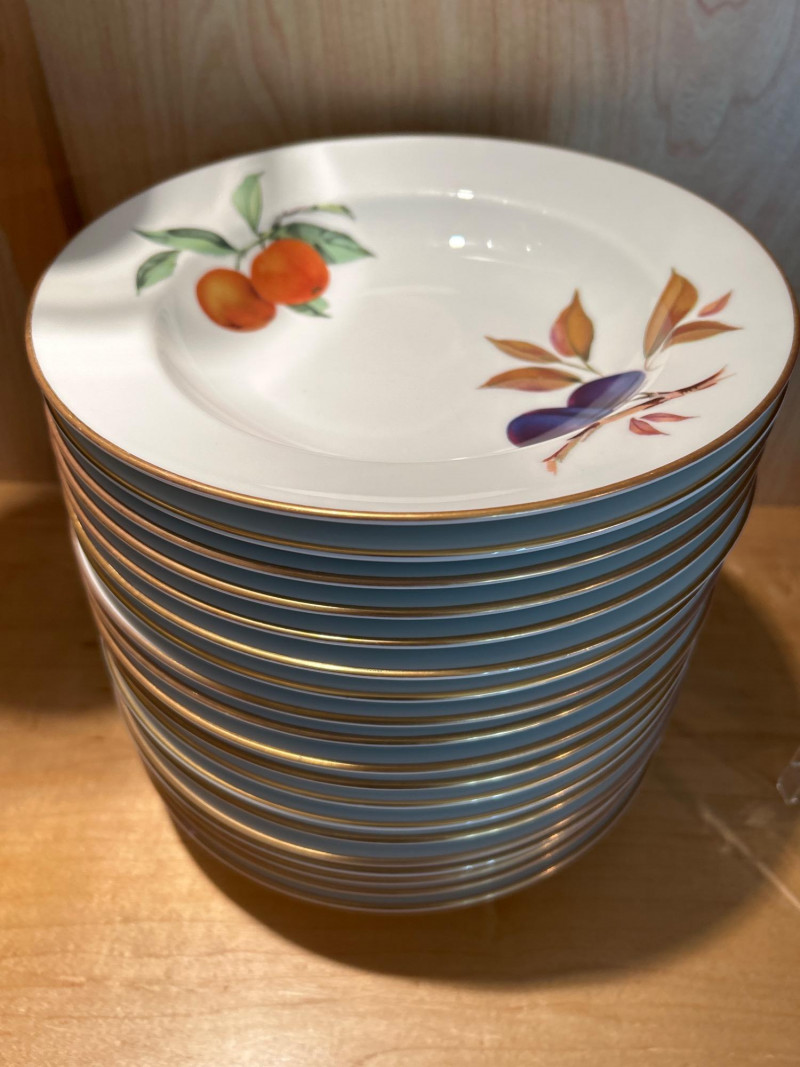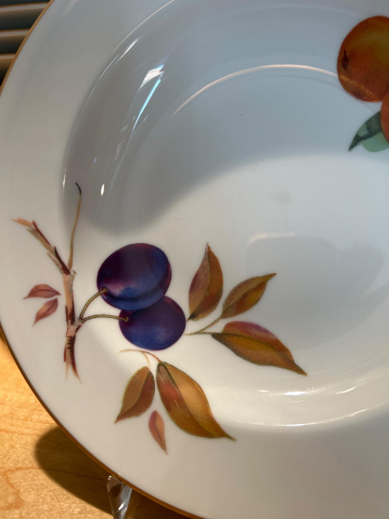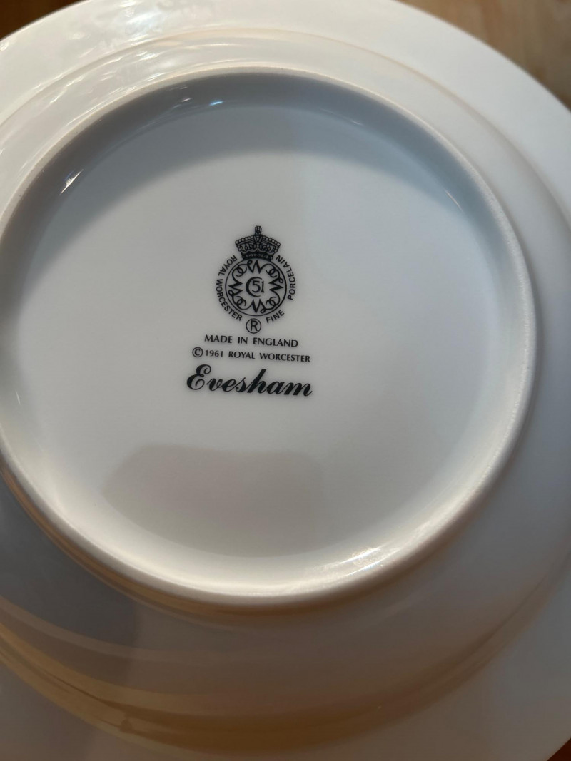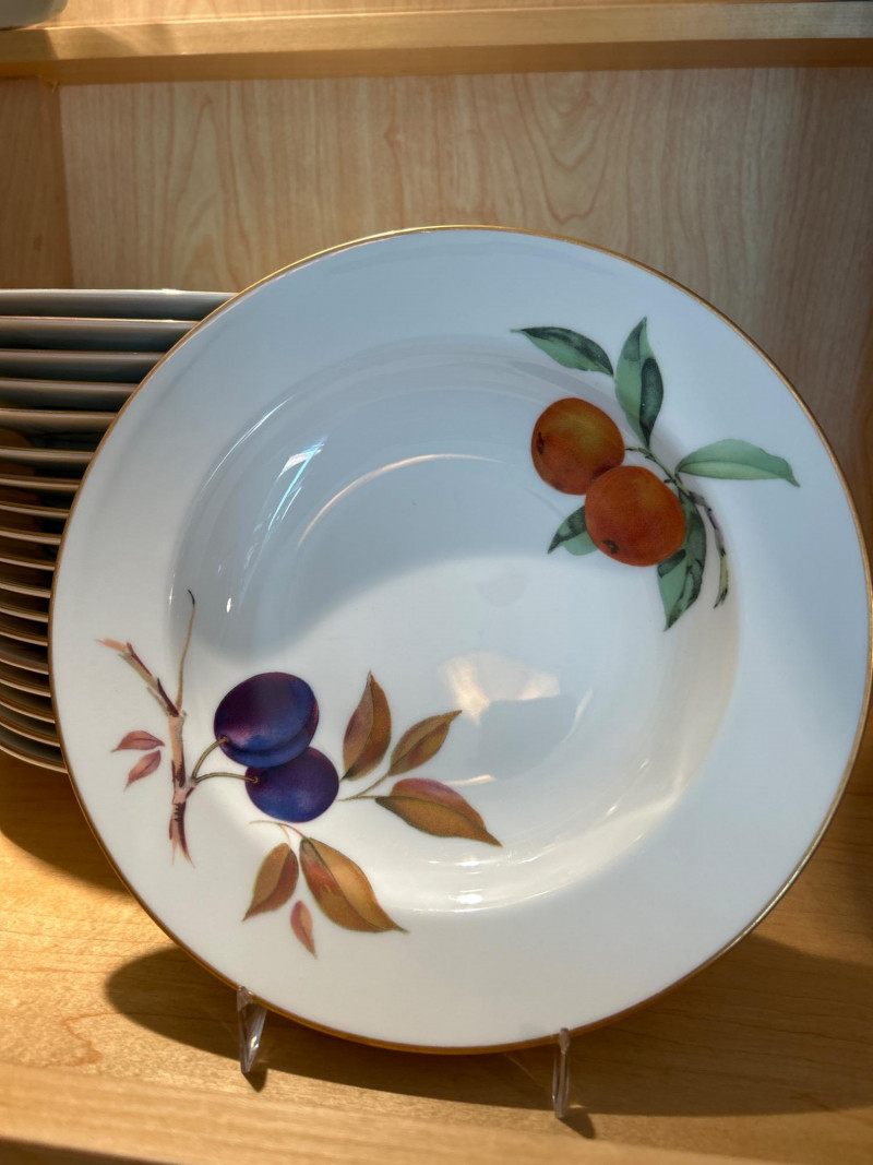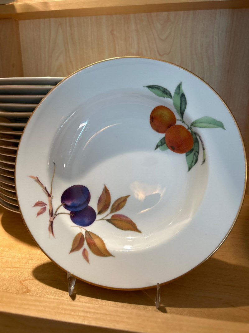 Set of 19 Royal Worcester Evesham Gold Soup Bowls – 9" Diameter Set of nineteen fine porcelain soup bowls from the Royal Worcester Evesham Gold collection. Each bowl features hand-painted fruit motifs and gold trim. Marked with the 1961 Royal Worcester backstamp and made in England. Diameter: 9"