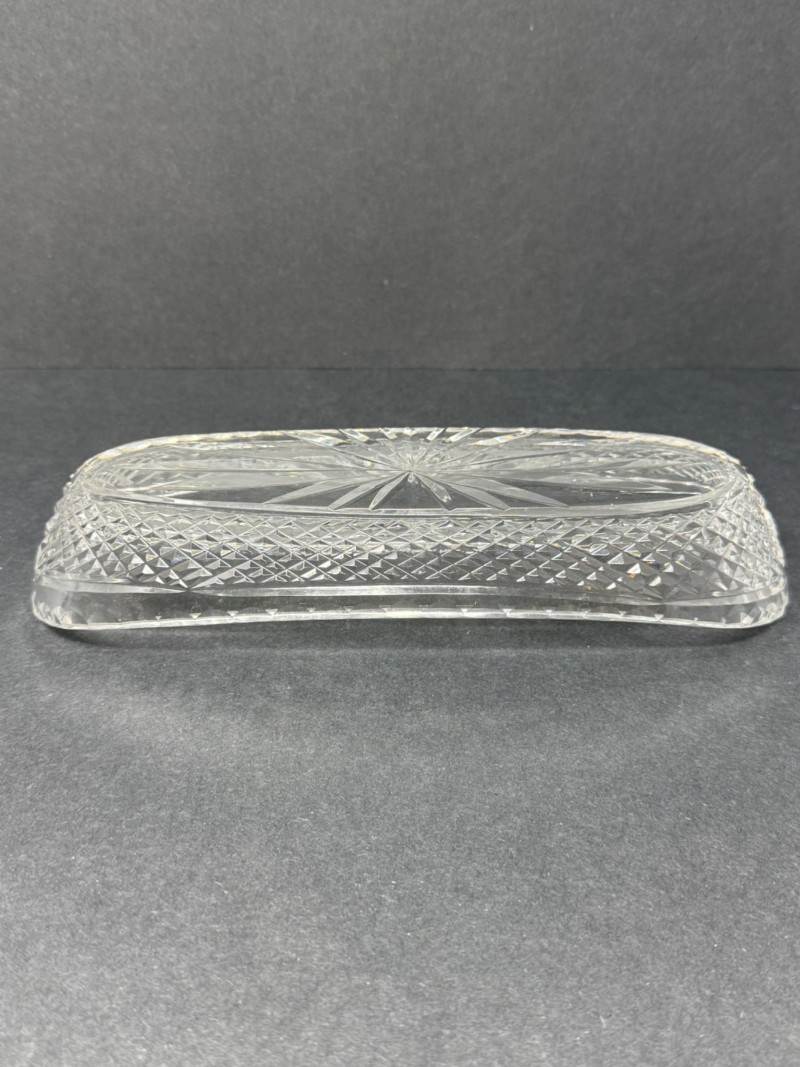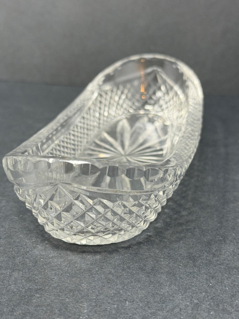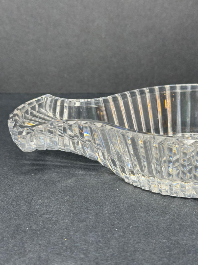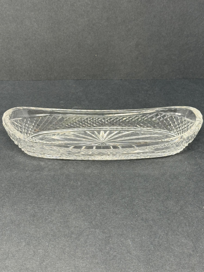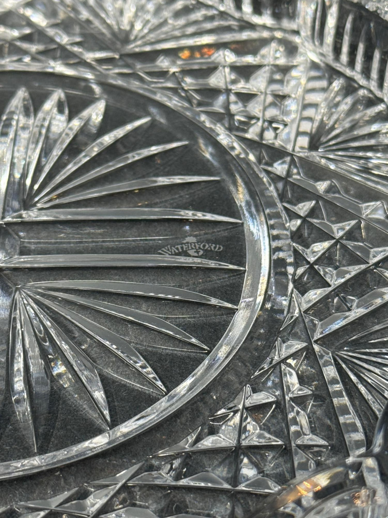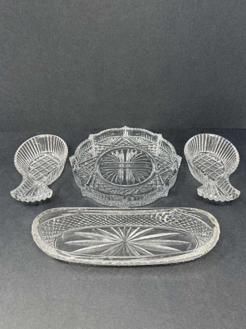 Waterford Crystal 4-Piece Set Clear pressed or cut glass set featuring traditional Waterford-style patterns such as crosshatching, fans, and starburst motifs. The set is comprised of functional and decorative table pieces, each with refined detailing and weight typical of quality crystal. Set includes: One round serving dish with scalloped rim and intricate starburst cut on the base. The sides are decorated with alternating crosshatch and vertical panel designs. One elongated oval tray with gently sloped sides, raised diamond cut border, and starburst pattern on the base. Suitable as a relish or bread tray. One spoon rest with a flared edge, oval basin, and detailed radial cuts. Ideal for serving utensils or small snacks. Two shell-form dishes with vertical ribbing and pedestal bases. Can be used for serving condiments, nuts, or as decorative accent pieces. Each piece is crafted from clear crystal with high clarity and reflective facets. Measurements: Round dish: 8" diameter x 1.25" height Oval tray: 9.5" width x 3.5" length x 2" height Spoon rest: 6.5" length x 3.5" width x 1.5" height