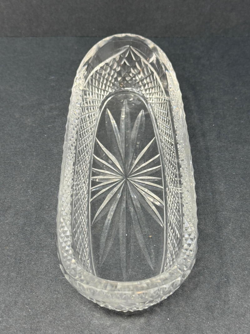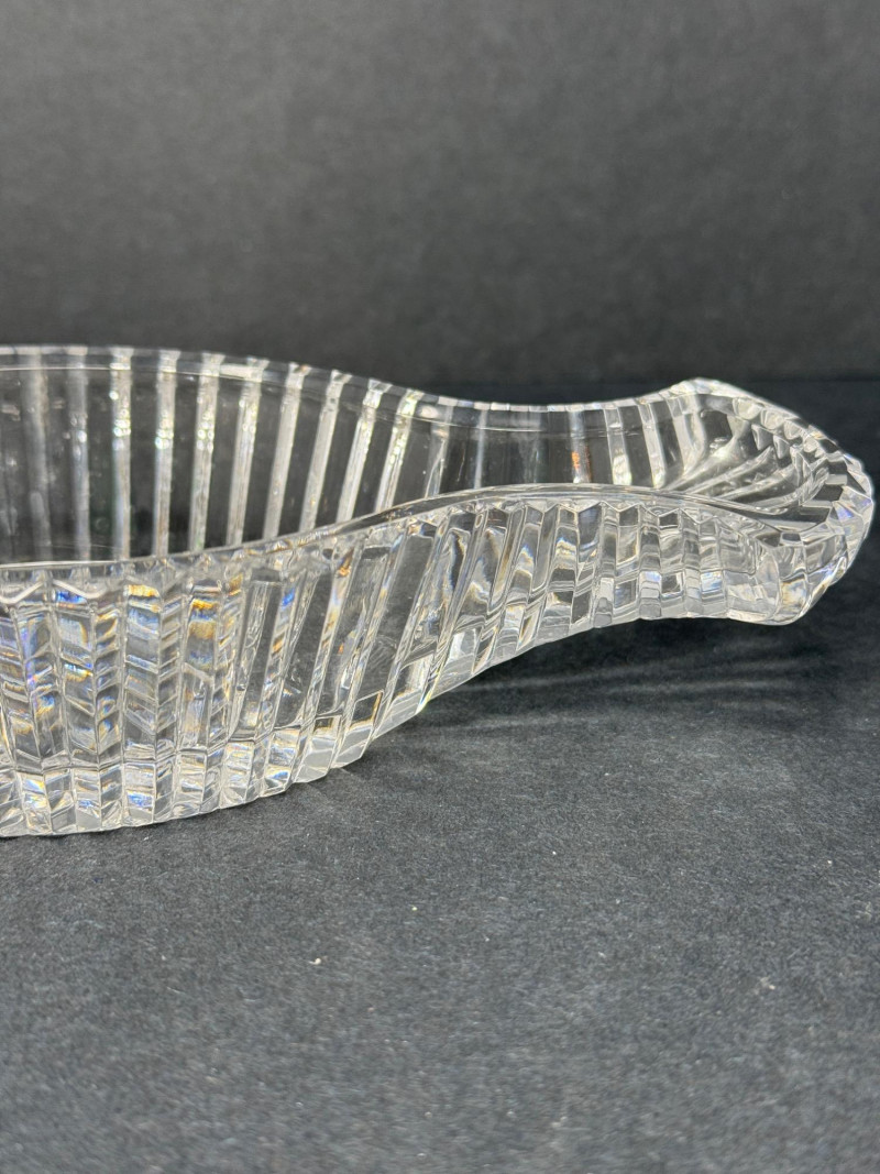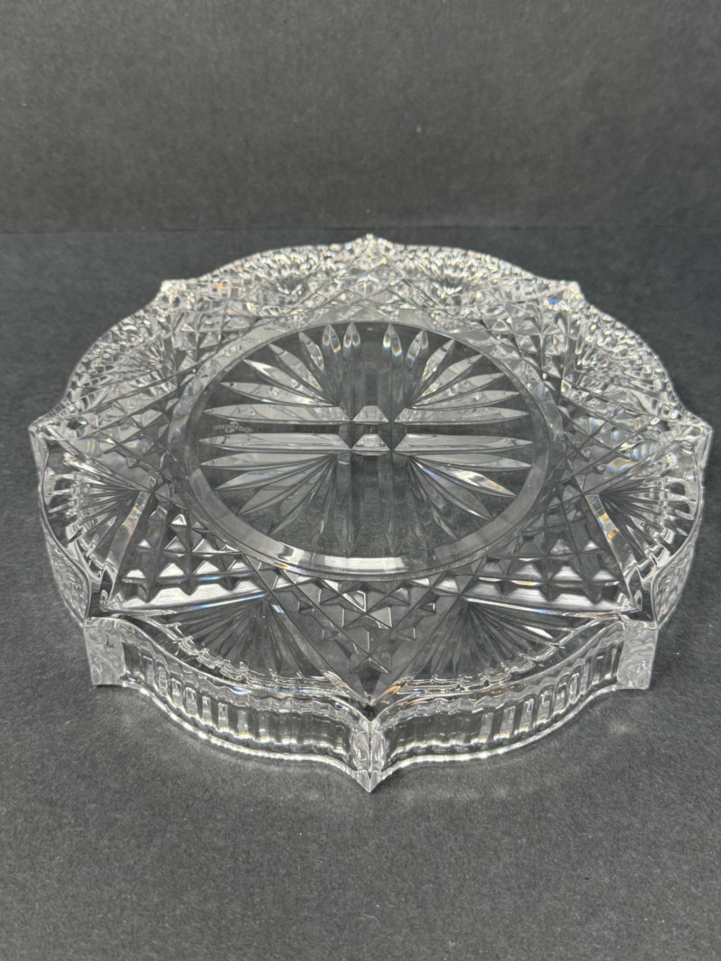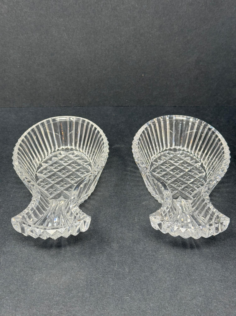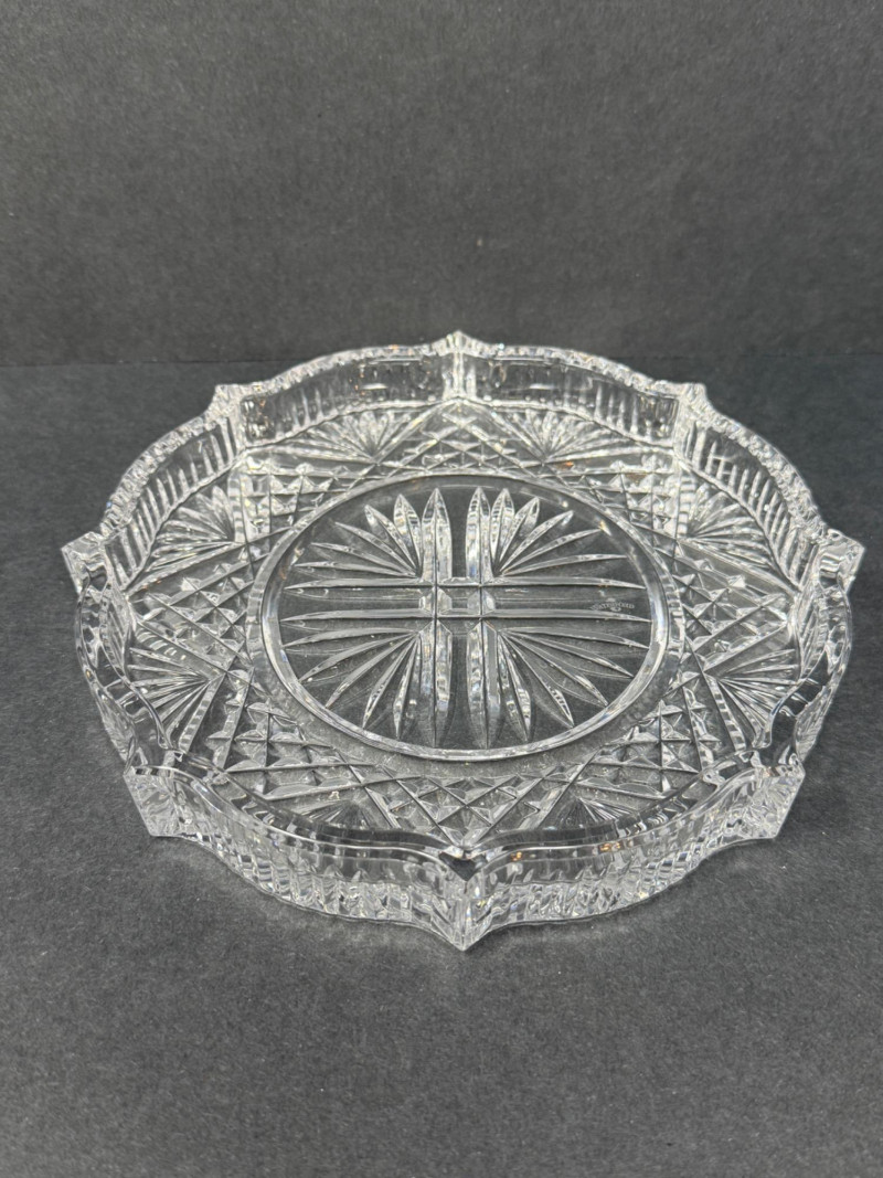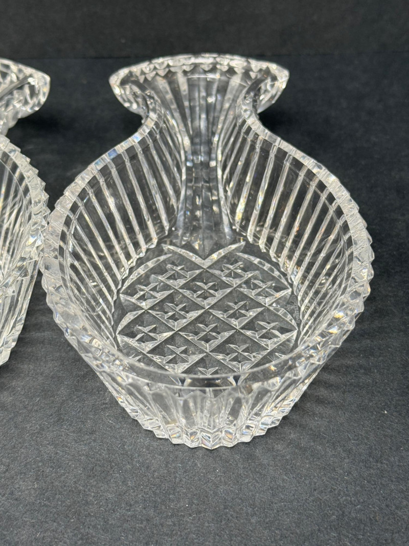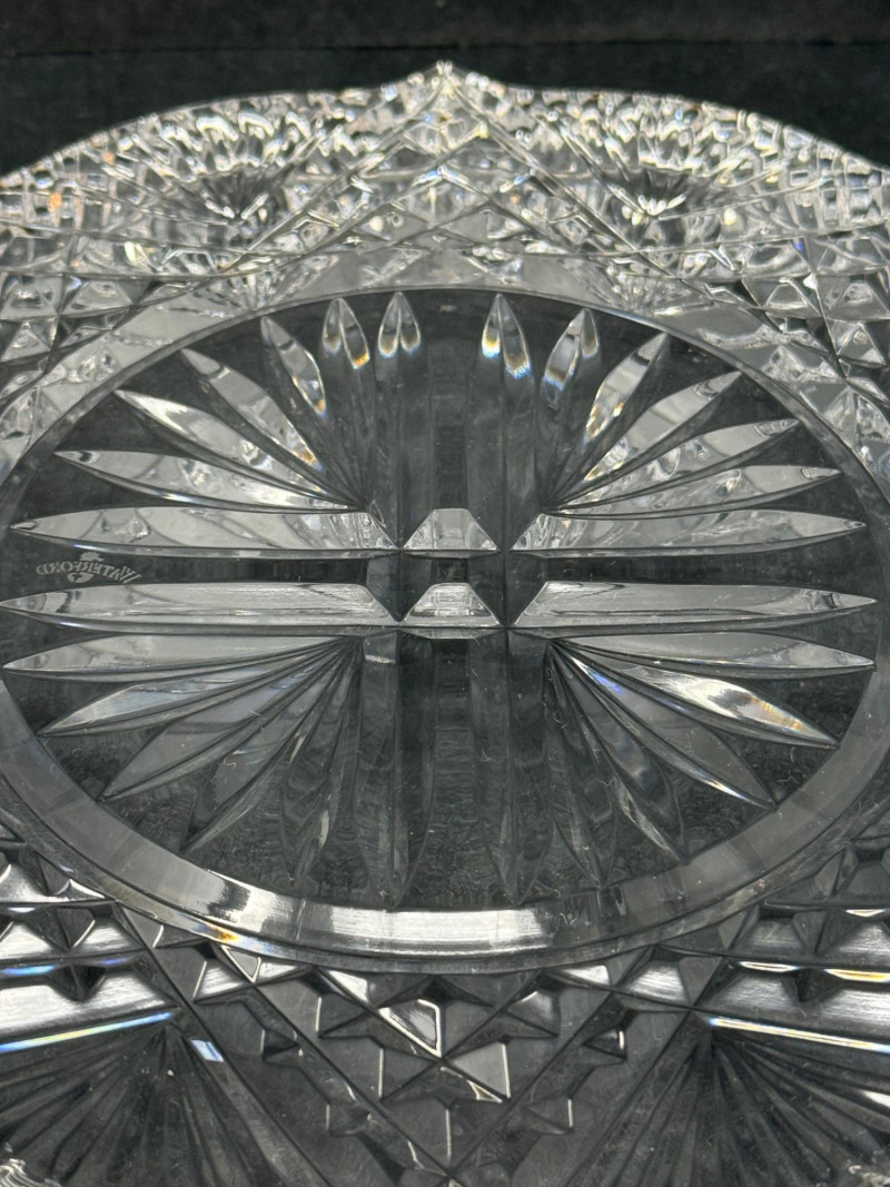 Waterford Crystal 4-Piece Set Clear pressed or cut glass set featuring traditional Waterford-style patterns such as crosshatching, fans, and starburst motifs. The set is comprised of functional and decorative table pieces, each with refined detailing and weight typical of quality crystal. Set includes: One round serving dish with scalloped rim and intricate starburst cut on the base. The sides are decorated with alternating crosshatch and vertical panel designs. One elongated oval tray with gently sloped sides, raised diamond cut border, and starburst pattern on the base. Suitable as a relish or bread tray. One spoon rest with a flared edge, oval basin, and detailed radial cuts. Ideal for serving utensils or small snacks. Two shell-form dishes with vertical ribbing and pedestal bases. Can be used for serving condiments, nuts, or as decorative accent pieces. Each piece is crafted from clear crystal with high clarity and reflective facets. Measurements: Round dish: 8" diameter x 1.25" height Oval tray: 9.5" width x 3.5" length x 2" height Spoon rest: 6.5" length x 3.5" width x 1.5" height