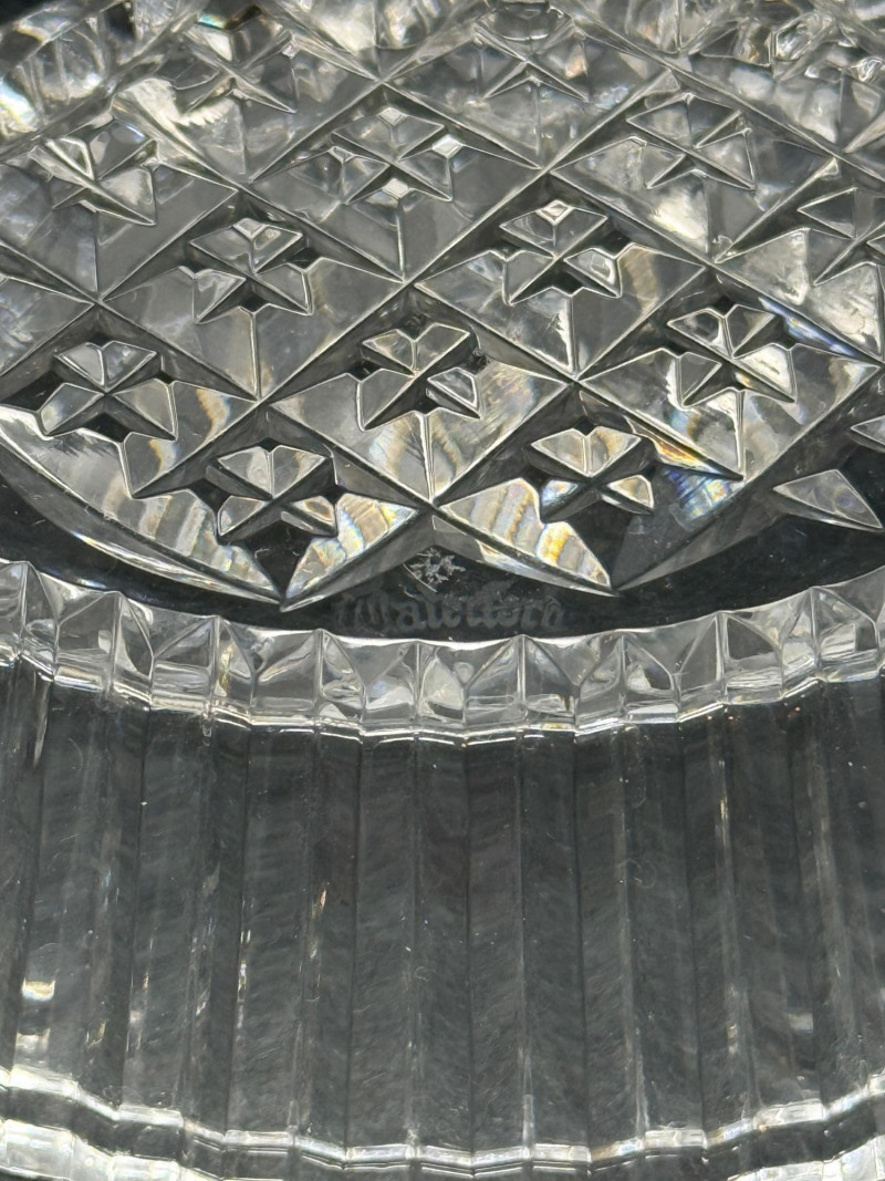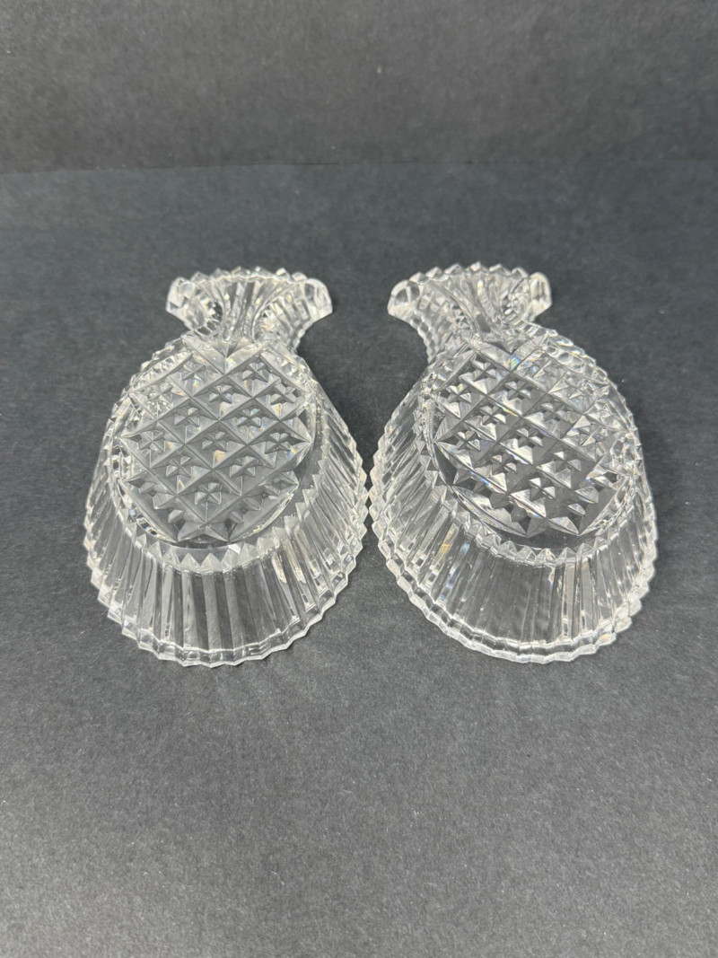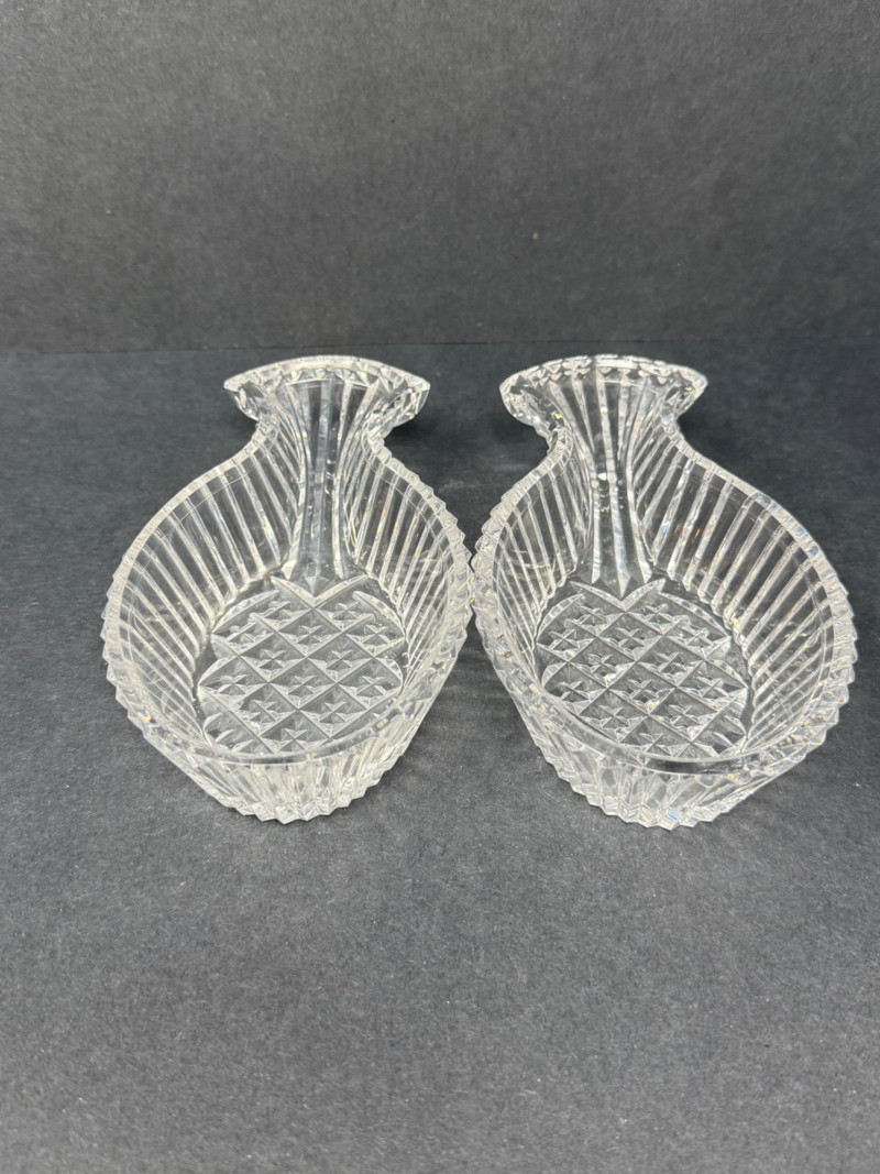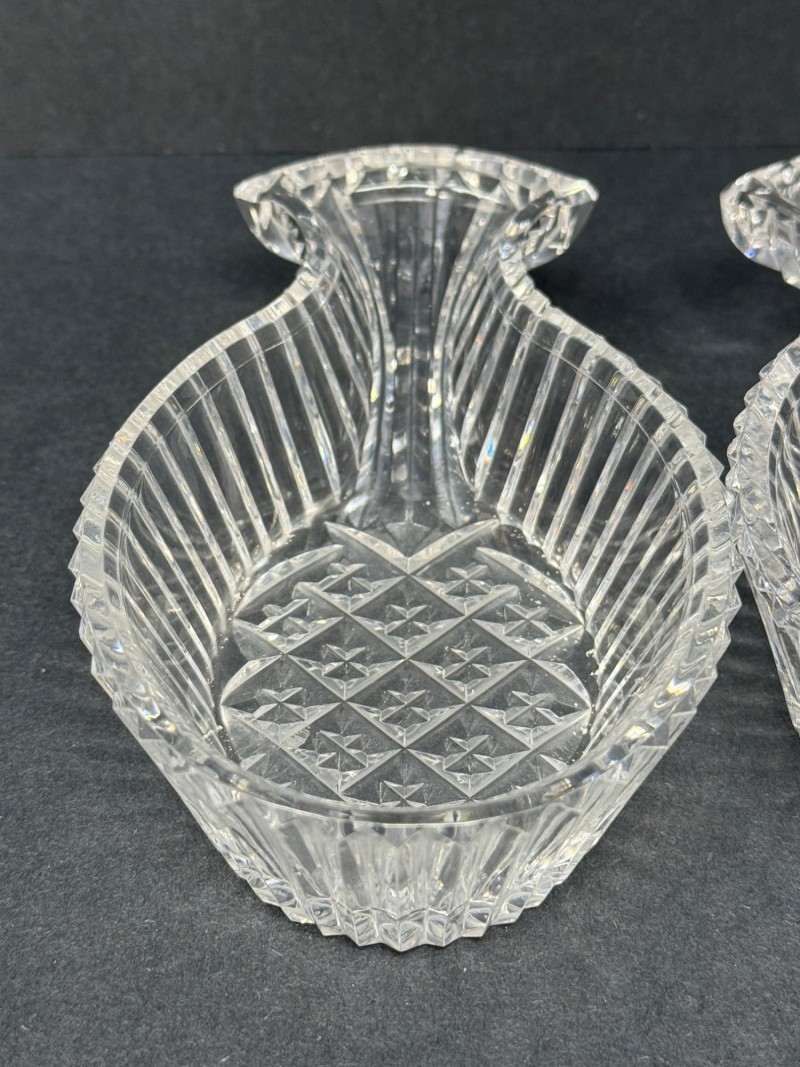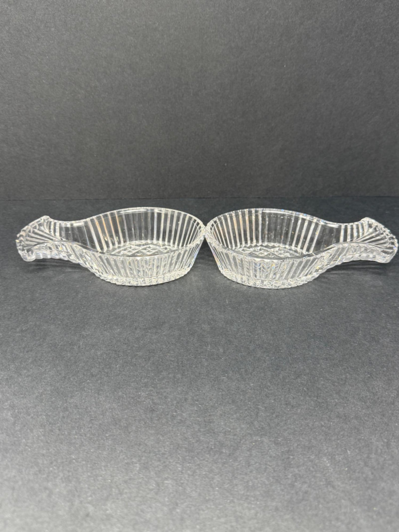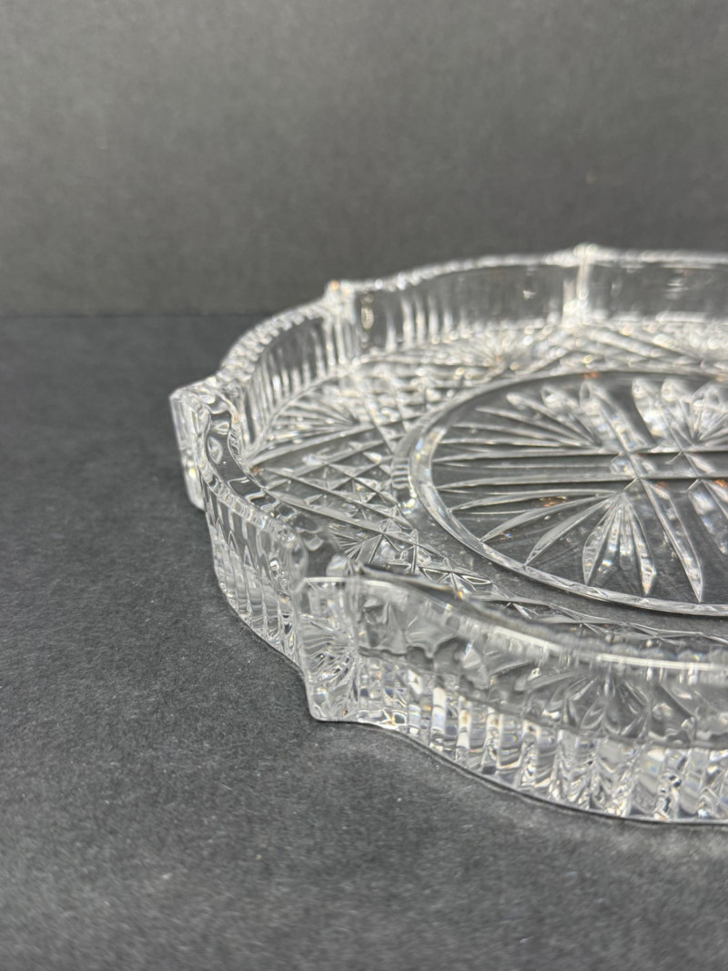 Waterford Crystal 4-Piece Set Clear pressed or cut glass set featuring traditional Waterford-style patterns such as crosshatching, fans, and starburst motifs. The set is comprised of functional and decorative table pieces, each with refined detailing and weight typical of quality crystal. Set includes: One round serving dish with scalloped rim and intricate starburst cut on the base. The sides are decorated with alternating crosshatch and vertical panel designs. One elongated oval tray with gently sloped sides, raised diamond cut border, and starburst pattern on the base. Suitable as a relish or bread tray. One spoon rest with a flared edge, oval basin, and detailed radial cuts. Ideal for serving utensils or small snacks. Two shell-form dishes with vertical ribbing and pedestal bases. Can be used for serving condiments, nuts, or as decorative accent pieces. Each piece is crafted from clear crystal with high clarity and reflective facets. Measurements: Round dish: 8" diameter x 1.25" height Oval tray: 9.5" width x 3.5" length x 2" height Spoon rest: 6.5" length x 3.5" width x 1.5" height