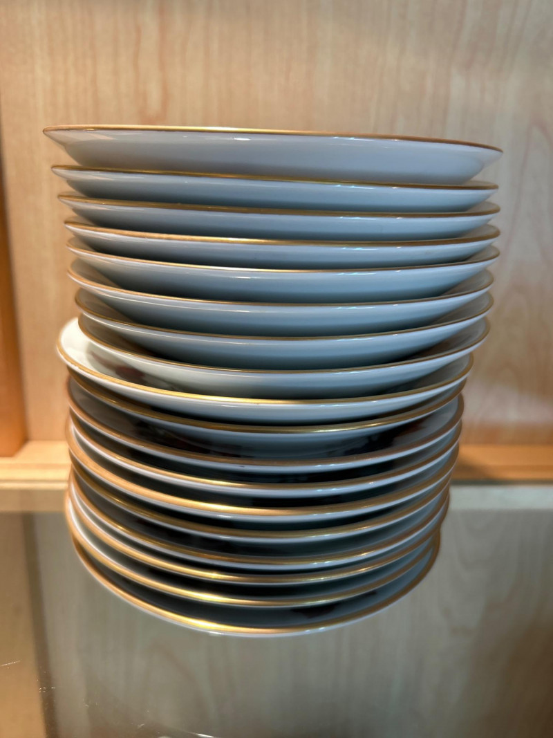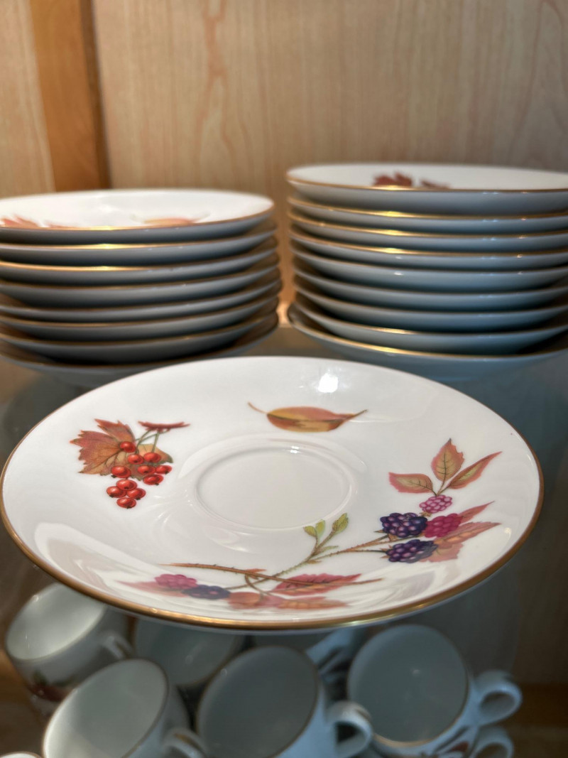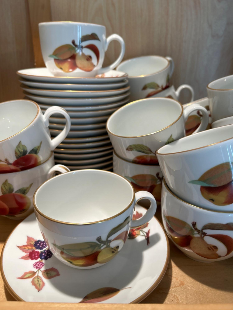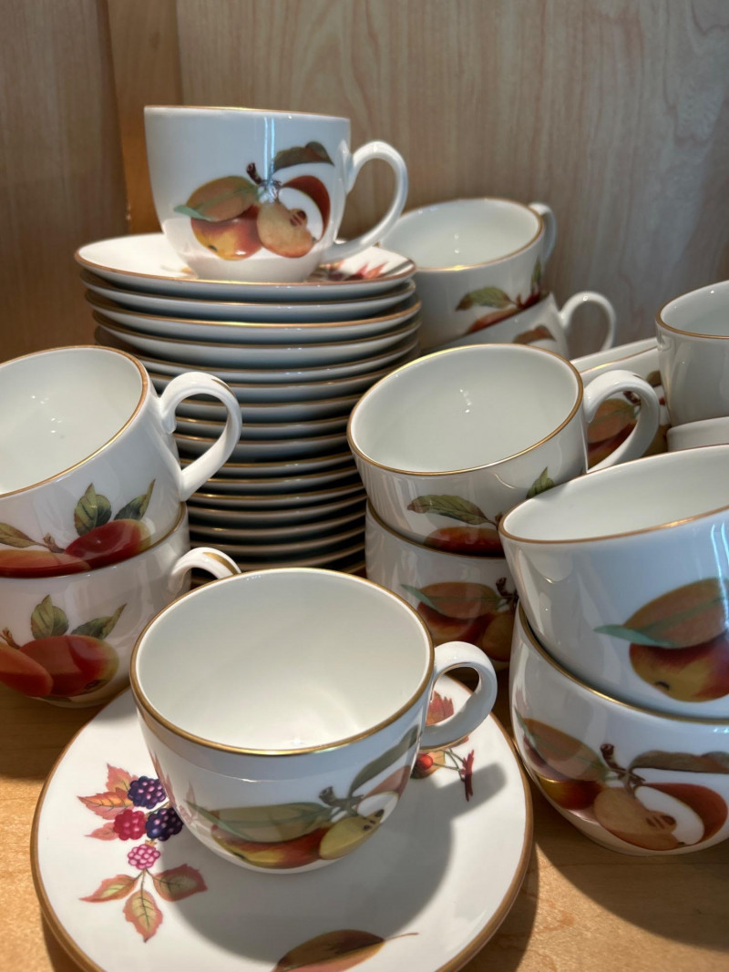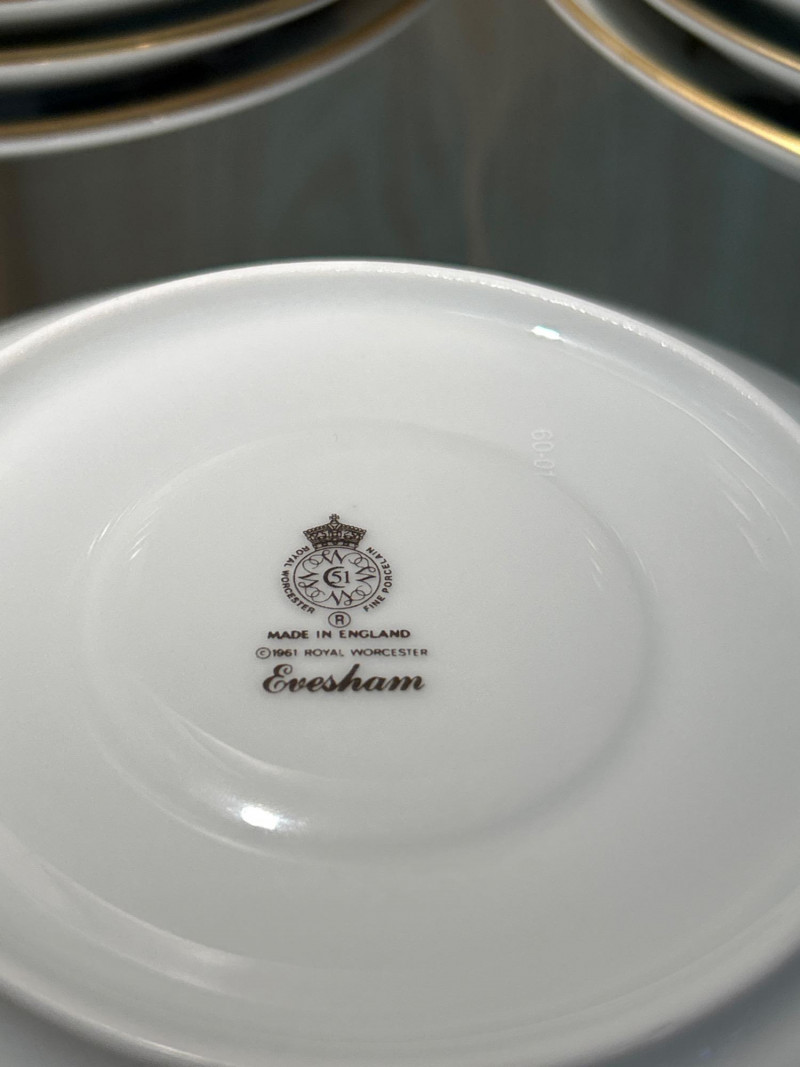 Set of 18 Royal Worcester Evesham Gold Cups and Saucers Evesham Gold edge fine porcelain by Royal Worcester. Cup dimensions: 3.5" diameter x 2.75" tall