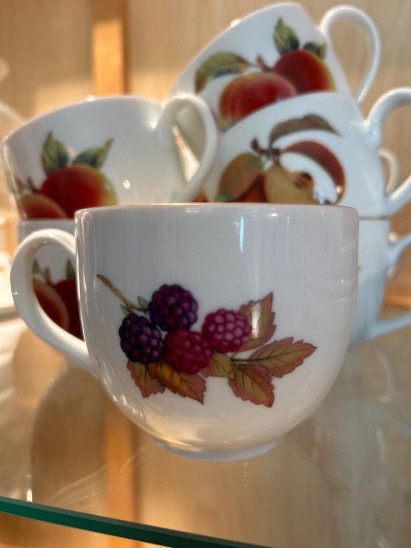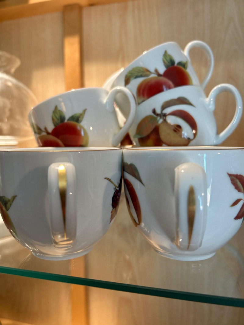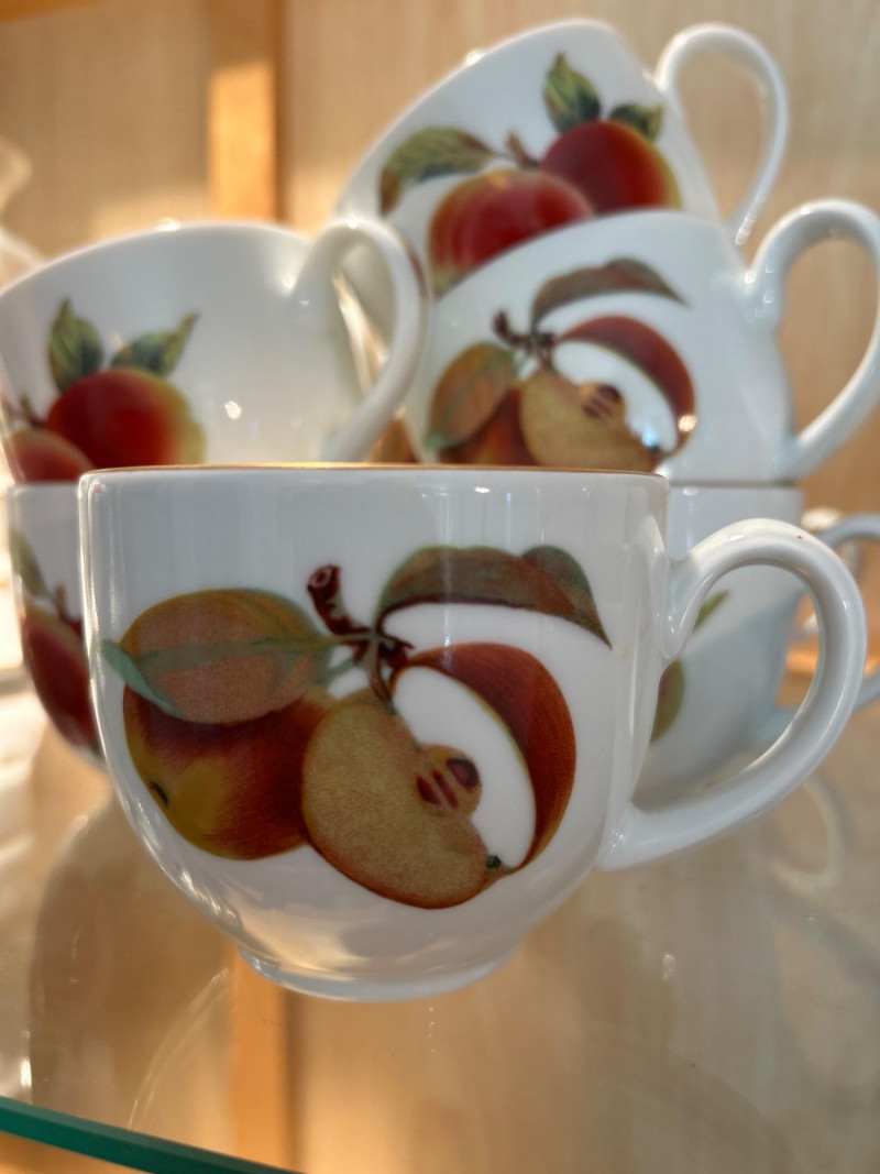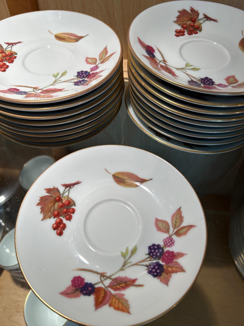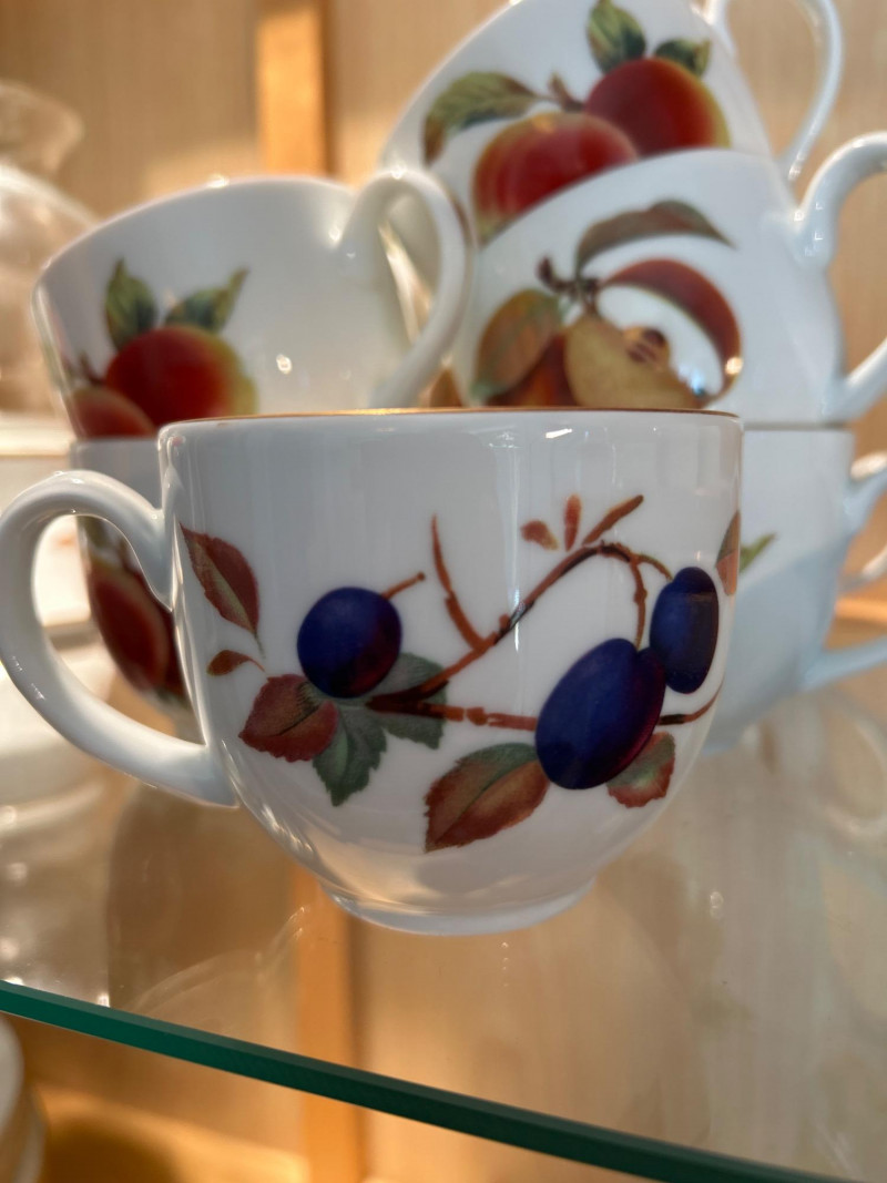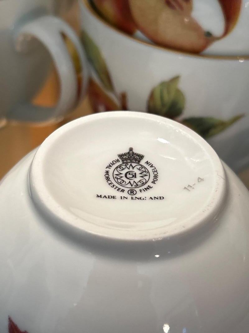 Set includes eighteen matching cups and saucers featuring assorted fruit motifs. Each piece is marked with the Royal Worcester backstamp.