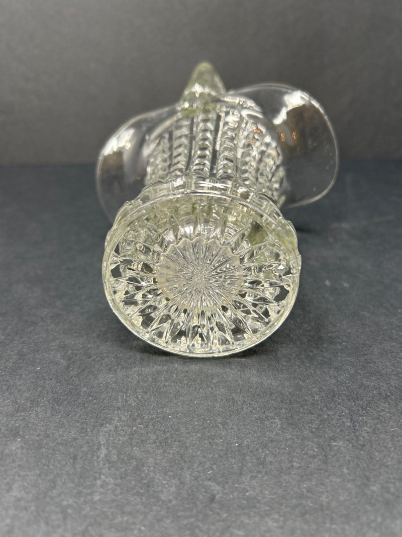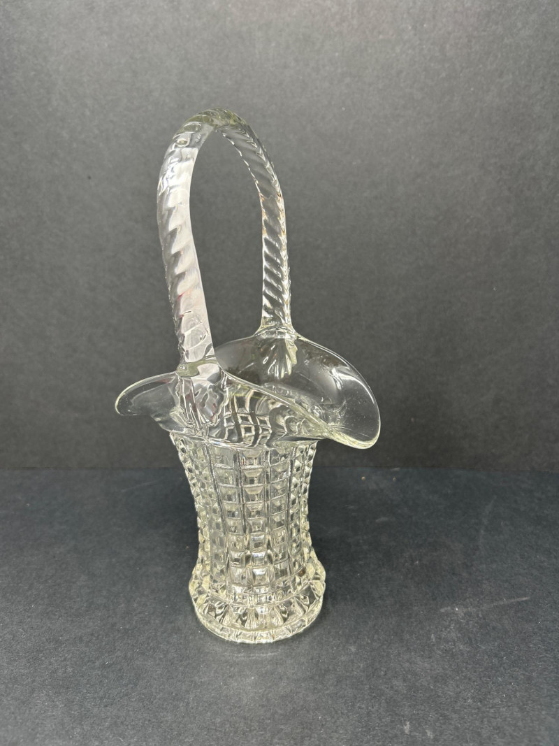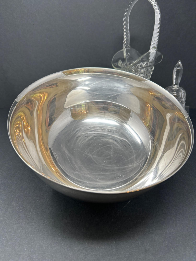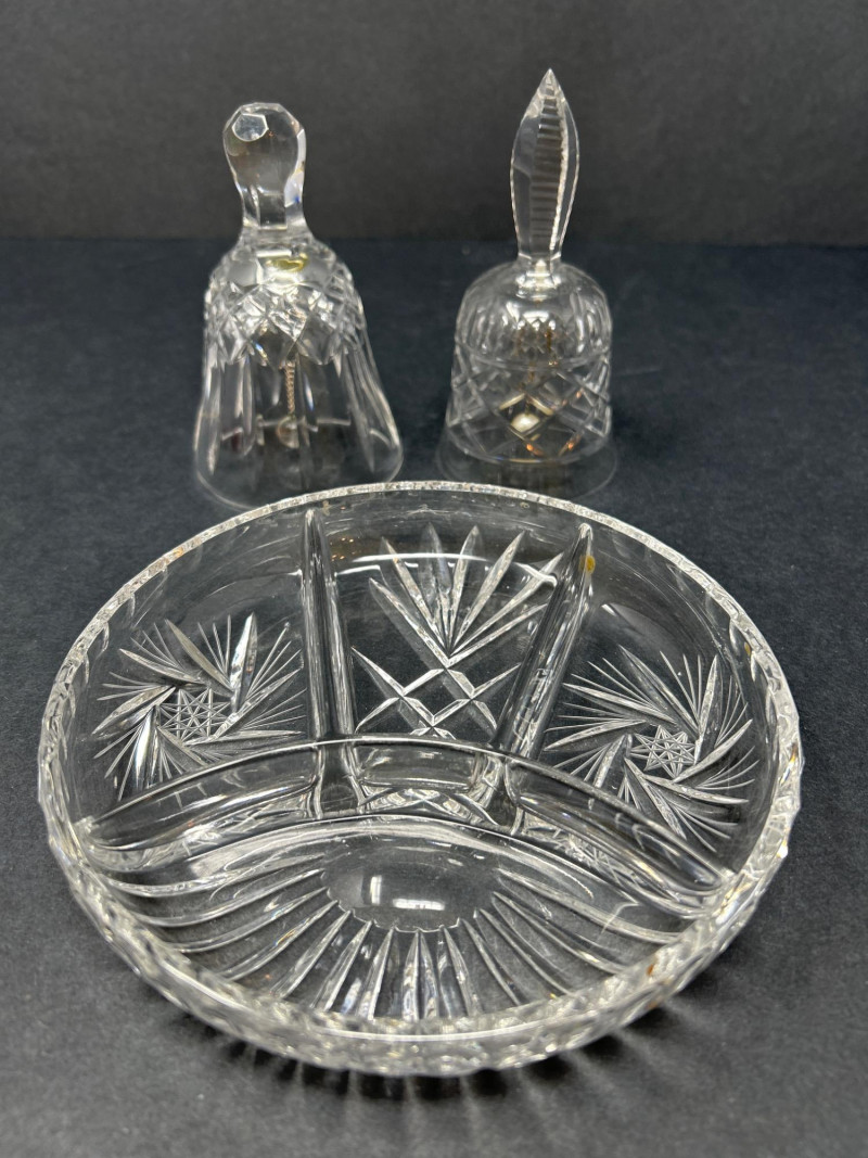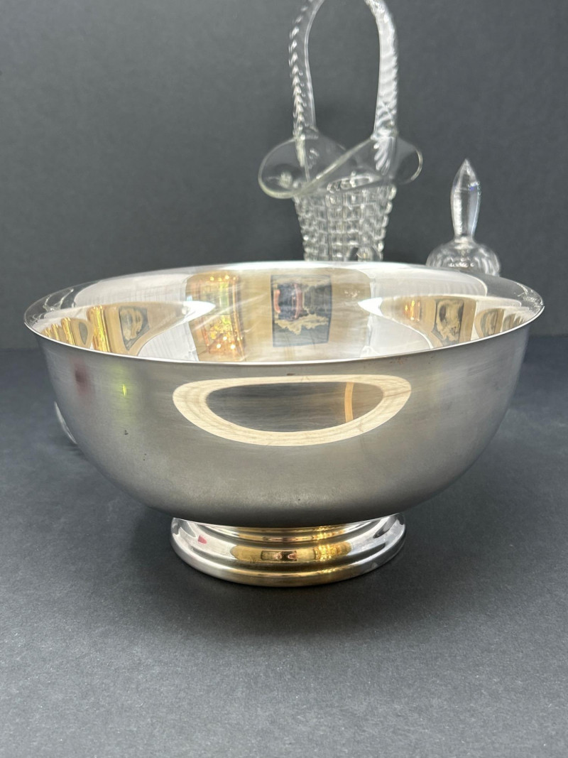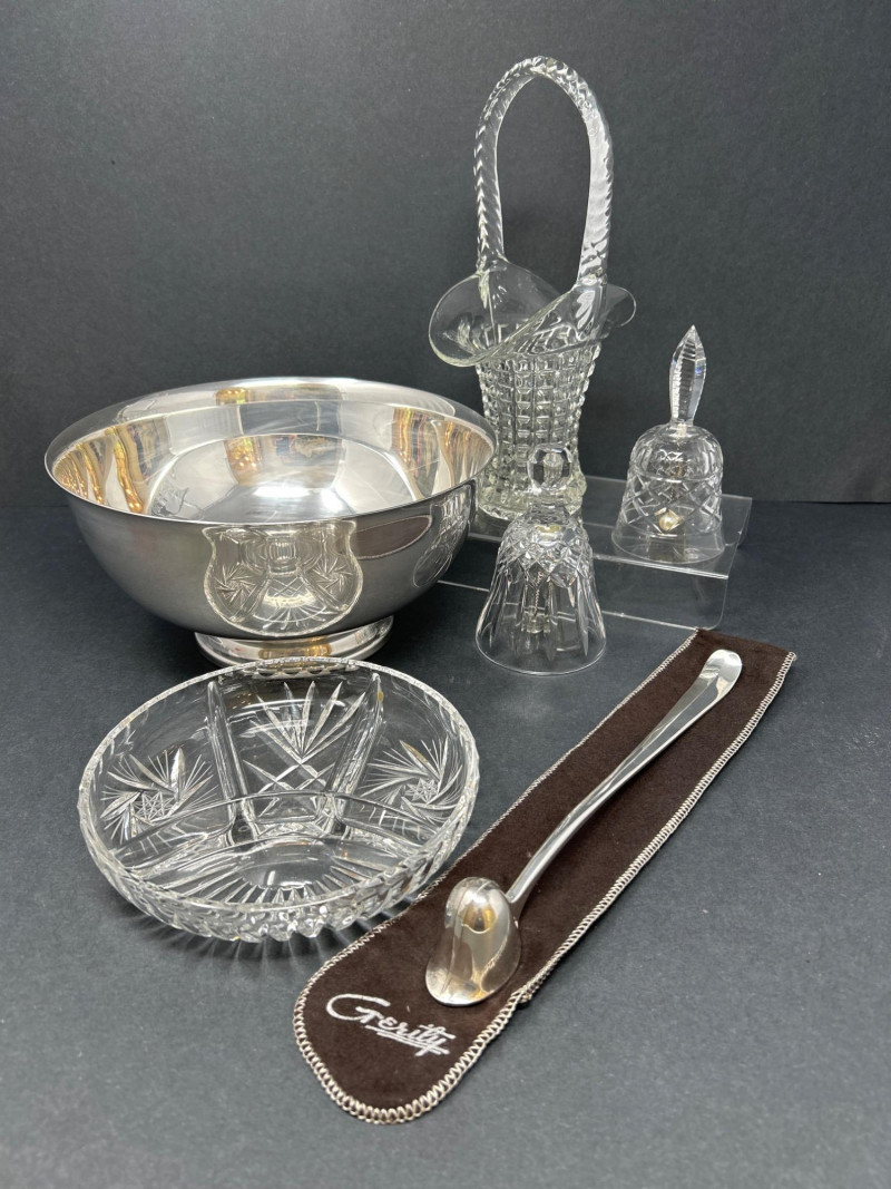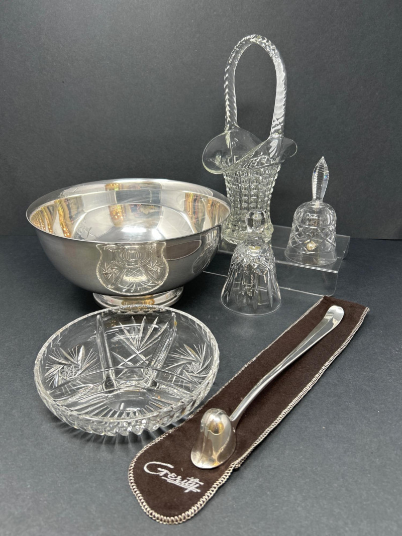 Silverplate Bowl, Basket Bowl, Bells and More A mixed-material tabletop and decorative set featuring silver-plated and pressed glass pieces. Items include functional servingware and ornamental accents suitable for display or entertaining. Set includes: Silver-plated Paul Revere style footed bowl with embossed crest on both sides Pressed glass relish dish with two compartments and starburst cut pattern Pressed glass basket with tall handle and crimped rim Two pressed glass bells with clappers Vintage silver-plated Gerity candle snuffer in original felt sleeve