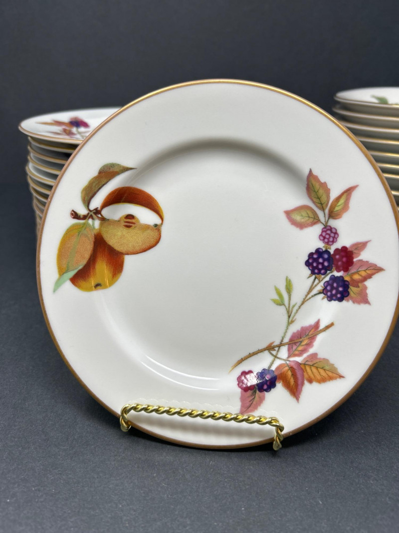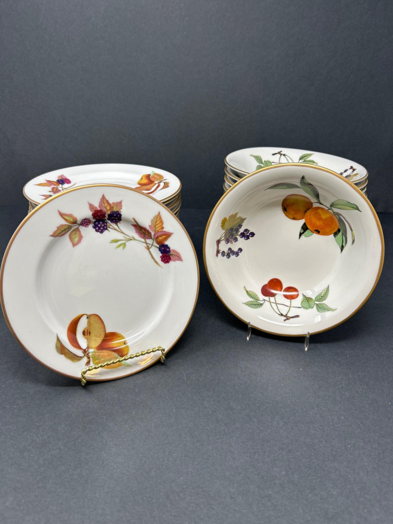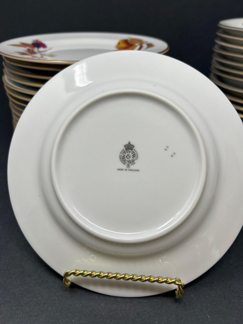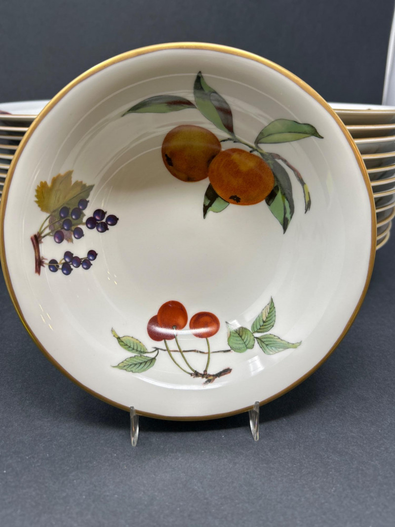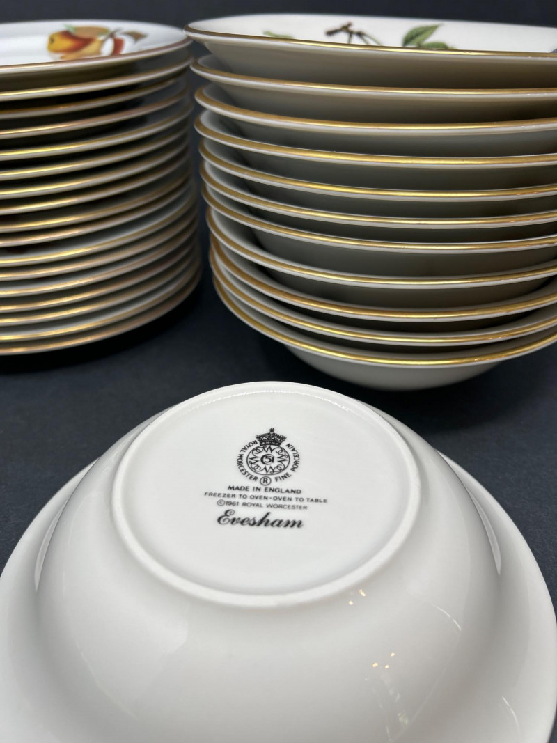 Set of Royal Worcester Evesham Gold Small Plates and Bowls Set includes seventeen small plates and twelve small bowls from the Evesham Gold collection by Royal Worcester. Each piece is crafted from fine porcelain and features a gold rim and hand-painted fruit motifs, including peaches, blackberries, cherries, grapes, and plums—each rendered in varied combinations across the set. The plates have a slightly raised lip, while the bowls have a rounded form suitable for desserts or side servings. All items bear the Royal Worcester backstamp with “Made in England,” indicating authenticity and origin. Measurements: Plates: 6.5" diameter Bowls: 6.5" diameter x 1.75" deep