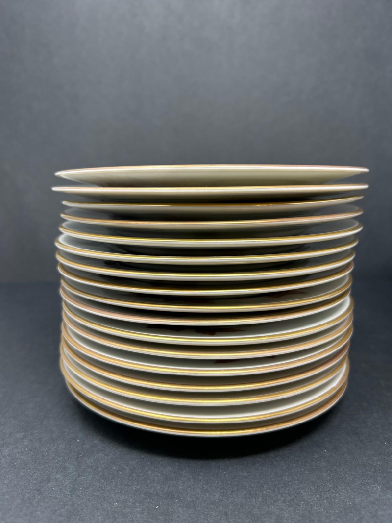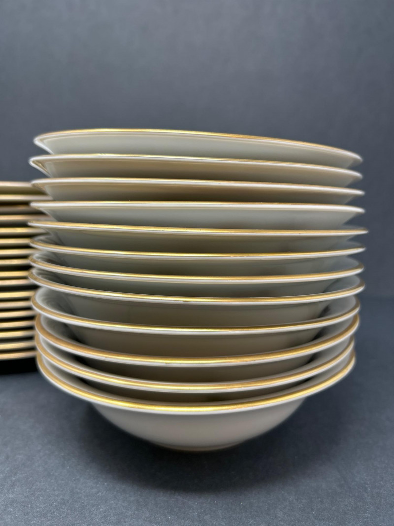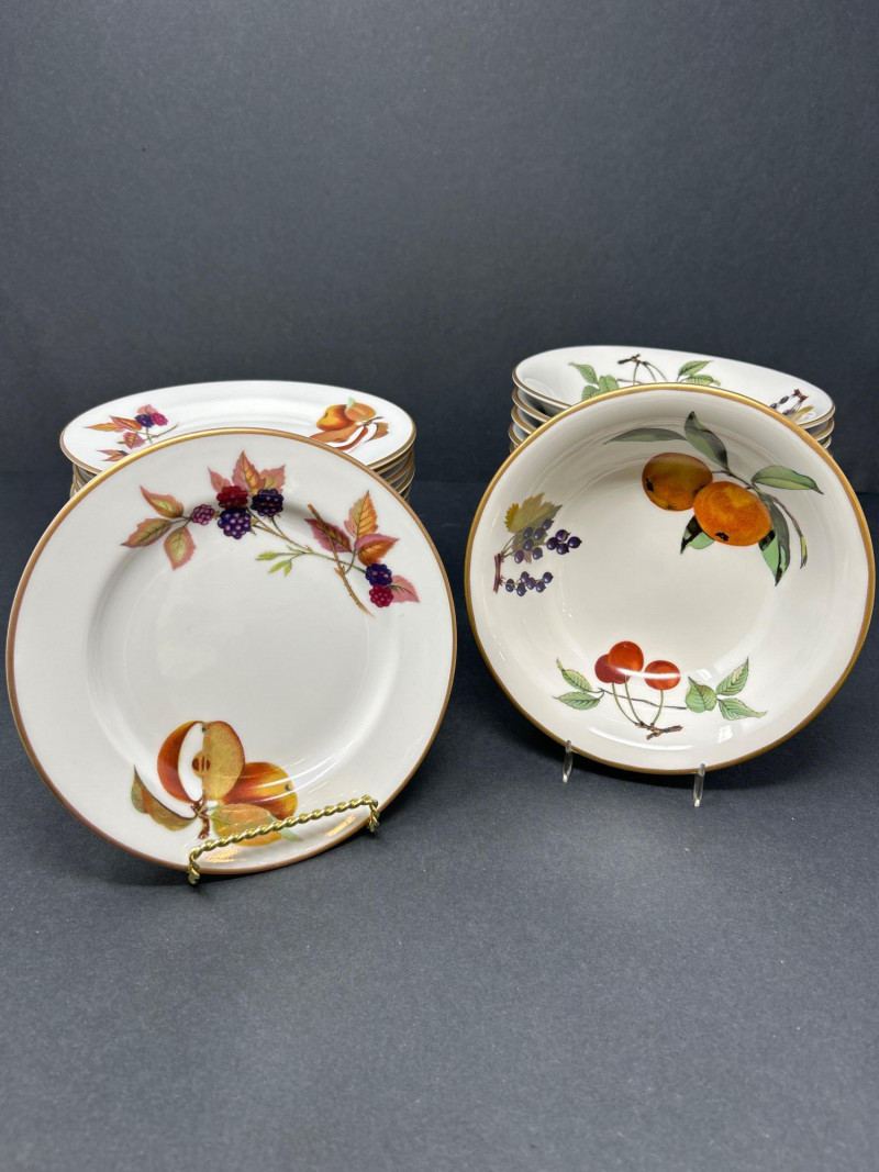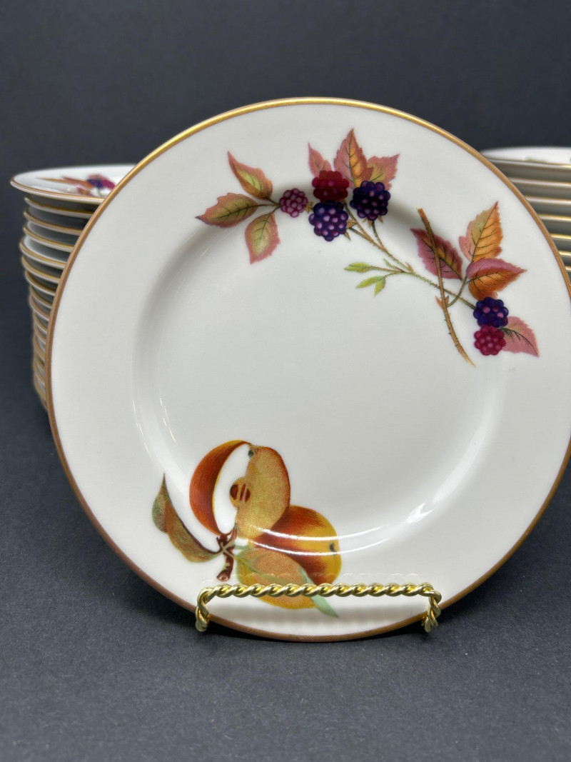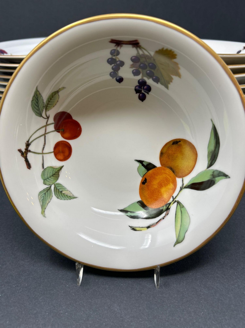 Set of Royal Worcester Evesham Gold Small Plates and Bowls Set includes seventeen small plates and twelve small bowls from the Evesham Gold collection by Royal Worcester. Each piece is crafted from fine porcelain and features a gold rim and hand-painted fruit motifs, including peaches, blackberries, cherries, grapes, and plums—each rendered in varied combinations across the set. The plates have a slightly raised lip, while the bowls have a rounded form suitable for desserts or side servings. All items bear the Royal Worcester backstamp with “Made in England,” indicating authenticity and origin. Measurements: Plates: 6.5" diameter Bowls: 6.5" diameter x 1.75" deep