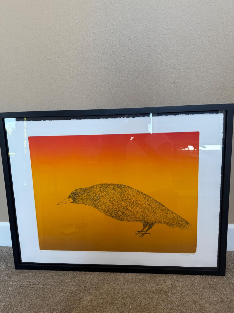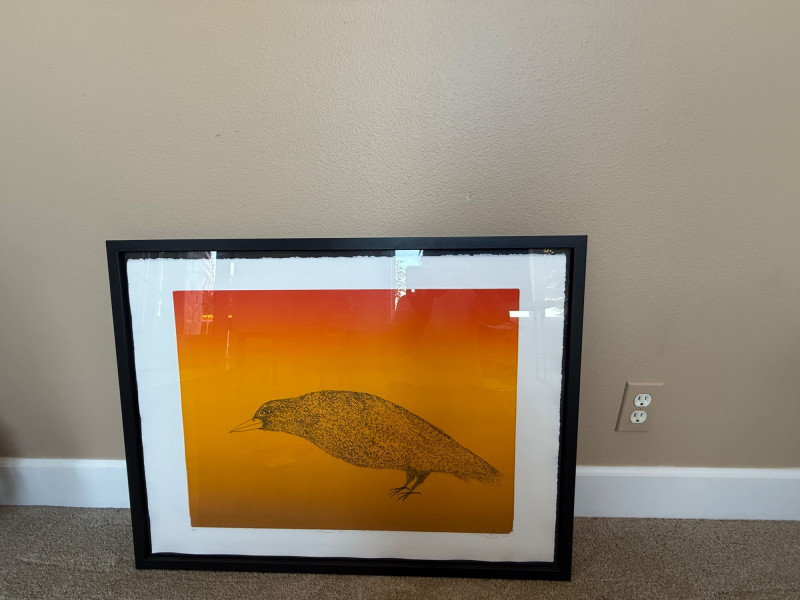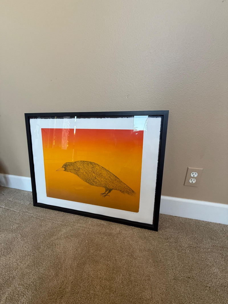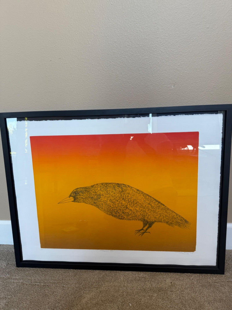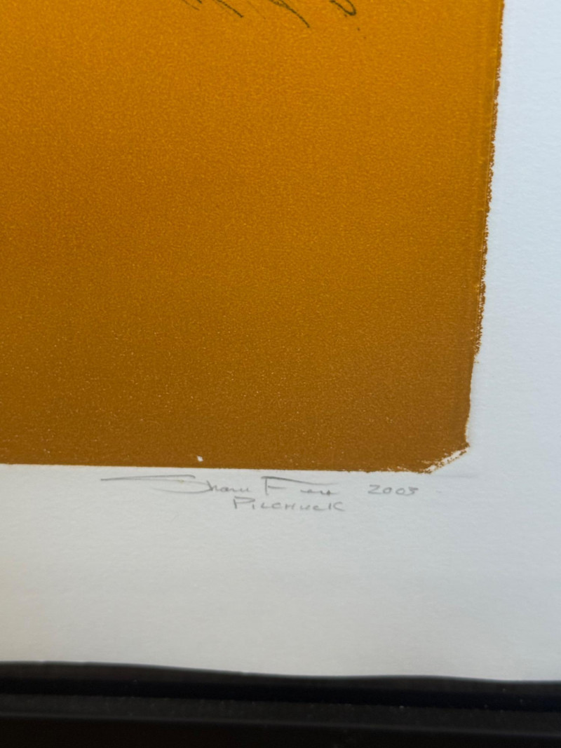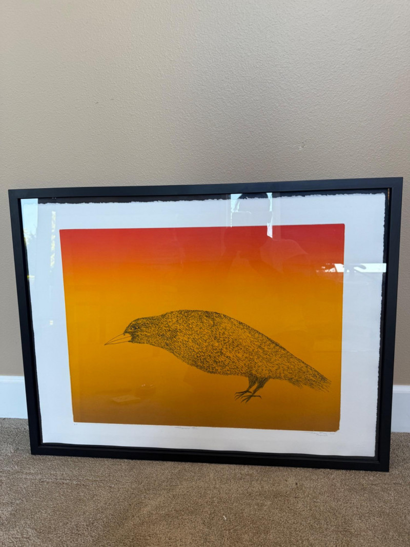 Original Vetriograph Edition 20 – "Squiggle Bird" by Shane Fero Framed original vetriograph titled "Squiggle Bird" by Shane Fero. The artwork features a stylized bird composed of intricate squiggle patterns, set against a gradient background shifting from red to golden yellow. Signed by the artist, dated 2003, and marked "A.P" (Artist’s Proof). Edition: 20