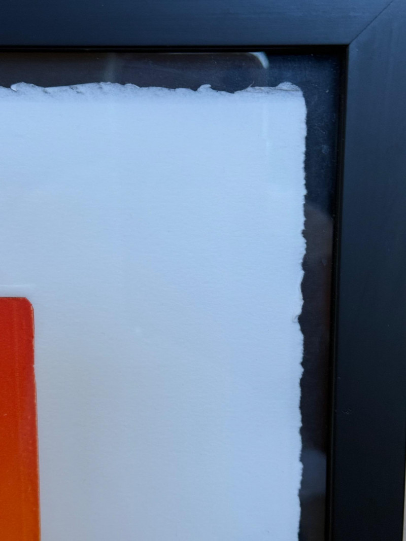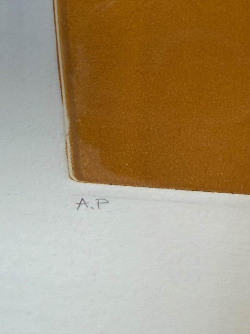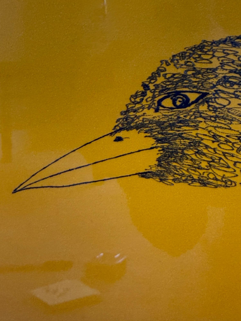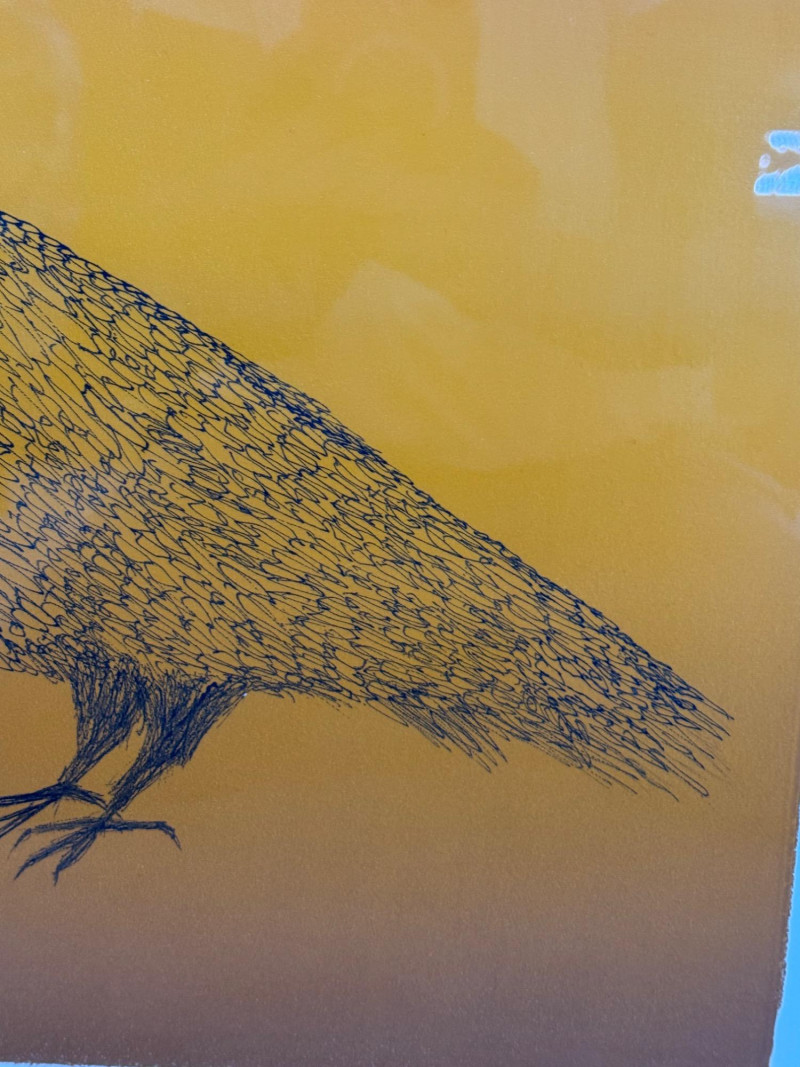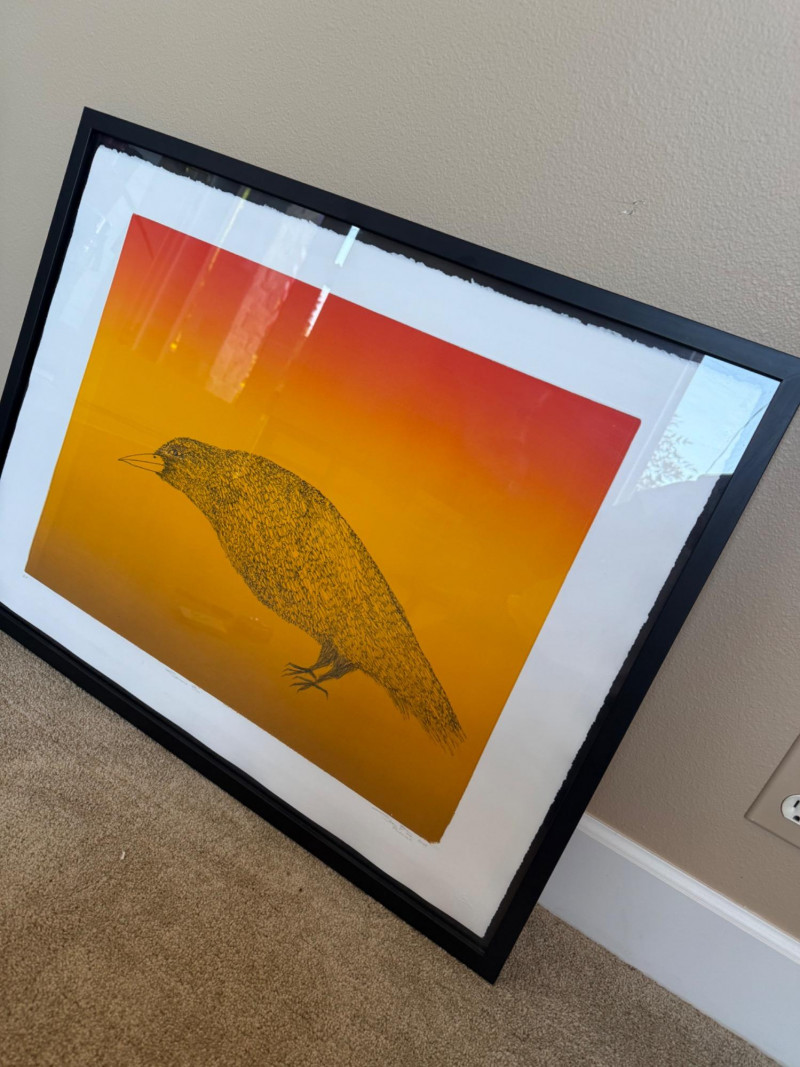 Original Vetriograph Edition 20 – "Squiggle Bird" by Shane Fero Framed original vetriograph titled "Squiggle Bird" by Shane Fero. The artwork features a stylized bird composed of intricate squiggle patterns, set against a gradient background shifting from red to golden yellow. Signed by the artist, dated 2003, and marked "A.P" (Artist’s Proof). Edition: 20