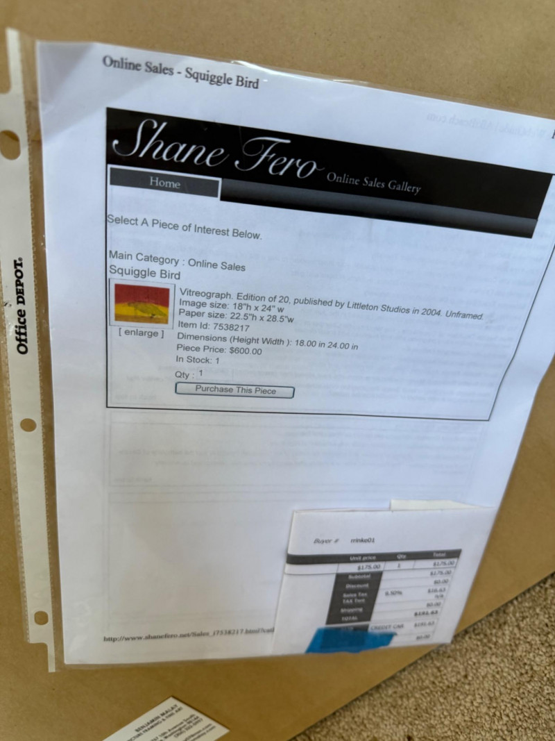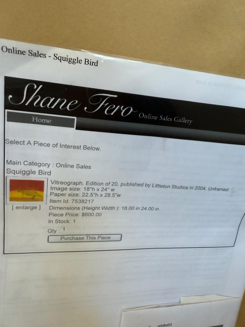 Lot # 115 - Original Vetriograph- Edition 20 "Squiggle Bird" By Shane Fero
