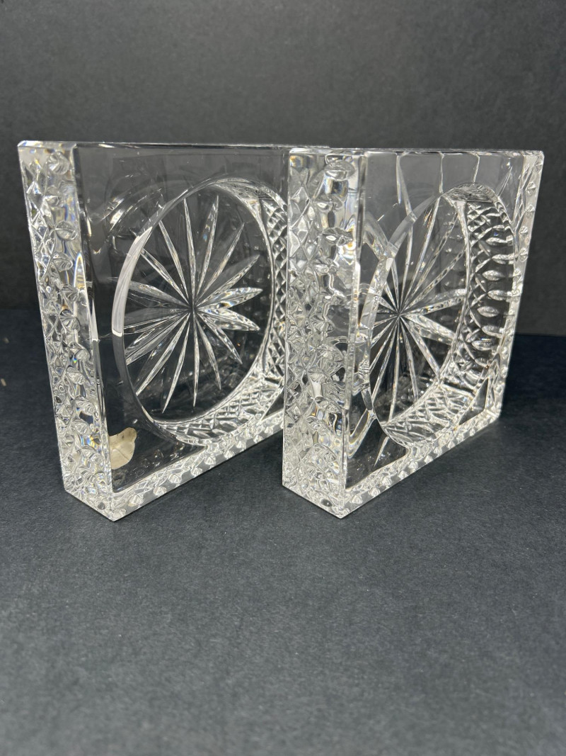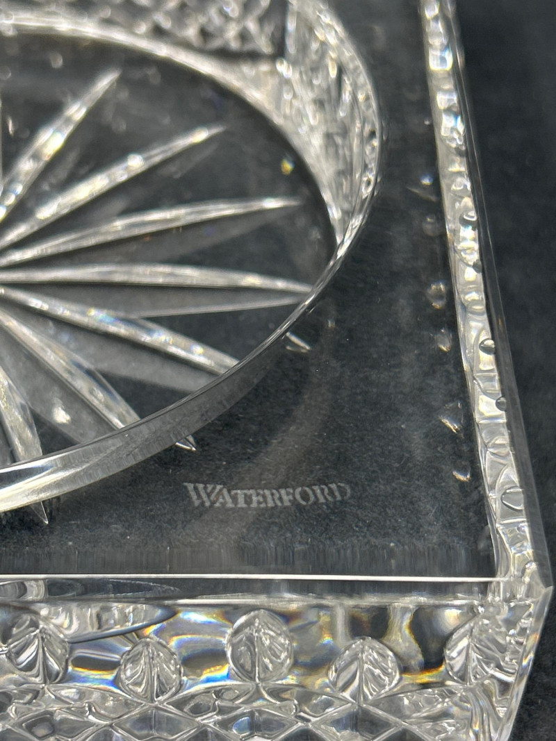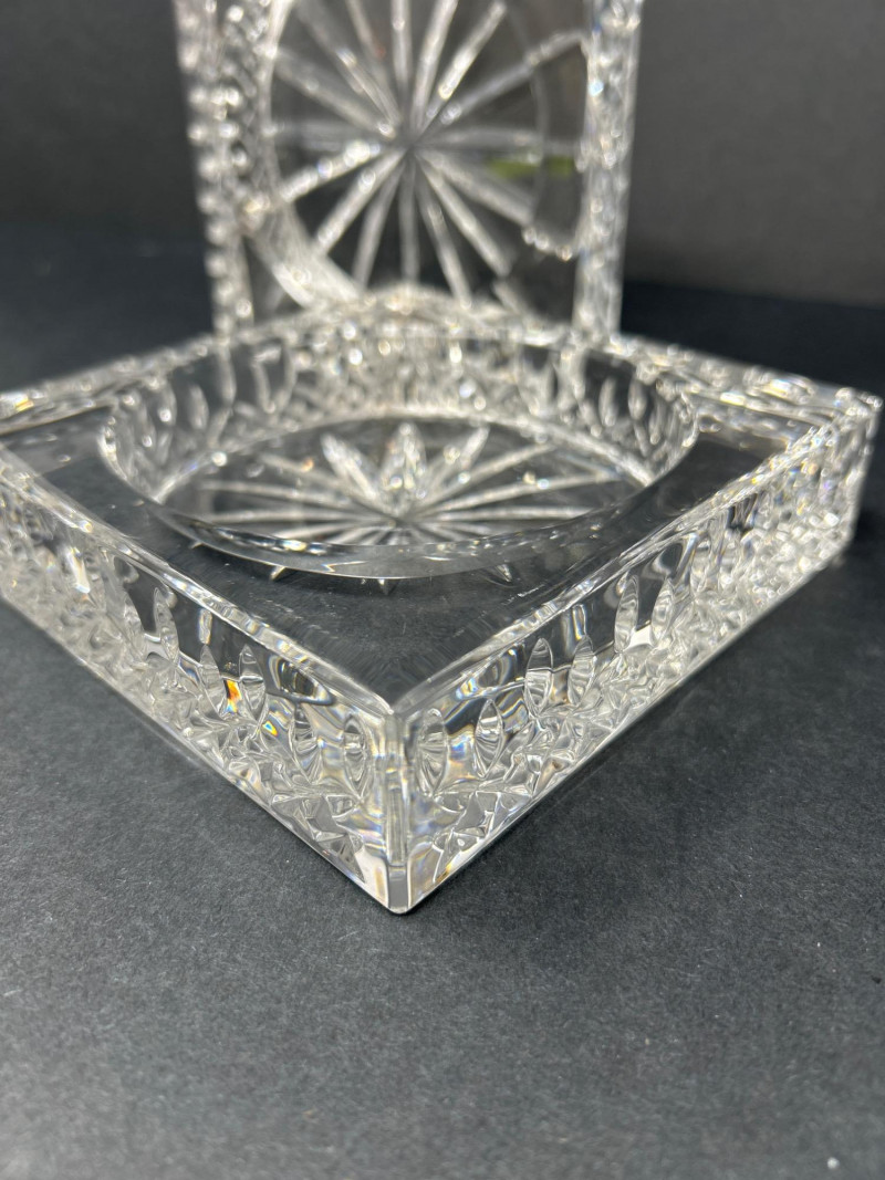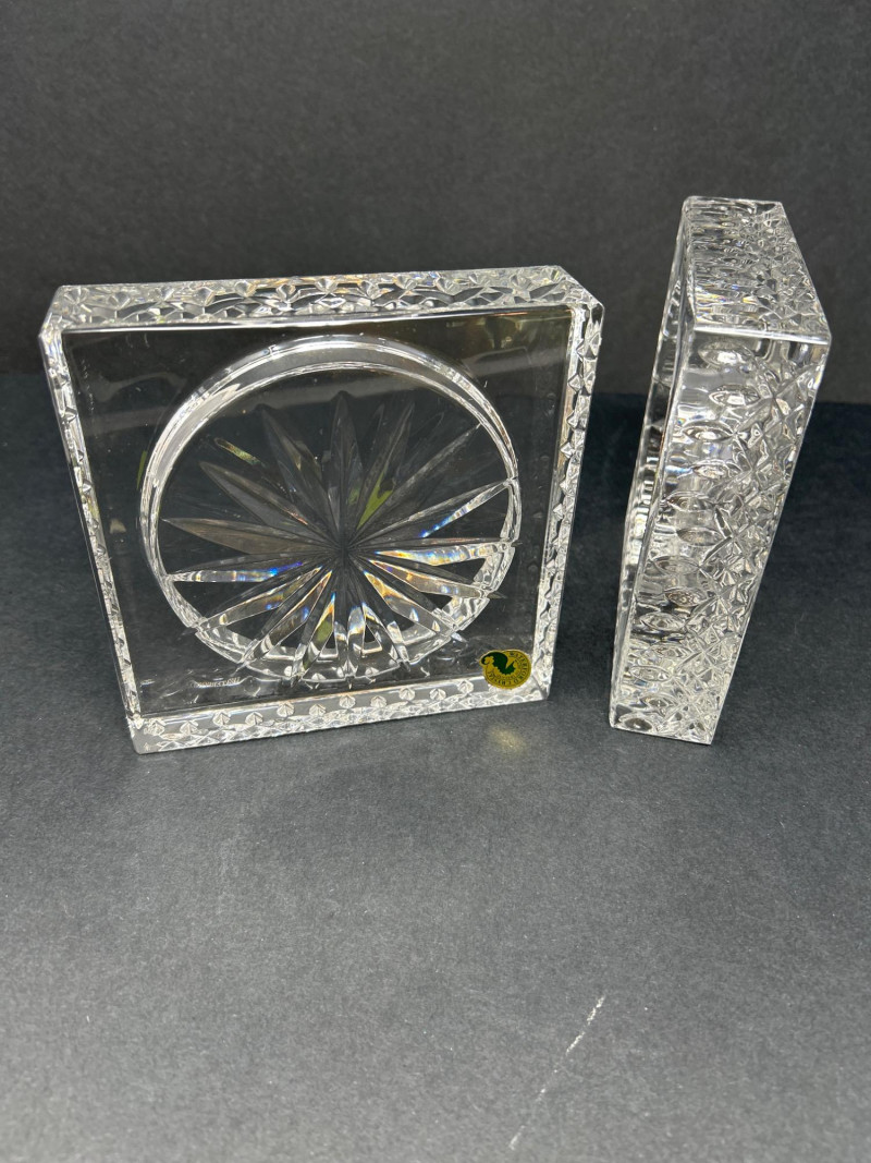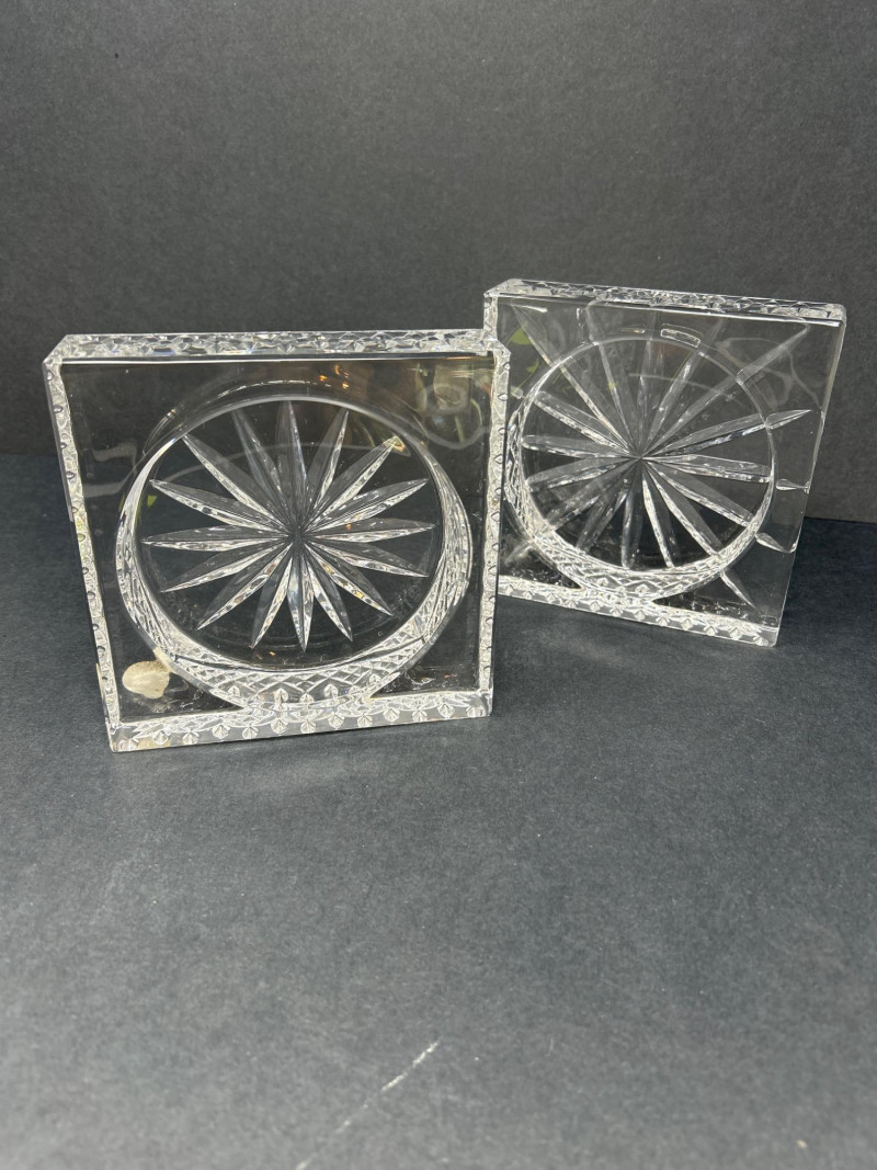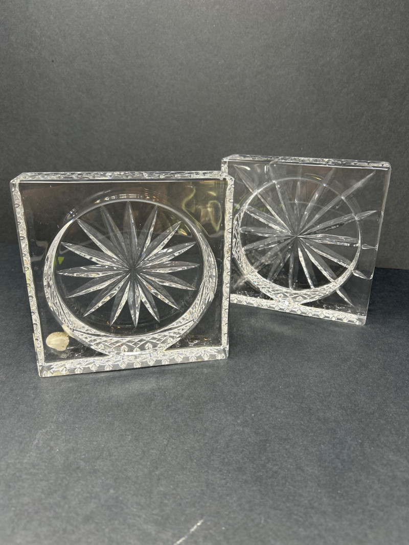 Set of Two Waterford Crystal Coasters Square Waterford crystal coasters featuring a central starburst pattern and a raised circular center. Each coaster is bordered with a cut design and crafted in clear lead crystal. Dimensions:
