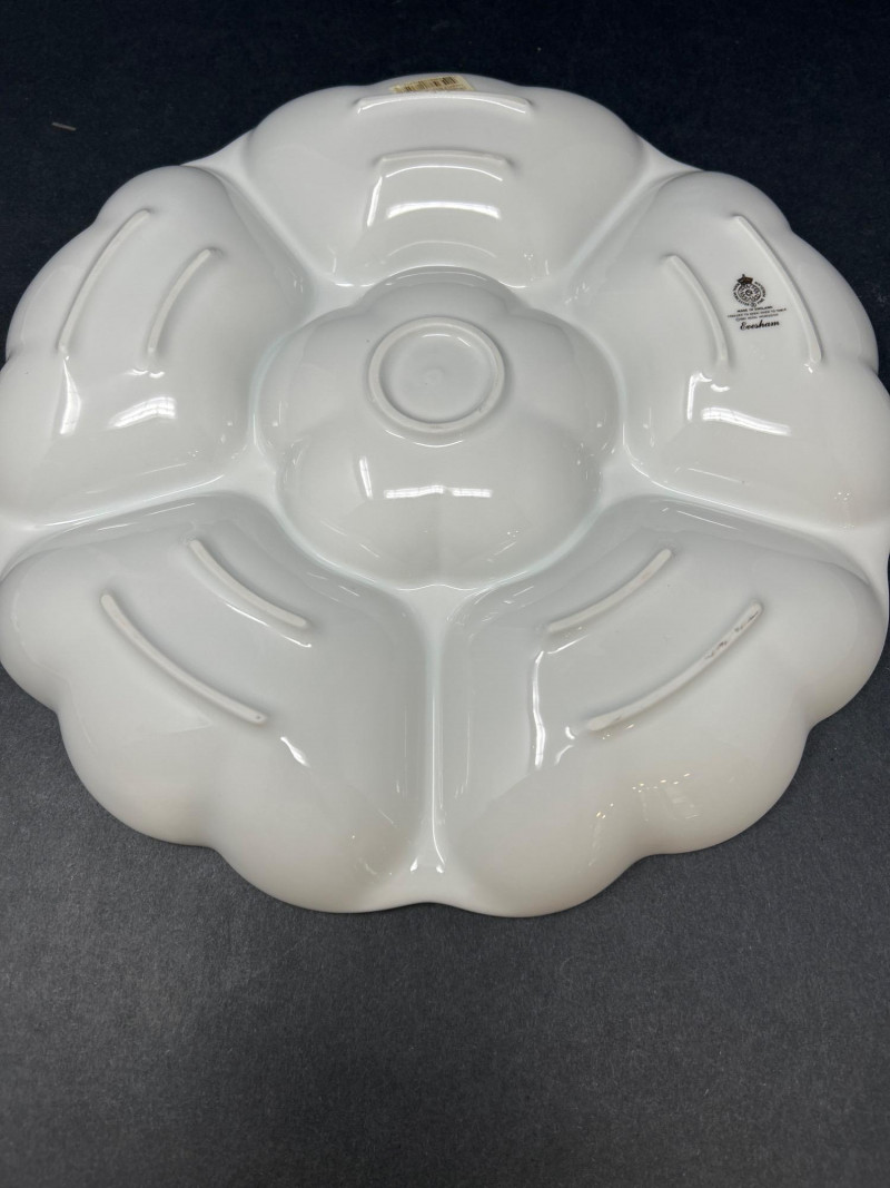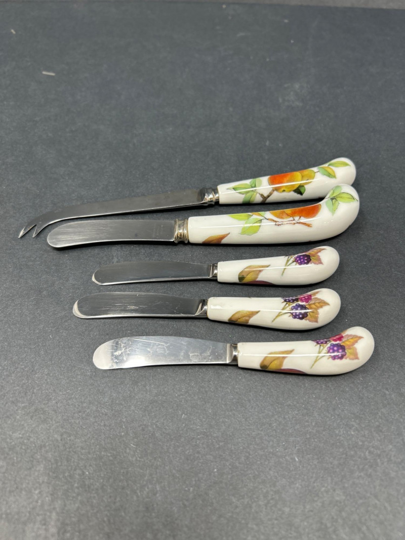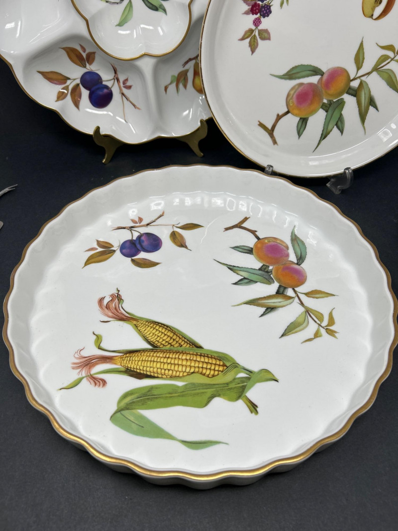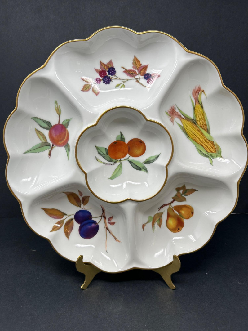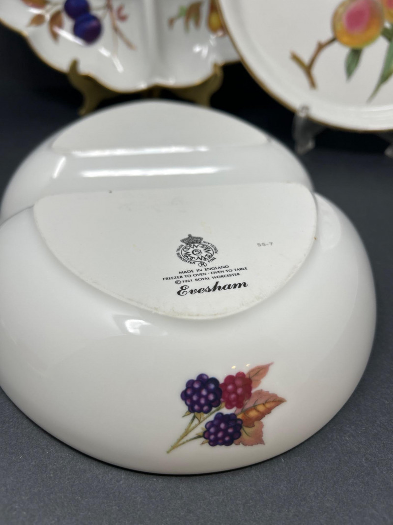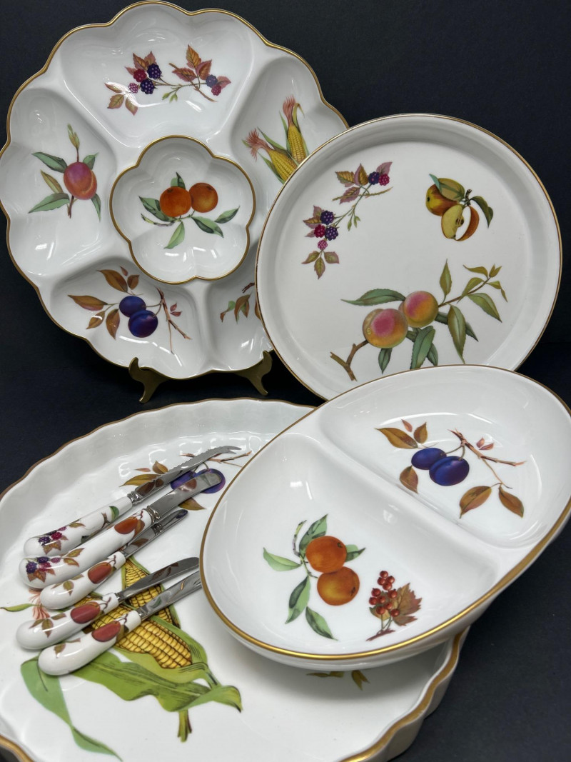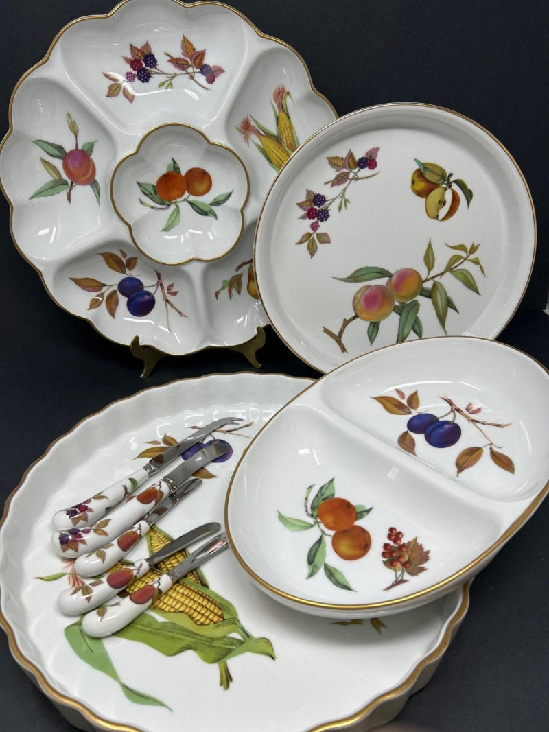 Royal Worcester Evesham Gold Porcelain Serving Set Fine porcelain serving set in the Evesham pattern by Royal Worcester, made in England. This pattern features detailed botanical fruit and vegetable illustrations accented with gold rims. Known for its functionality and elegance, Evesham Gold pieces are oven-to-table and freezer-to-oven safe, as marked on the base stamps ranging from "Fine Oven China" to "Freezer to Oven to Table." This set includes: Five cheese knives – stainless steel blades with porcelain handles, each decorated with different fruit and vegetable motifs from the Evesham pattern. One relish dish – round with five outer compartments and a central bowl; 13.5" diameter, 1.5" deep. One large quiche or flan dish – scalloped edge with gold trim, decorated with produce illustration; 13.5" diameter, 1.5" deep. One oval divided tray – three compartments, flanked by illustrations and trimmed in gold; 11.5" x 5.5", 2" deep. One round serving tray – wide border with gold rim and central fruit imagery; 10.5" diameter, 1.5" deep. All items are marked with various Royal Worcester Evesham backstamps dated 1961.