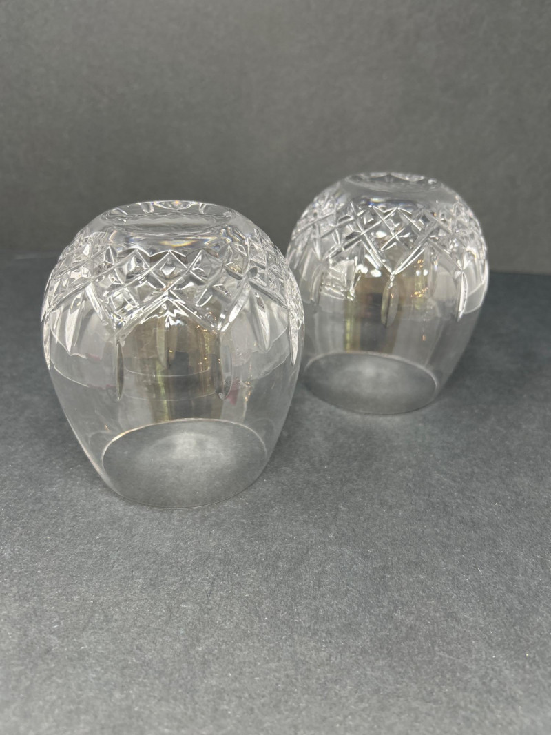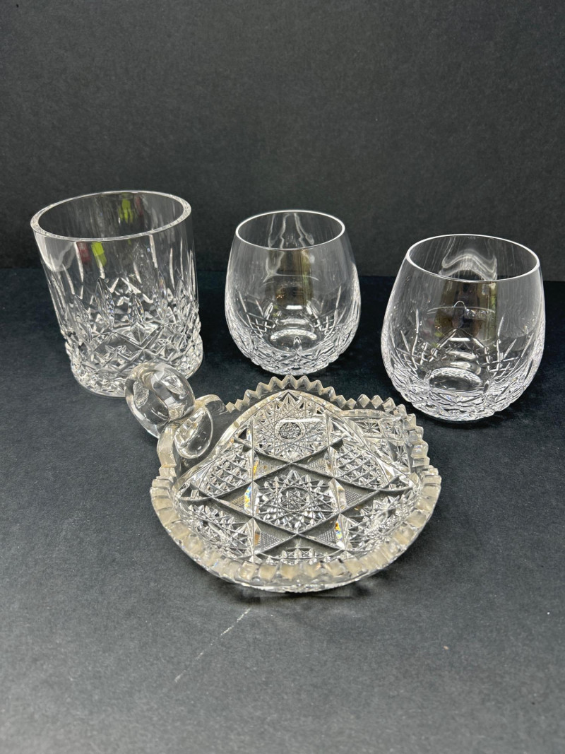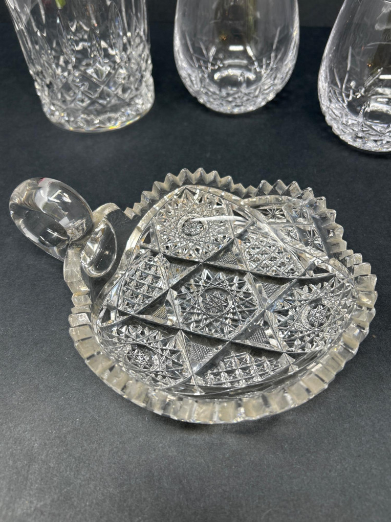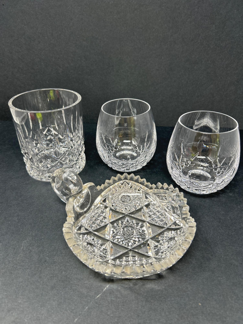 Waterford Cut Glass and Stemware Assortment Collection includes three Waterford cut glass stemware pieces and a variety of intricately cut crystal vessels and accessories. The stemware measures approximately 4.5" and 4" tall. The set also features: One Waterford cut glass decanter with stopper One round cut glass serving dish Multiple small cut glass tumblers and rounded glasses One cylindrical cut glass container Two small cut glass votive or tealight holders Each piece showcases traditional Waterford-style deep cuts and brilliant clarity typical of Irish crystal craftsmanship. Measurements: Stemware: 4.5" and 4" tall