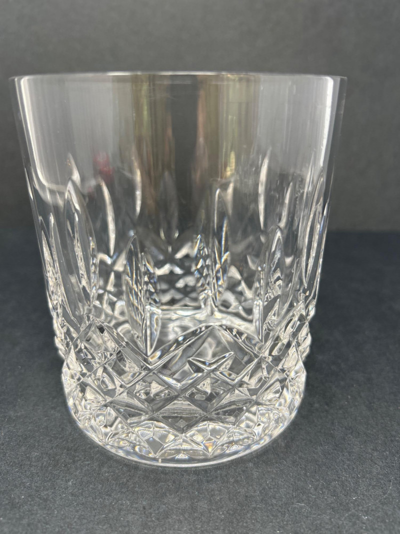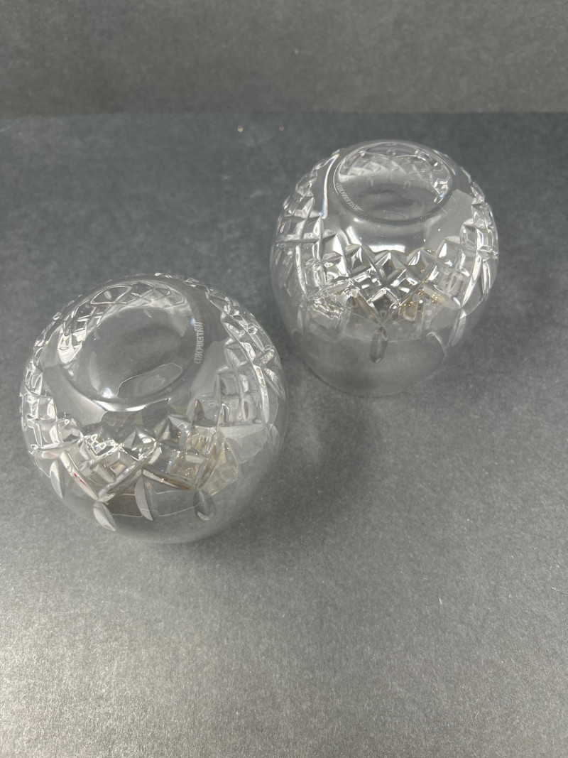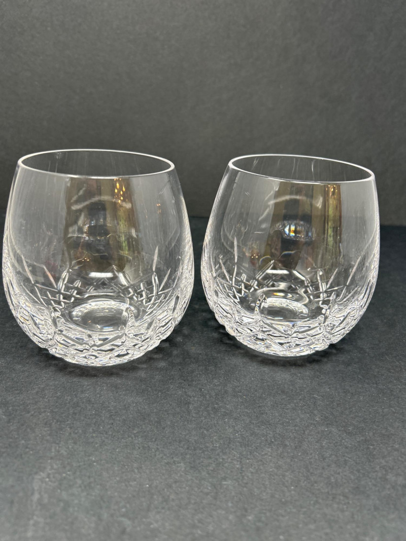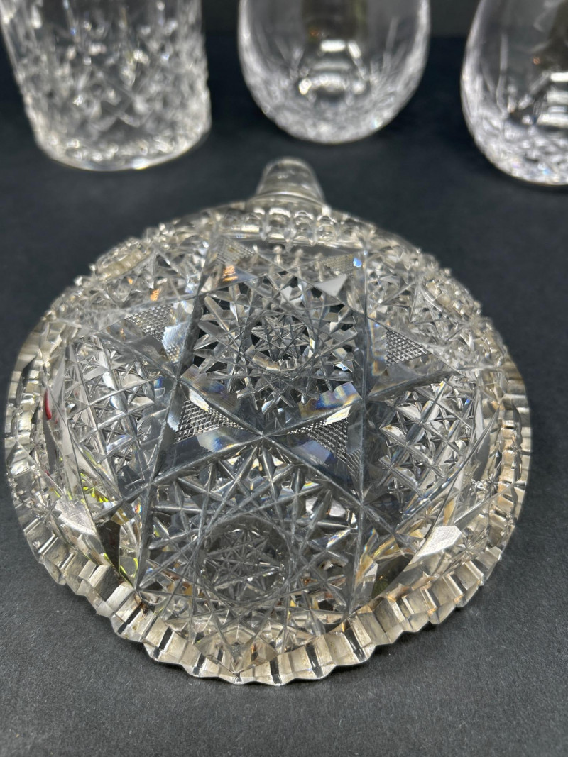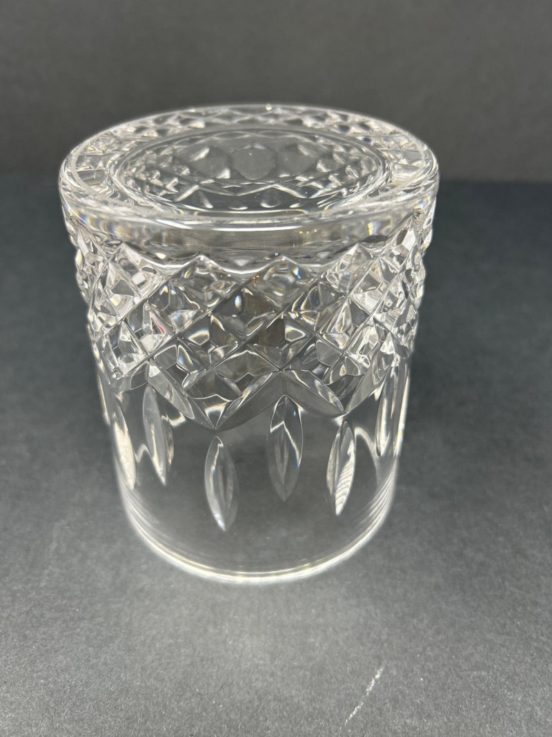 Waterford Cut Glass and Stemware Assortment Collection includes three Waterford cut glass stemware pieces and a variety of intricately cut crystal vessels and accessories. The stemware measures approximately 4.5" and 4" tall. The set also features: One Waterford cut glass decanter with stopper One round cut glass serving dish Multiple small cut glass tumblers and rounded glasses One cylindrical cut glass container Two small cut glass votive or tealight holders Each piece showcases traditional Waterford-style deep cuts and brilliant clarity typical of Irish crystal craftsmanship. Measurements: Stemware: 4.5" and 4" tall
