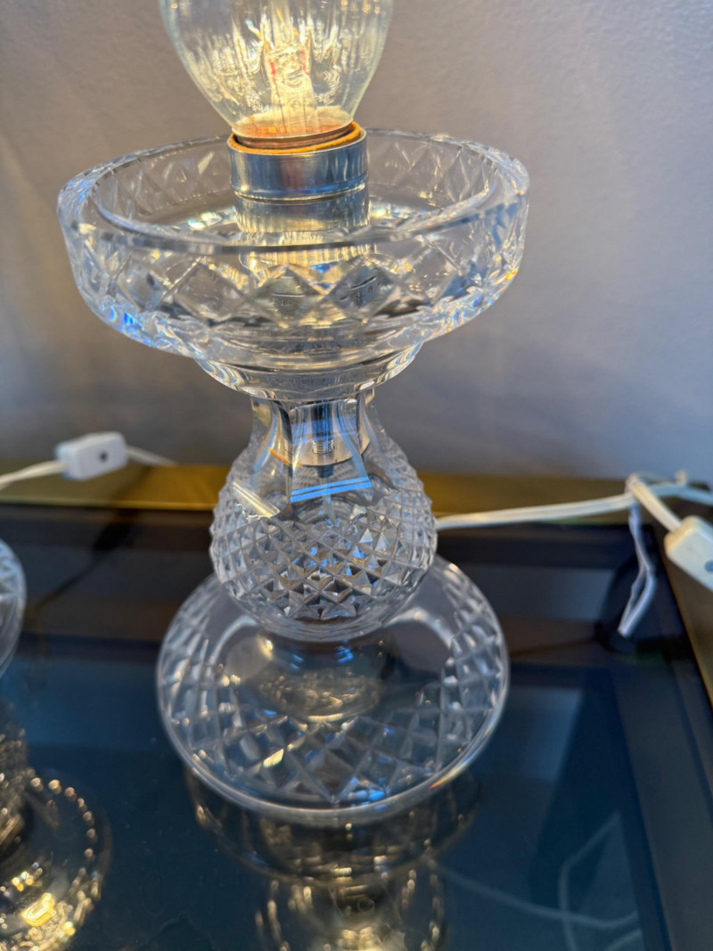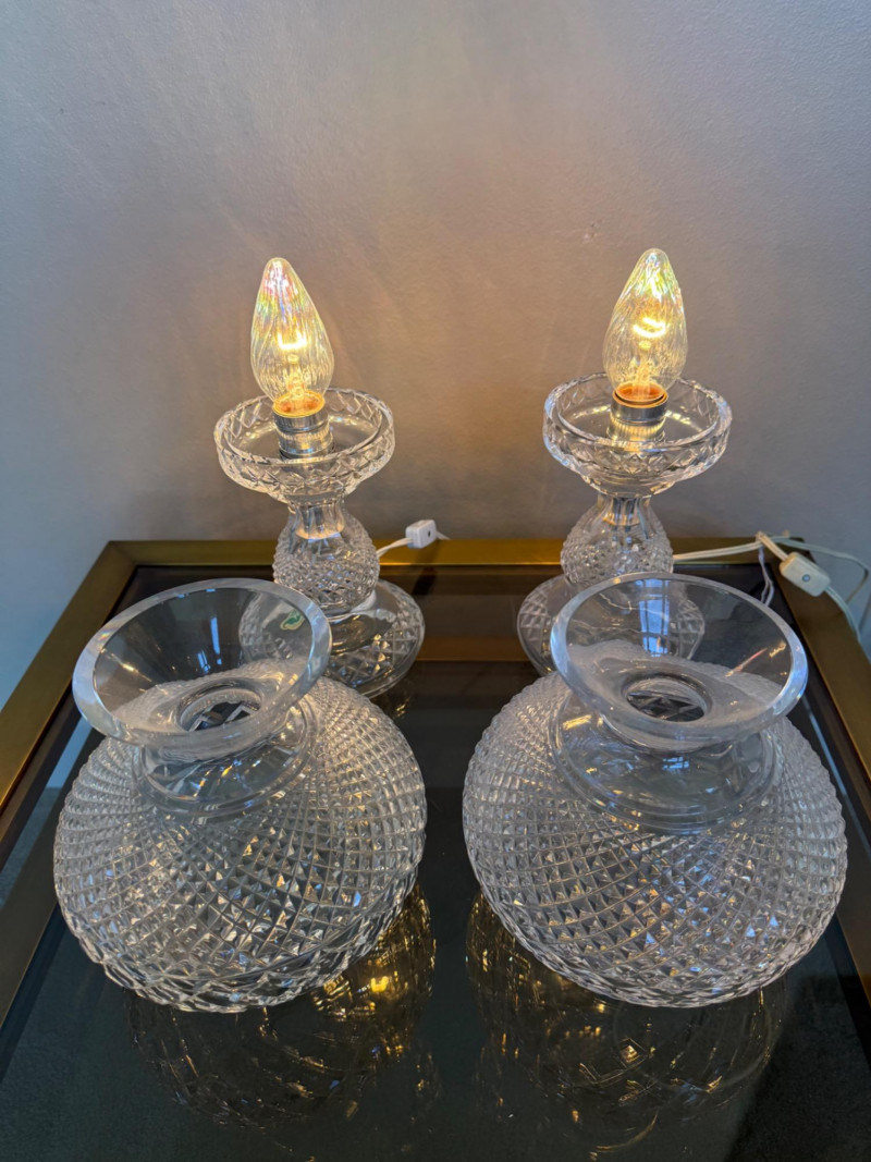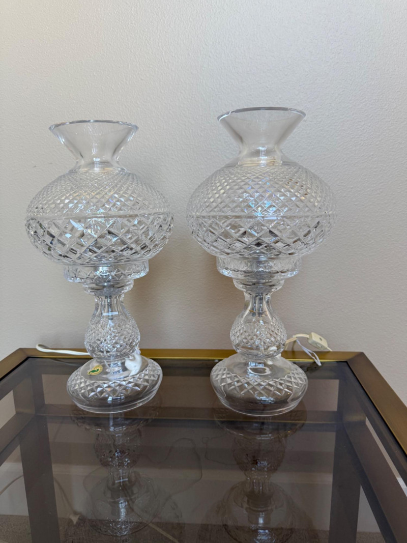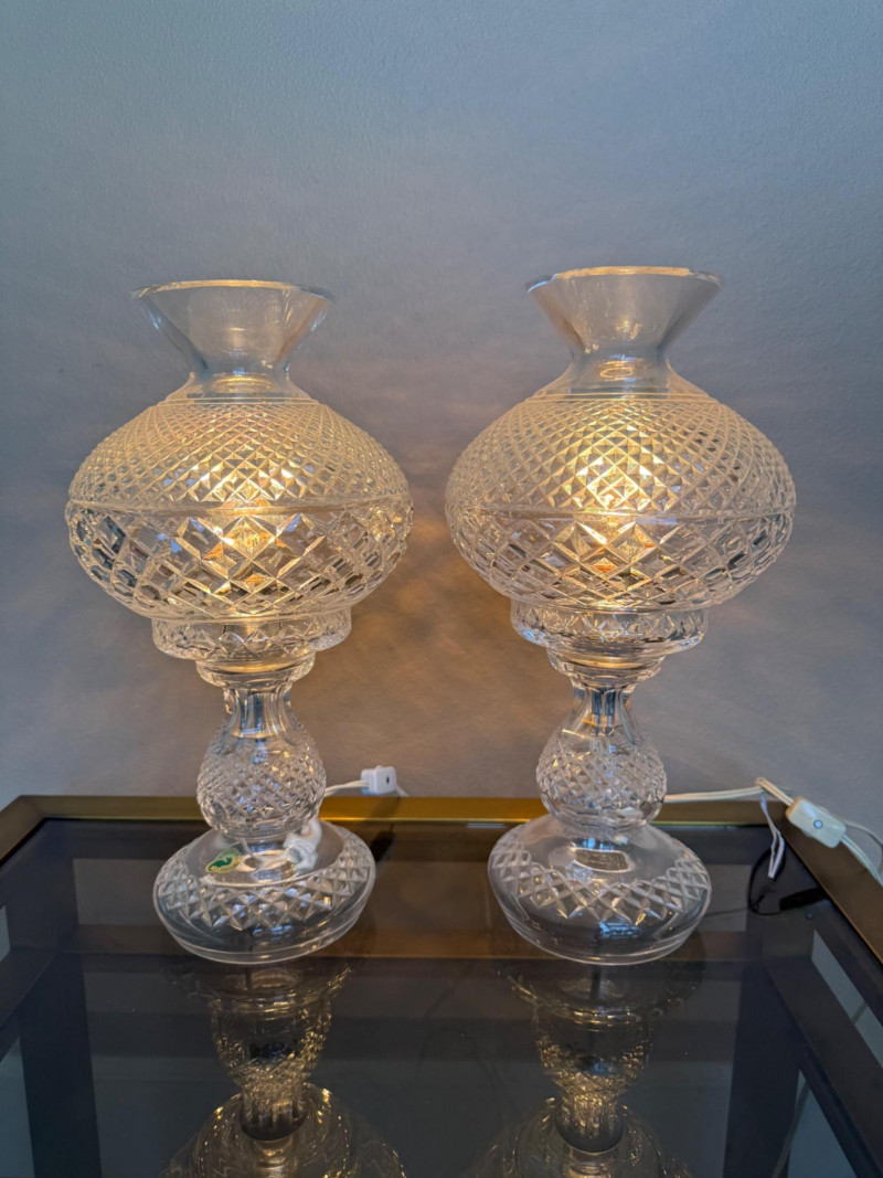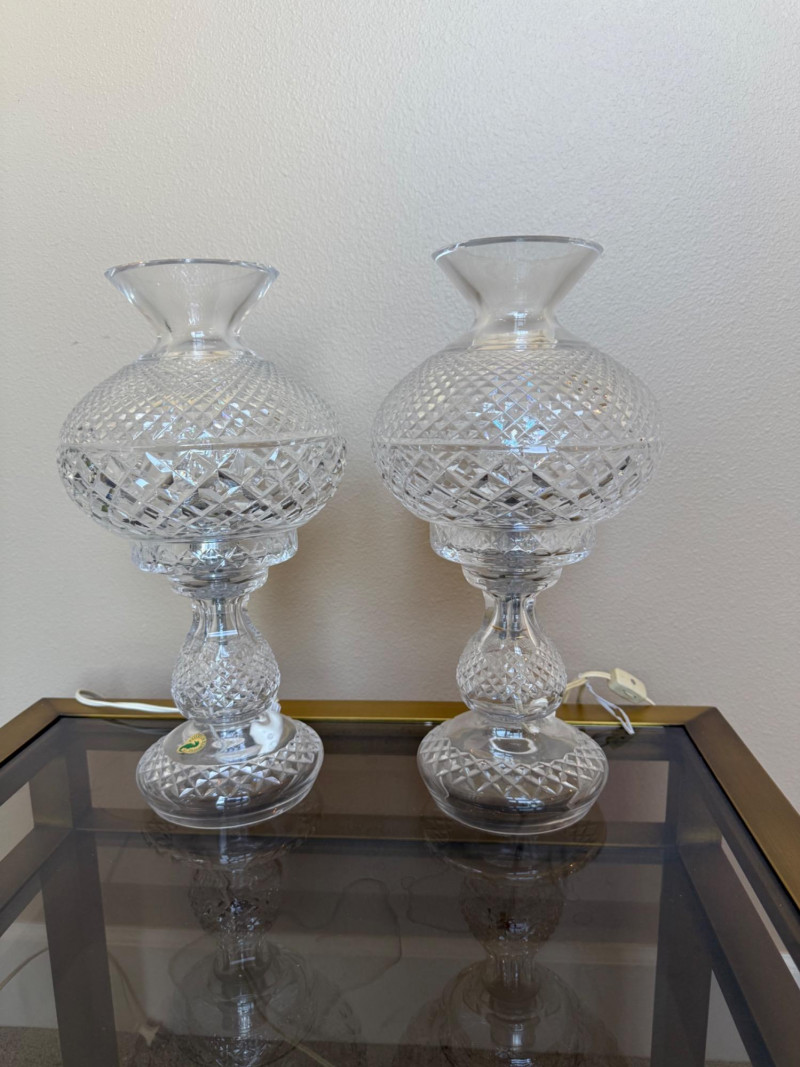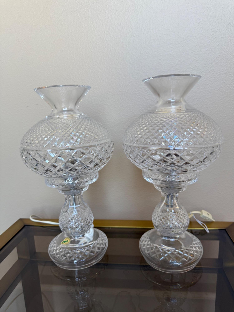 Waterford Inishmaan Crystal Hurricane Lamp Pair #2 Pair of vintage electric hurricane lamps in cut crystal by Waterford. The design features the intricate Alana and Inishmore patterns, with bulbous bases and wide, fluted top chimneys. Each lamp has a fitted socket and electric cord. Waterford acid-etched mark visible on the base. Measurements: Condition: